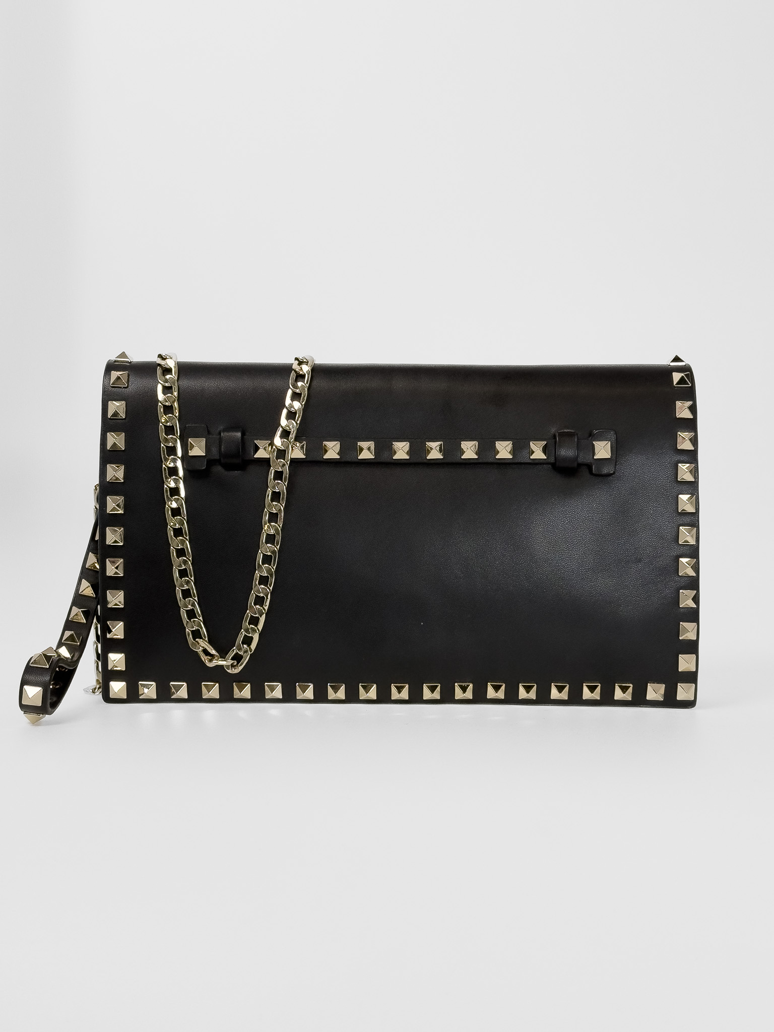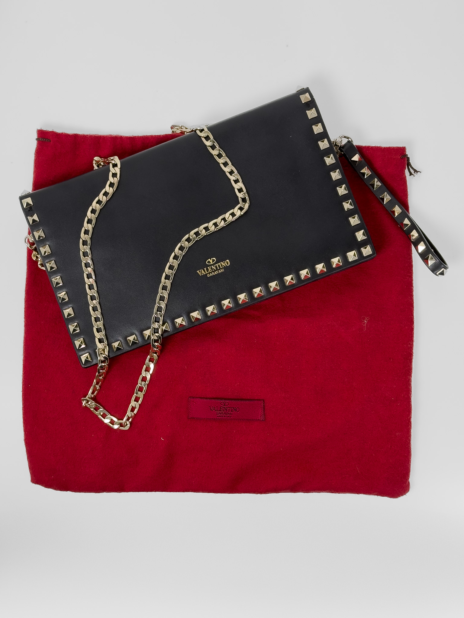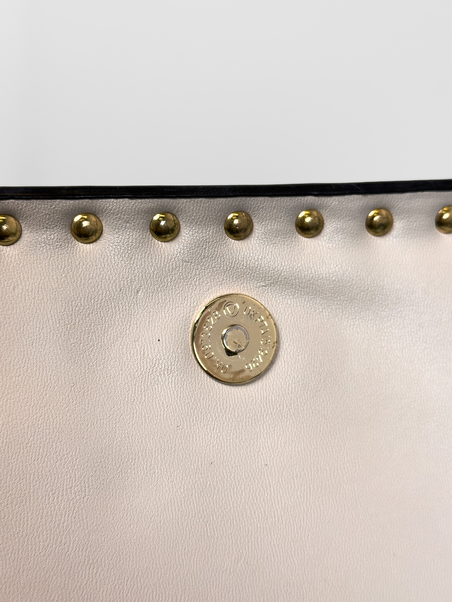 "Czarna skórzana kopertówka/ torebka na ramię, ozdobiona złotymi ćwiekami, prostokątny kształt, ciężka, dwa uchwyty na dłoń, długi złoty odpinany łańcuchowy pasek na ramię, złote wytłaczane logo marki na przodzie, zapinana na zapięcie magnetyczne pod klapą, trzy komory, kremowe wnętrze, w zestawie z workiem przeciwkurzowym. Stan bardzo dobry, posiada delikatne ślady użytkowania oraz niewielkie zabrudzenie klejem od wewnątrz. Wymiary: szerokość 28cm, wysokość 16cm"