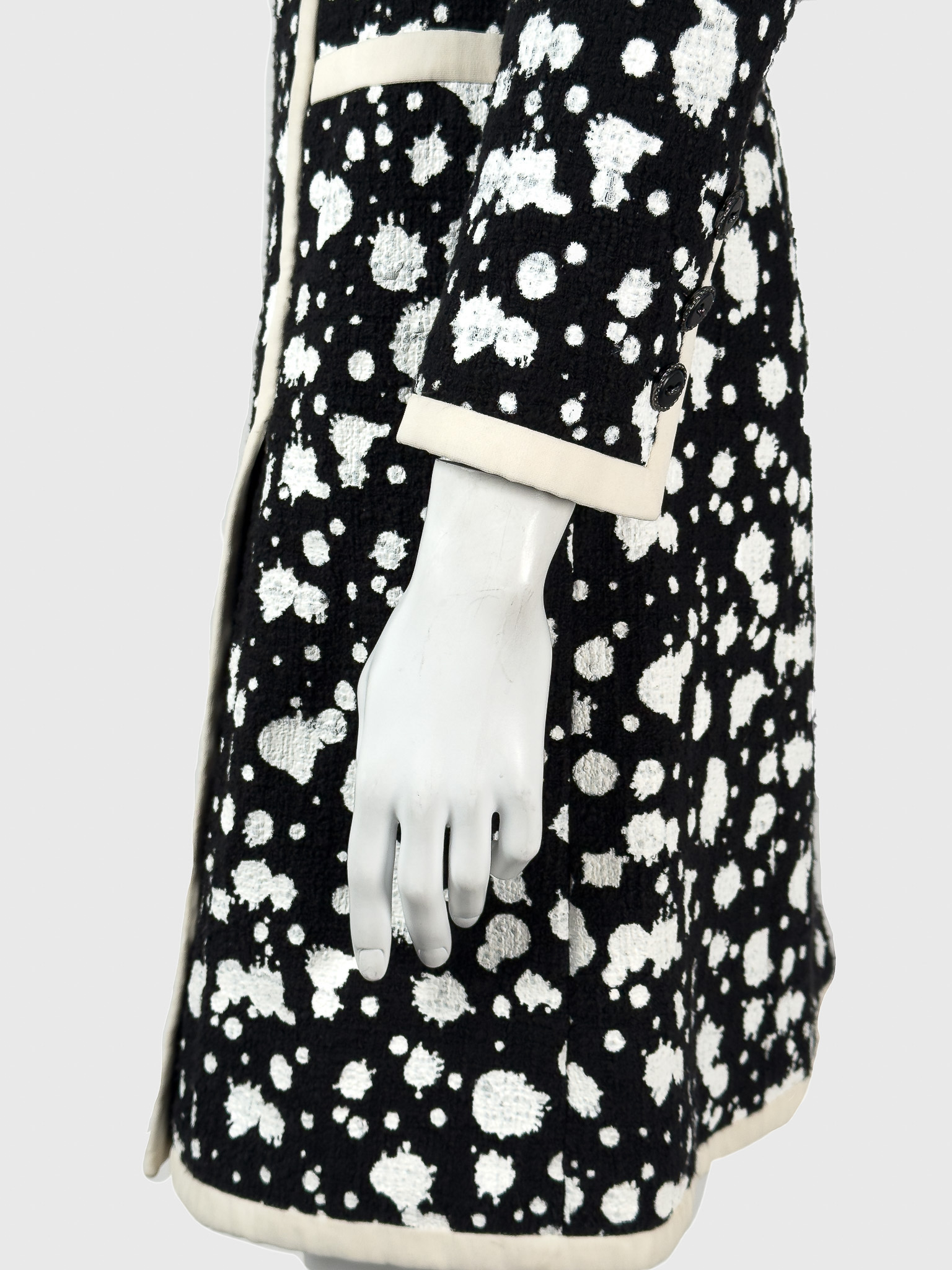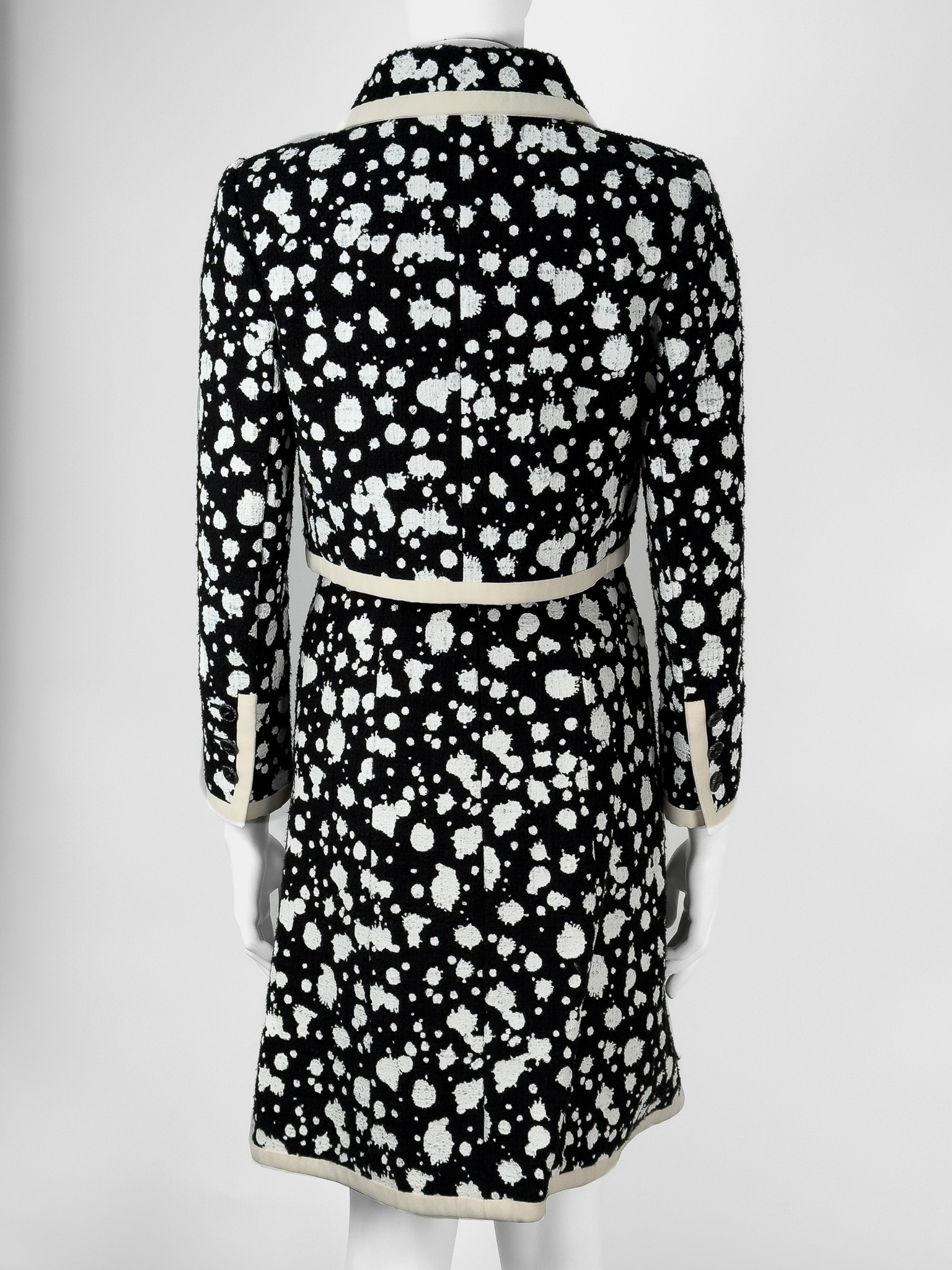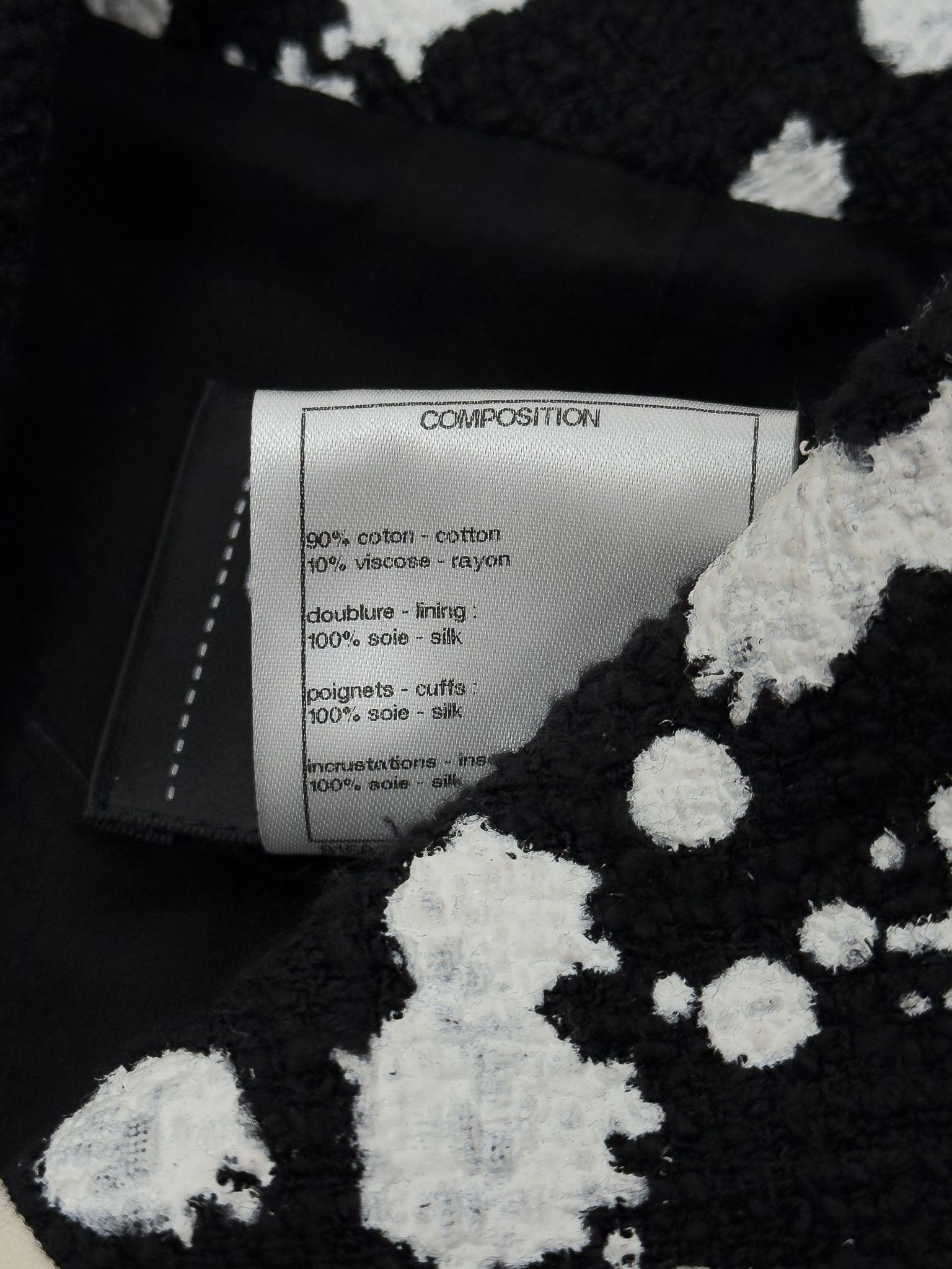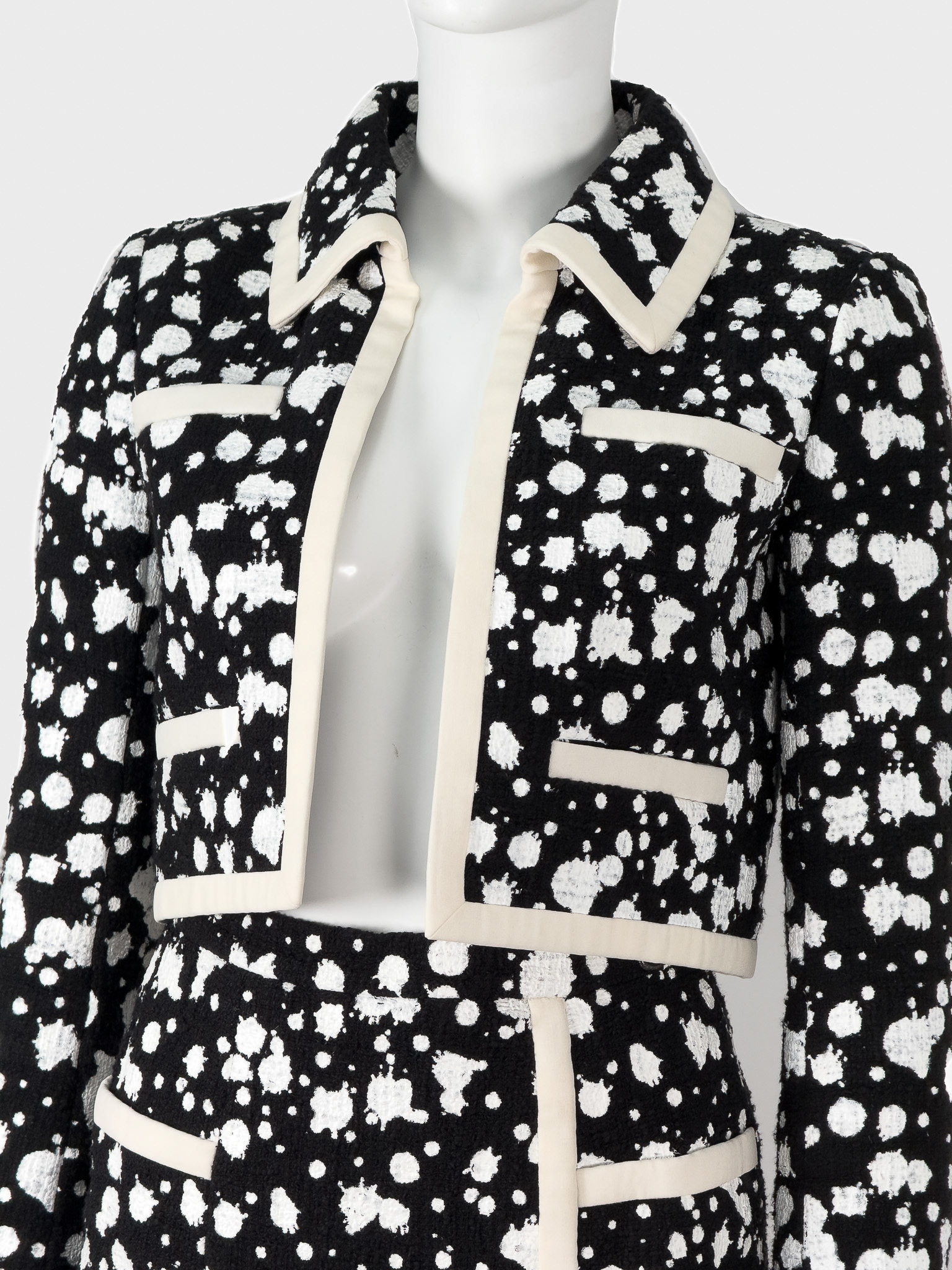 "Komplet: żakiet + spódnica. Czarny komplet we wzór białych plamek, wykończony kremową lamówką. Żakiet o krótszym kroju, niezapinany. Spódnica z wyższym stanem oraz rozporkiem na skos. Rozmiar z metki FR 34. Skład: 90% bawełna, 10% wiskoza, podszewka: 100% jedwab. Stan: bardzo dobry. Kolekcja SS2015. Wymiary żakietu: szerokość mierzona od pachy do pachy 44cm, długość całkowita 39cm; wymiary spódnicy: szerokość w pasie 32cm, długość całkowita 59cm."