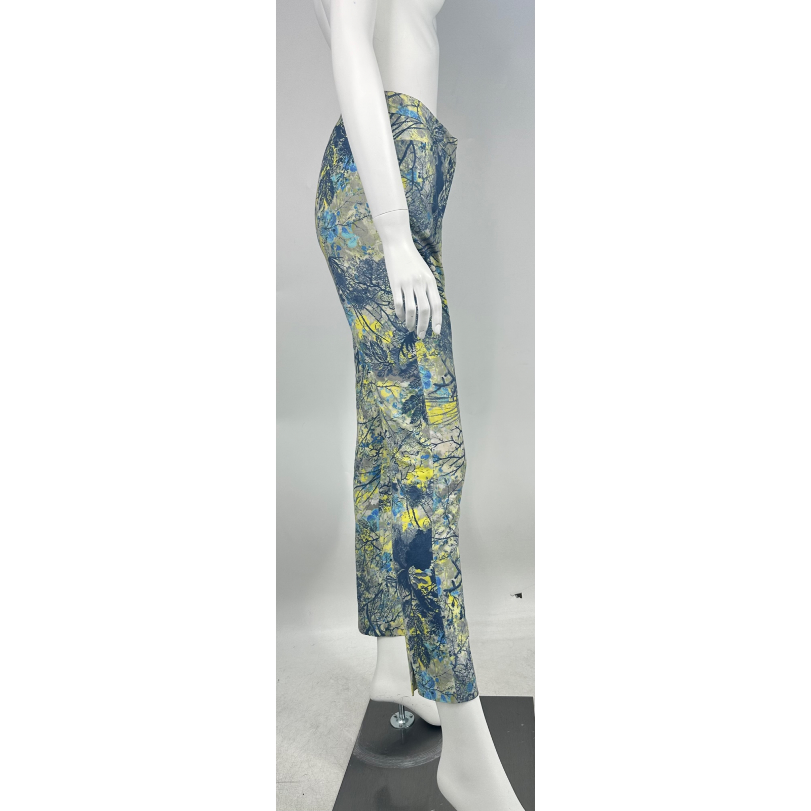 "komplet spodnie i koszula, koszula jedwabna: limonkowa w kwiaty, kołnierzyk, rozmiar z metki UK8, skład: 100% jedwab, spodnie: niebiesko/limonkowe w kwiaty, metalowe zapięcie, rozmiar UK8, skład: 50% wiskoza, 47% bawełna, 3% elastan. Wymiary: koszula szer. ramion 41 cm, szer. biustu 45 cm, szer. talii 46 cm, dł. całkowita 63 cm, dł. rękawa 58 cm, spodnie: szer. talii 37 cm, szer. bioder 42 cm, dł. całkowita 95 cm."