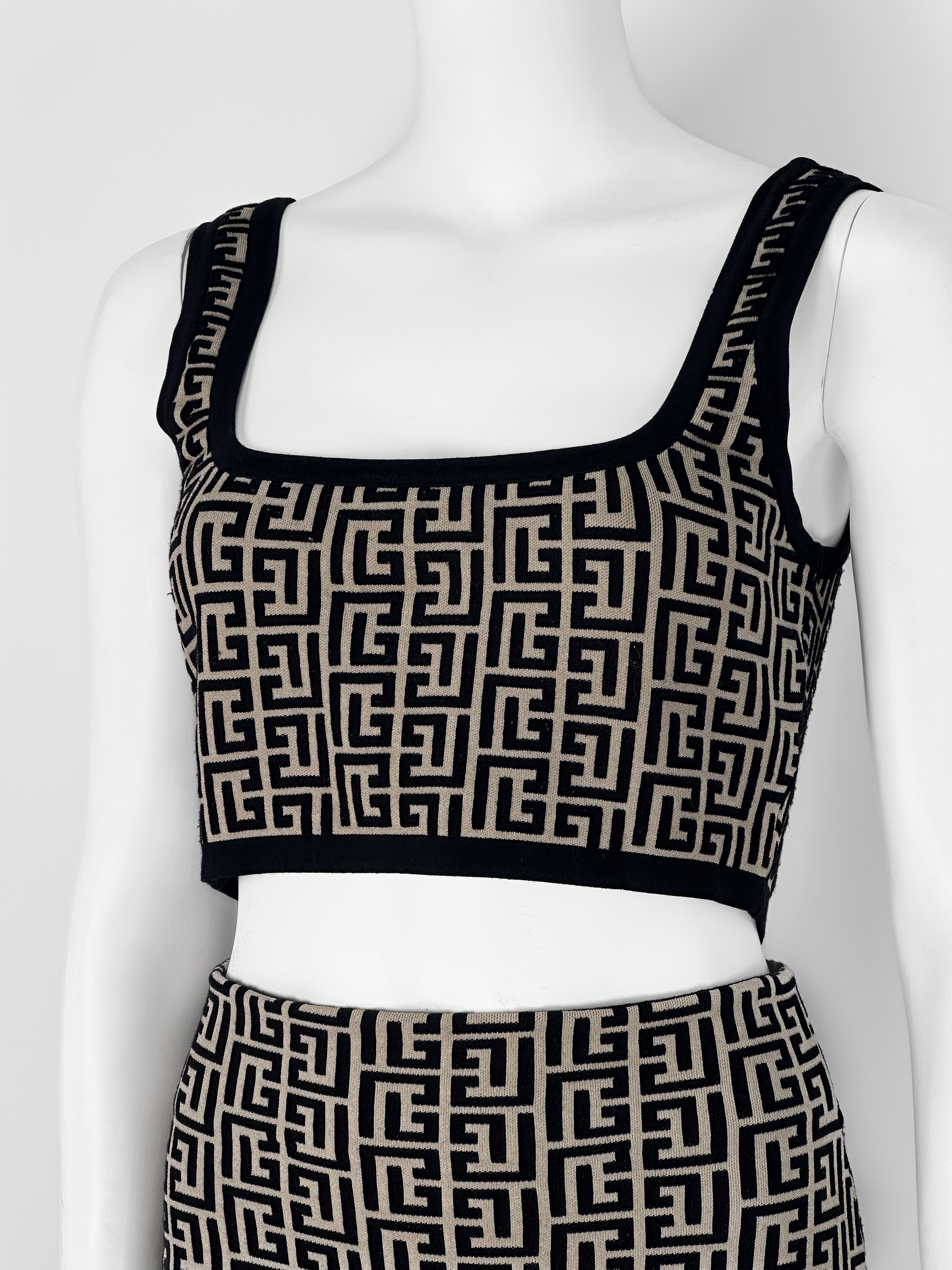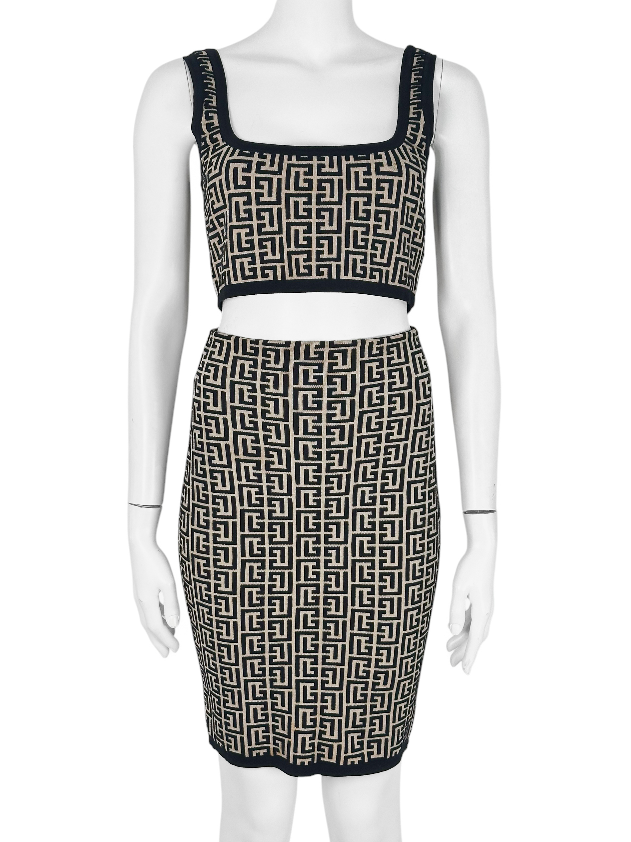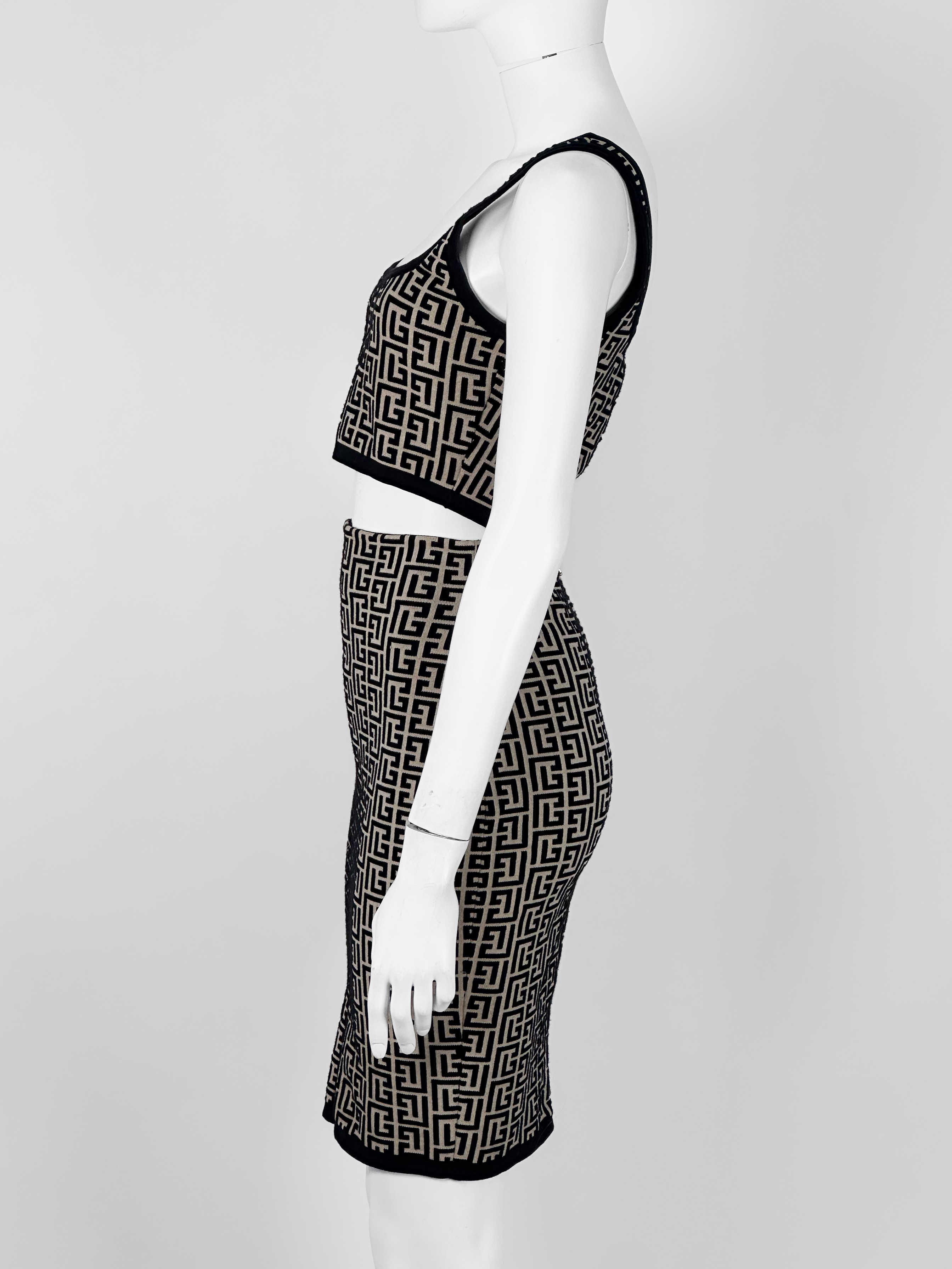 "Beżowo-czarny dopasowany komplet w monogram marki, top + spódnica; Krótki top na ramiączkach wykończony czarną lamówką, ołówkowa spódnica, długość przed kolano, zapinana w tylnej części na dwa złote logowane suwaki. Stan bardzo dobry. Rozmiar topu IT 36, rozmiar spódnicy IT 34. Skład topu: 56% wełna dziewicza, 22% wiskoza, 21% poliamid, 1% elastan; skład spódnicy: 55% wełna dziewicza, 24% wiskoza, 19% poliamid, 2% elastan. Wymiary topu: szerokość mierzona od pachy do pachy 41cm, długość całkowita 37cm; wymiary spódnicy: szerokość w pasie 30cm, długość całkowita 55cm."