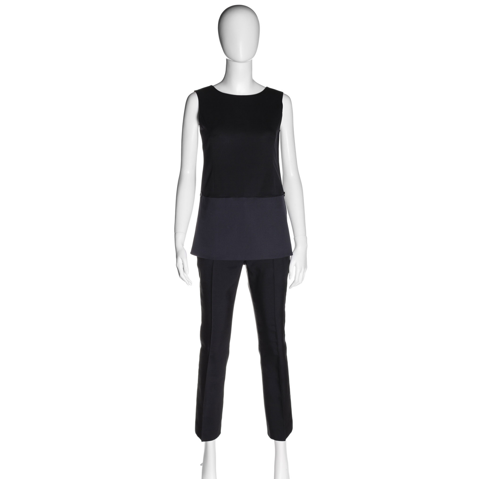 "Czarny komplet spodnie proste w kant (34 ,skład 72% wełna 28% jedwab)+ top(rozm 34, 100% wełna) bez rękawów, z guzikami po bokach i kieszeniami na przodzie. Wymiary spodni: pas 36 cm. biodra 46 cm. długość całkowita 94 cm. Wymiary top: pas 38 cm. biust 42 cm. dł. całkowita 67 cm."