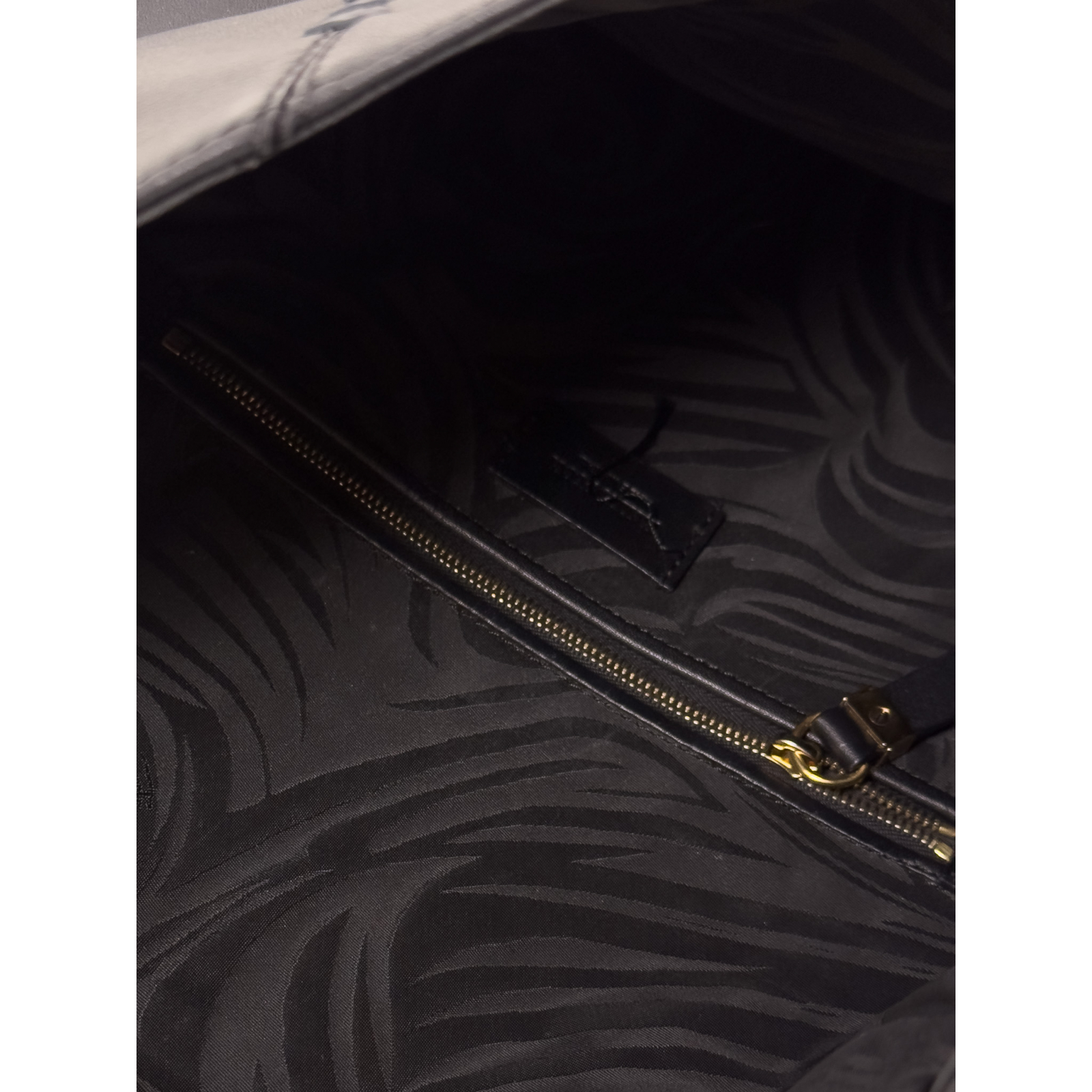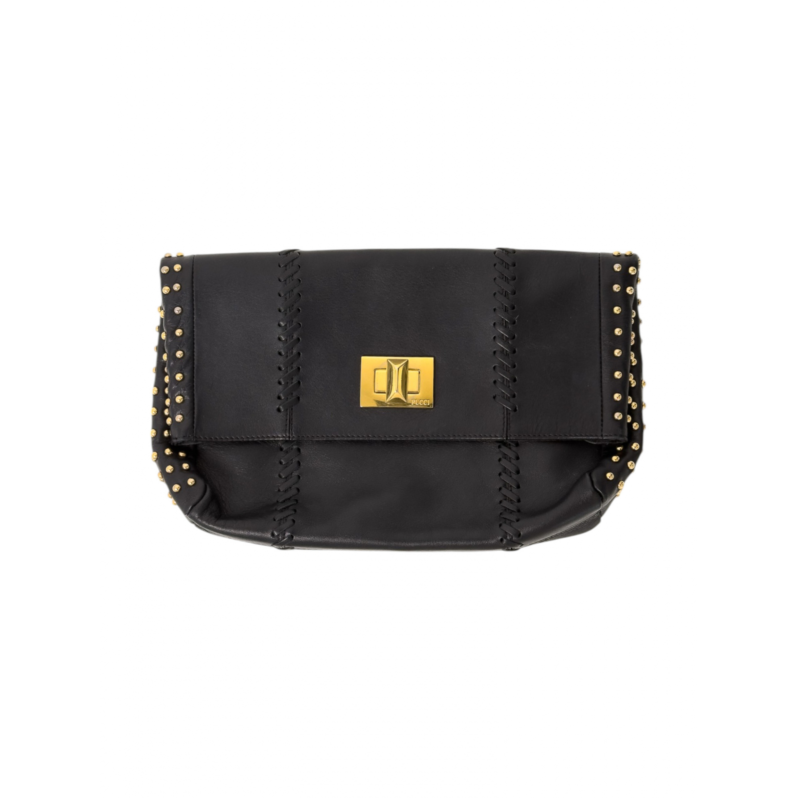 "Czarna skórzana duża kopertówka, ozdobiona złotymi dżetami oraz pleceniem, złote przekręcane zapięcie z logo marki na przodzie, miękka skóra, prostokątny kształt, jedna komora z kieszenią wewnątrz, w zestawie z workiem przeciwkurzowym. Stan dobry, posiada przetarcia na rogach, ślady użytkowania na metalowych elementach. Wymiary: szerokość 28cm, wysokość 23cm."