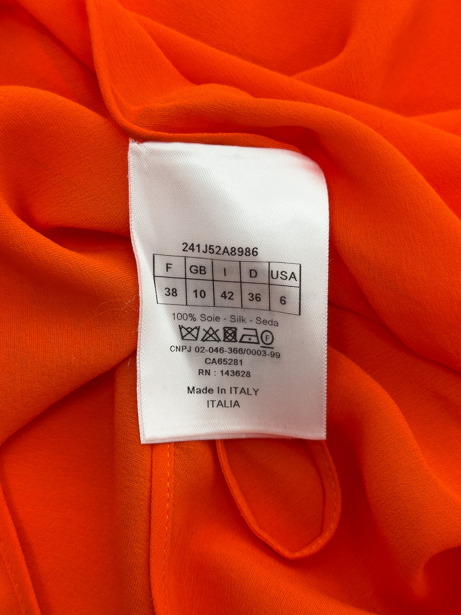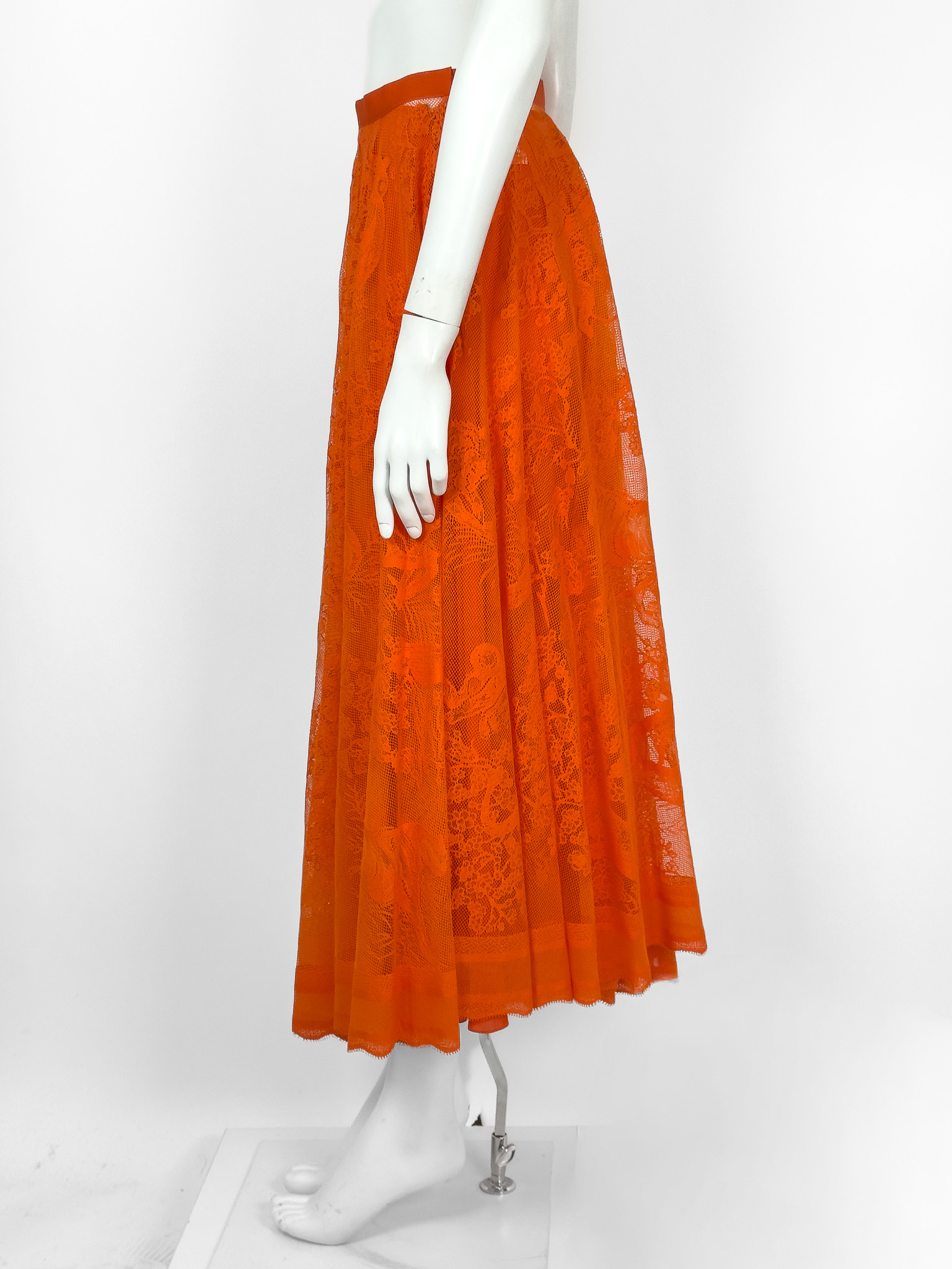 "Kolekcja: Dioriviera capsule 2022. Pomarańczowa, koronkowa spódnica, długość za kolano, posiada halkę. Rozmiar z metki: IT42. Skład: 75% bawełna, 25% poliamid. Stan: bardzo dobry. Wymiary: szerokość w pasie 35cm, długość całkowita 90m."