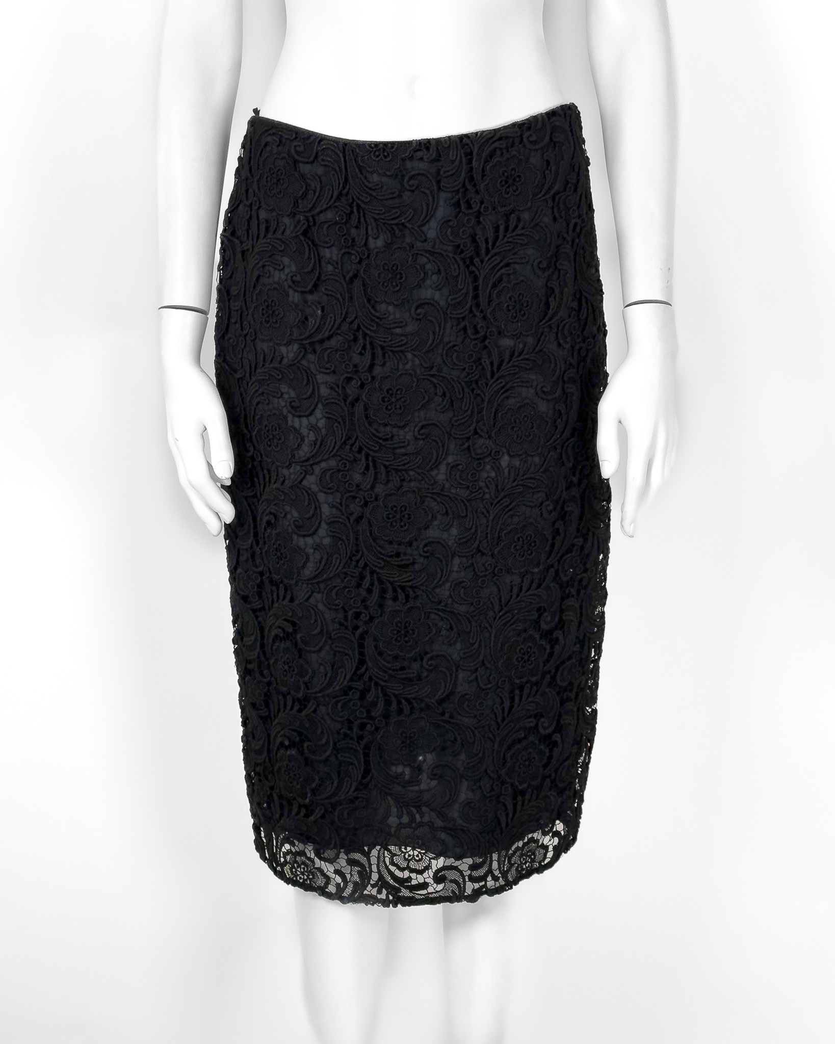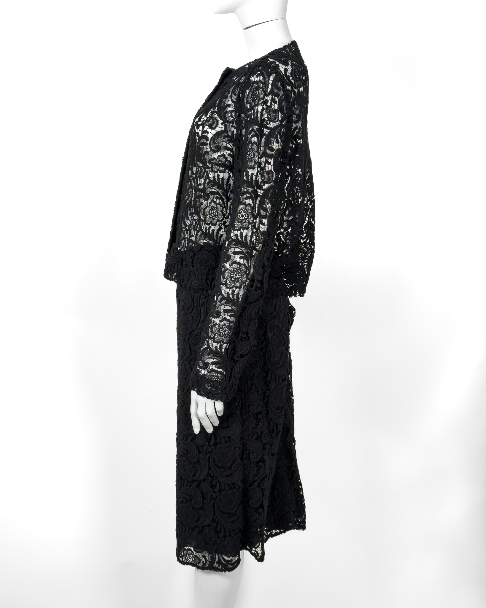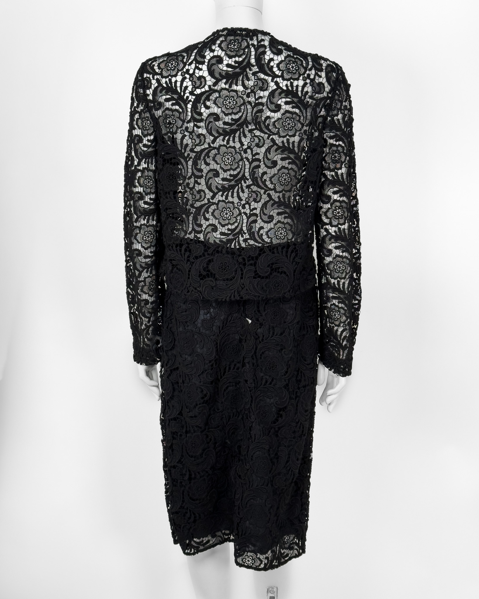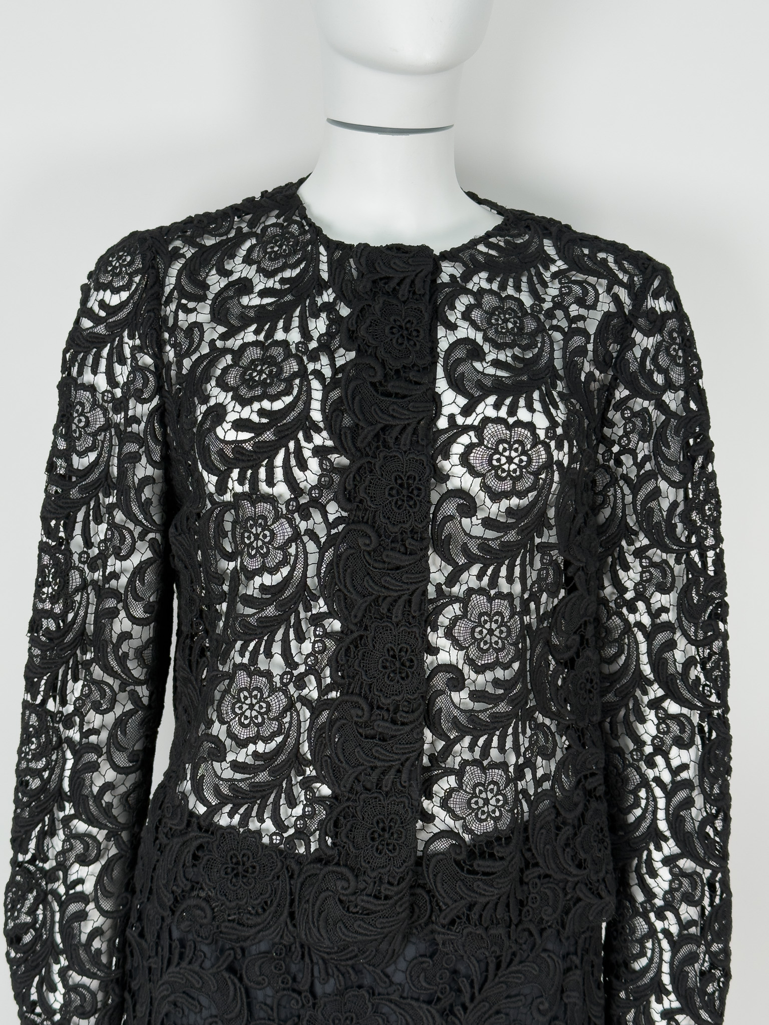 "Czarny, koronkowy komplet: spódnica i bolerko. Bolerko zapinany na kryte zatrzaski. Spódnica długość za kolano. Rozmiar z metki IT 44. Skład: 90% bawełna. 10% poliester. Stan bardzo dobry. Wymiary bolerka: szerokość mierzona od pachy do pachy 53cm, długość całkowita 55cm; wymiary spódnicy: szerokość w pasie 38cm,  długość całkowita 79cm."