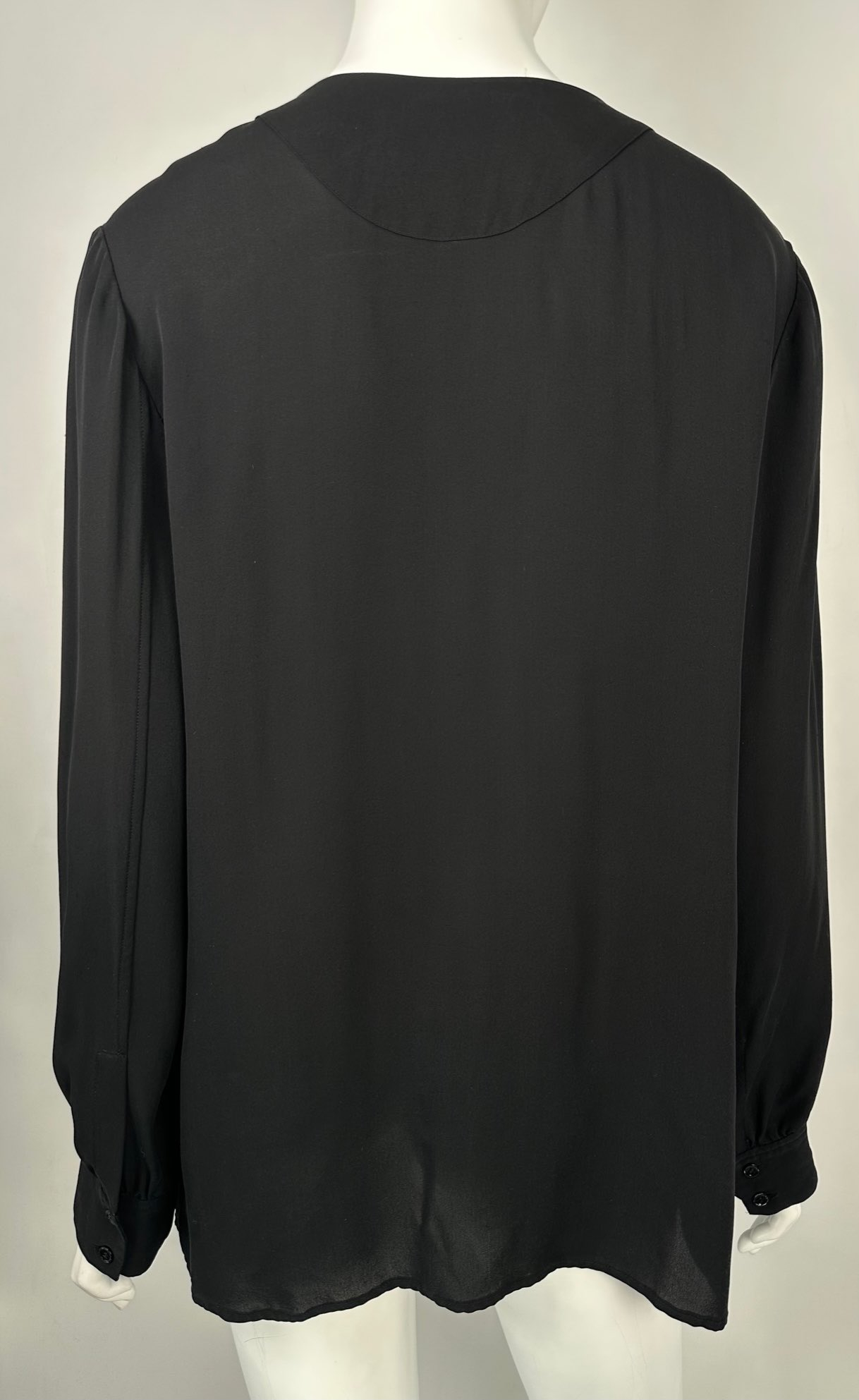 "czarna bluzka koszulowa, kieszenie na wysokości biustu, roz. L, skład: 100% jedwab. Wymiary: szer. ramion 38 cm, szer. biustu 50 cm, szer. talii 51 cm, dł. całkowita 68 cm, dł. rękawa 63 cm."