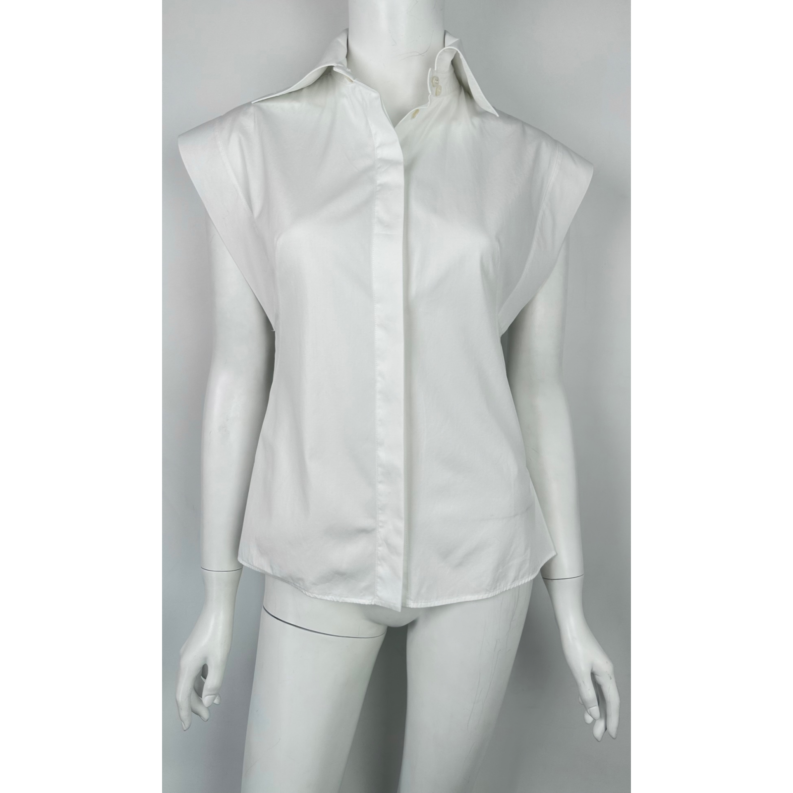 "biała koszulowa bluzka bez rękawów, z kołnierzem, zapinana z przodu na kryte guziki, taliowana. Rozmiar IT 40. Skład: 100% bawełna. Wymiary: dł. całkowita 67cm, szer. ramion 48cm, szer. w biuście 42cm."