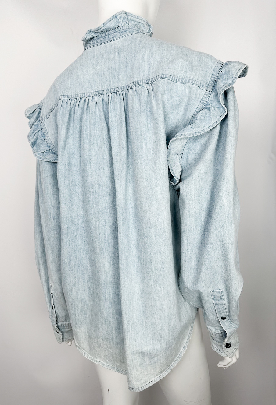 "Jasnoniebieska koszula jeansowa ozdobiona falbaną na przodzie, ramionach oraz przy dekolcie, zapinana na kryte czarne guziki oraz jeden widoczny przy szyi, rozpinane mankiety, zaokrąglony dół, marszczona na plecach i ramionach. Rozmiar z metki EU 36. Skład: 100% bawełna. Wymiary: szerokość mierzona od pachy do pachy 55cm, długość rękawa 64cm, długość całkowita 68cm."