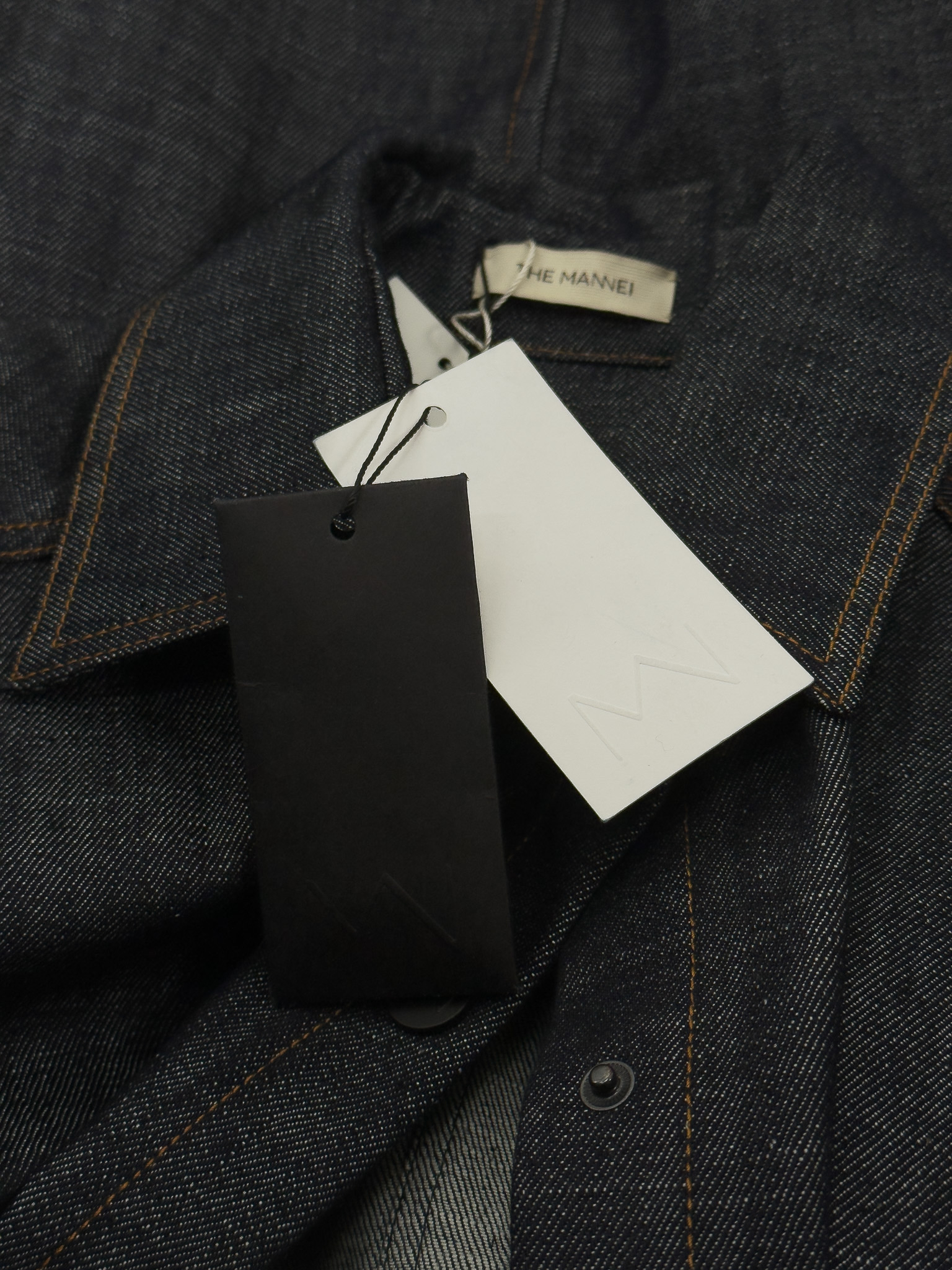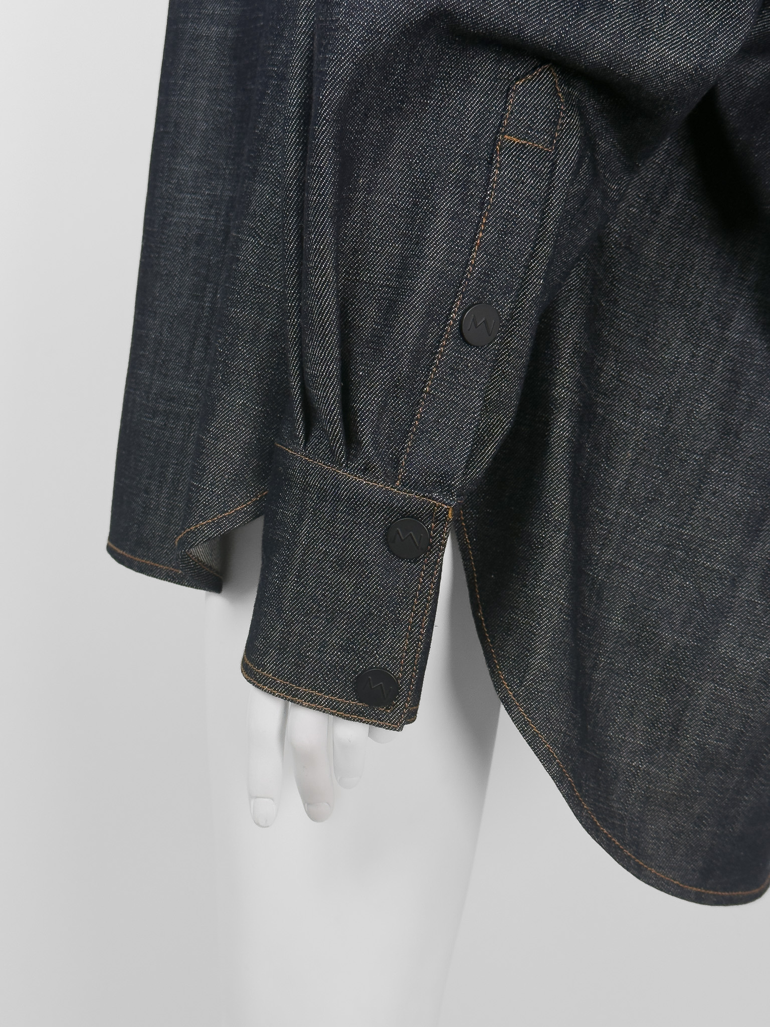 "Bilboa Shirt denim blue; Oversizowa koszula z grubego denim, w kolorze ciemnego granatu, przedłużony tył, wykończona musztardową nitką, kołnierzyk, zapinana na czarne logowane zatrzaski, duża kieszeń w okolicy biustu. Stan nowa z metką. Rozmiar z metki 36. Skład: 100% bawełna. Wymiary: szerokość mierzona od pachy do pachy 64cm, długość całkowita 74cm."