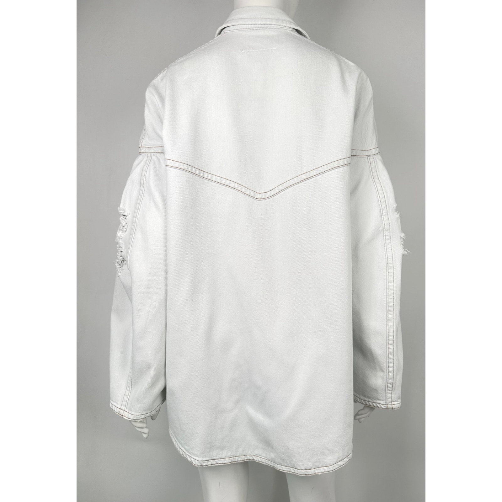 "biała jeansowa koszula oversize, zapinana z przodu na guziki, długi rękaw z przetarciami na ramionach, pomarańczowe przeszycia. Rozmiar 40. Skład: 100% bawełna. Wymiary: szer. ramion 62 cm, szer. biustu 54 cm, szer. talii 62 cm, dł. całkowita 77 cm, dł rękawa 48 cm."