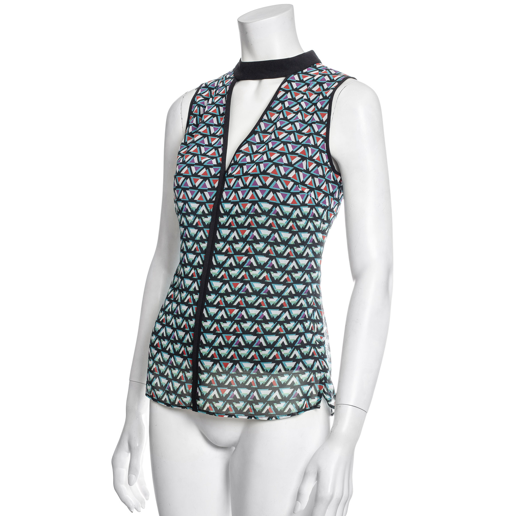 "bluzka bez rekawów czarna w kolorowe trójkąty, stójka, łezka z tyłu, trójkątny wycięty dekolt"