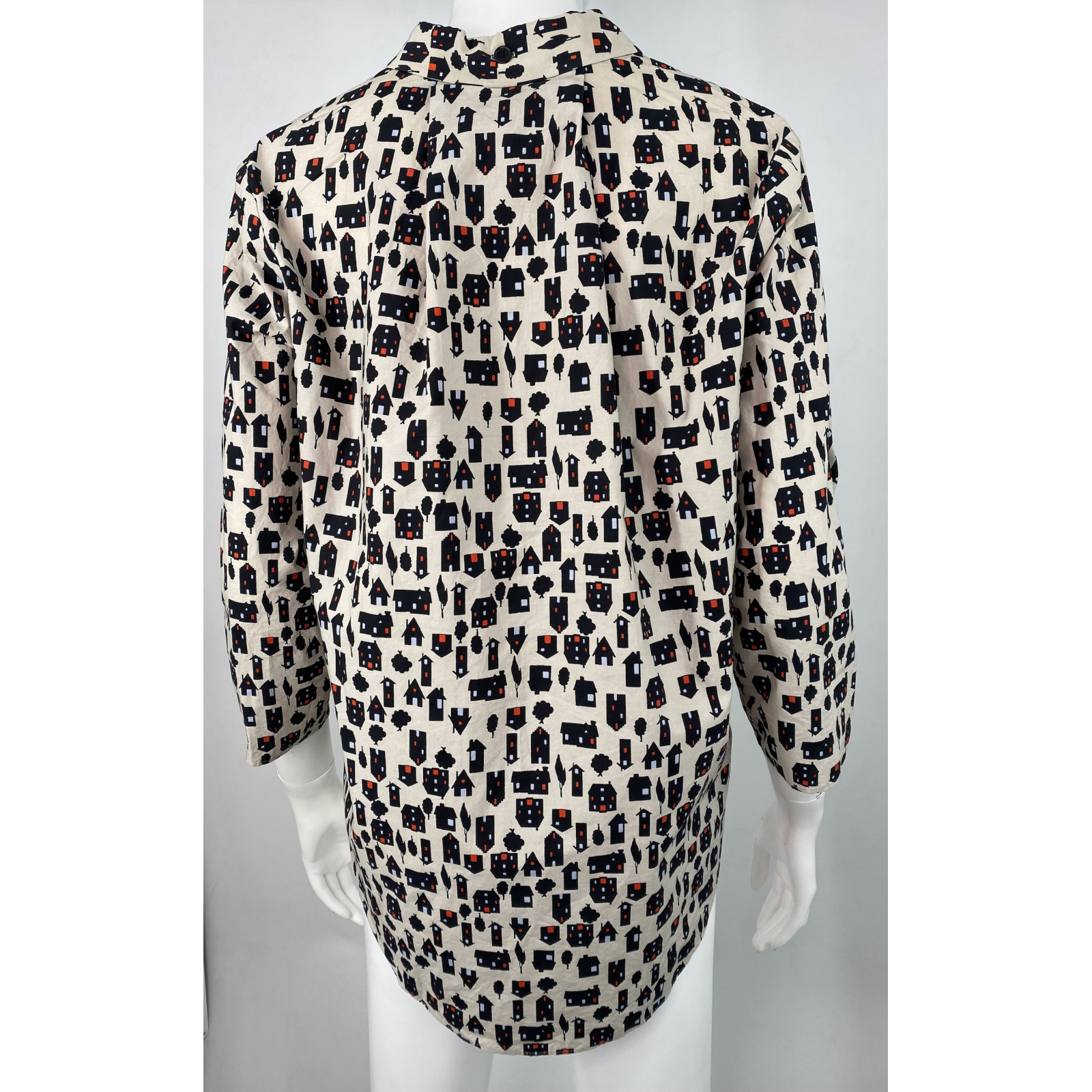 "beżowa koszula cała we wzorki imitujące czarne domki z czerowno- białymi akcentami, wycięta metka ze składem i rozmiarem. Wymiary: dł. przód 57 cm, dł. tył 68cm, szer. biust 50 cm"