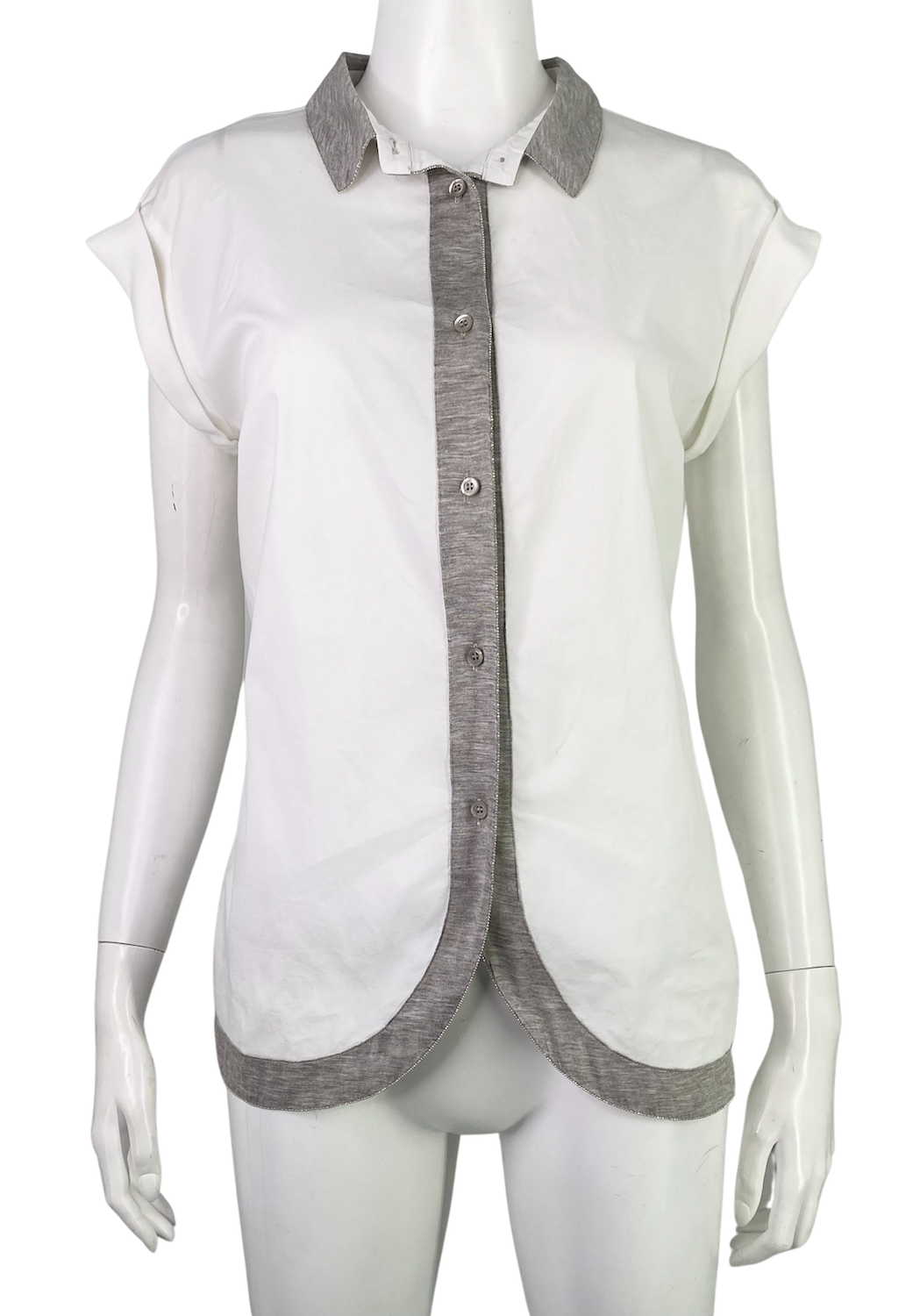 "biała bluzka/ koszula z kołnierzykiem, zapinana na guziki, tył z materiału prążkowanego, krótki rękaw. Kołnierzyk i lamówka przy guzików szara z srebrnymi koralikami. Rozmiar XL( wypada na mniejszy). Skład: 96% bawełna, 4% elastan. Wymiary: szer. ramion 42 cm, szer. biustu 46 cm, szer. talii 46 cm, dł. całkowita 63 cm."