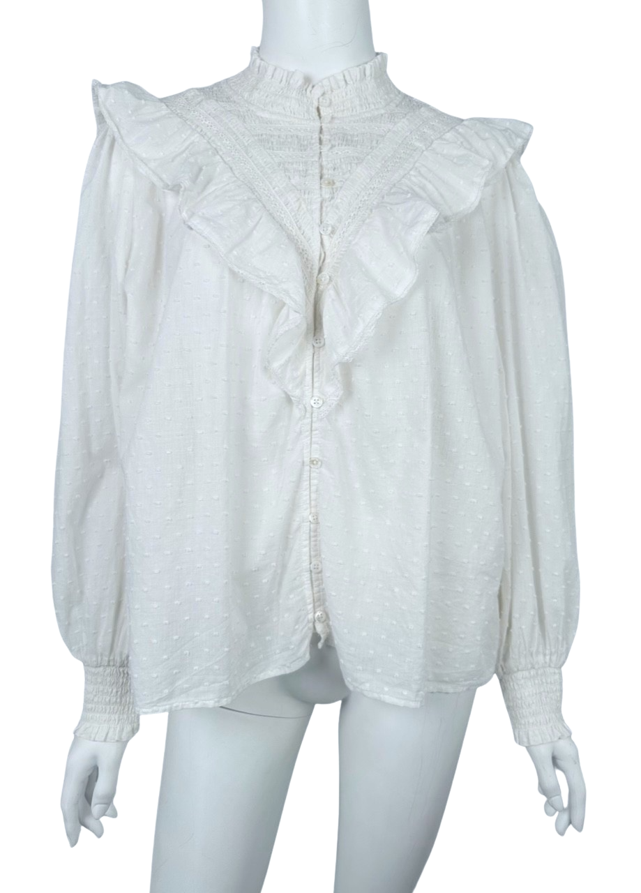 "biała koszula z długim rękawem, zapinana z przodu na guziki, wyszywane małe kropeczki, przód ozdobiony marszczeniami i falbankami. Rozmiar 40. Skład: 100% bawełna. Wymiary: szer ramion 36 cm, szer. biustu 45 cm, szer. talii 52 cm, dł. całkowita 59 cm, dł. rękawa 60 cm."