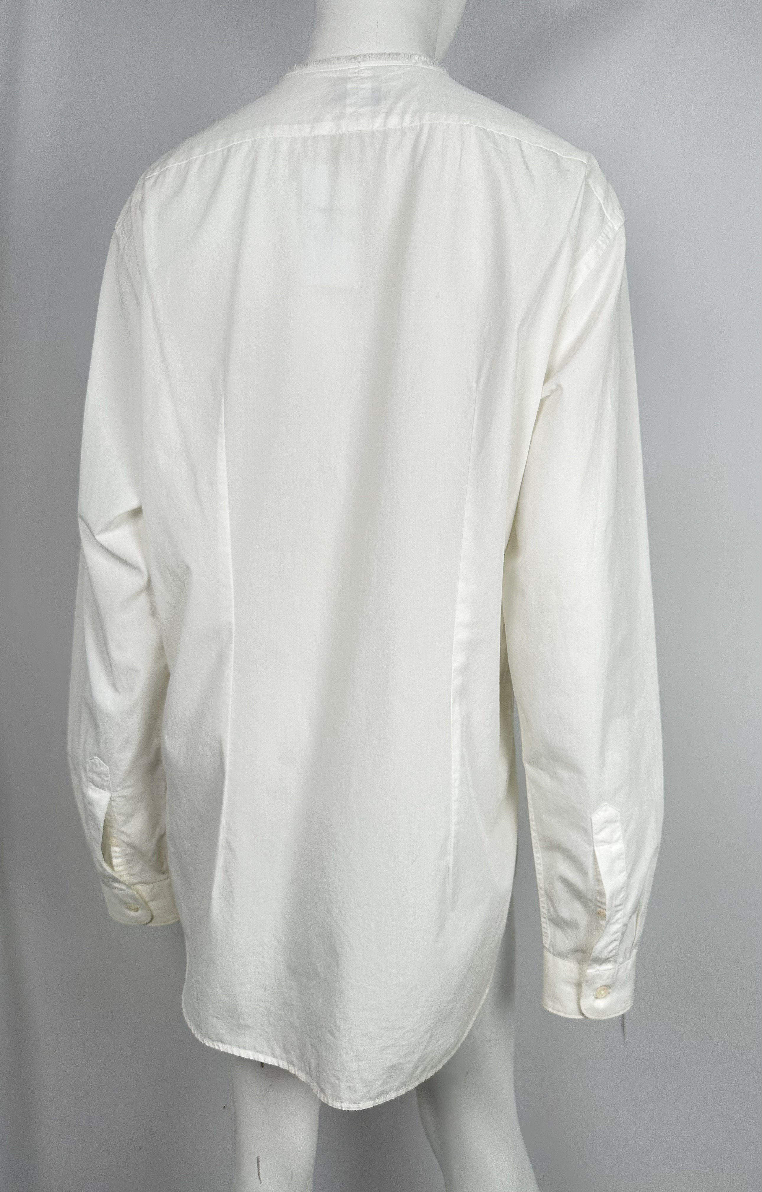 "Biała koszula krój oversize, kryte guziki, bez kołnierzyka. Rozmiar z metki 54. Skład: 100% bawełna. Wymiary: szerokość mierzona od pachy od pachy 56cm, długość całkowita 78cm, długość rękawa 67cm."