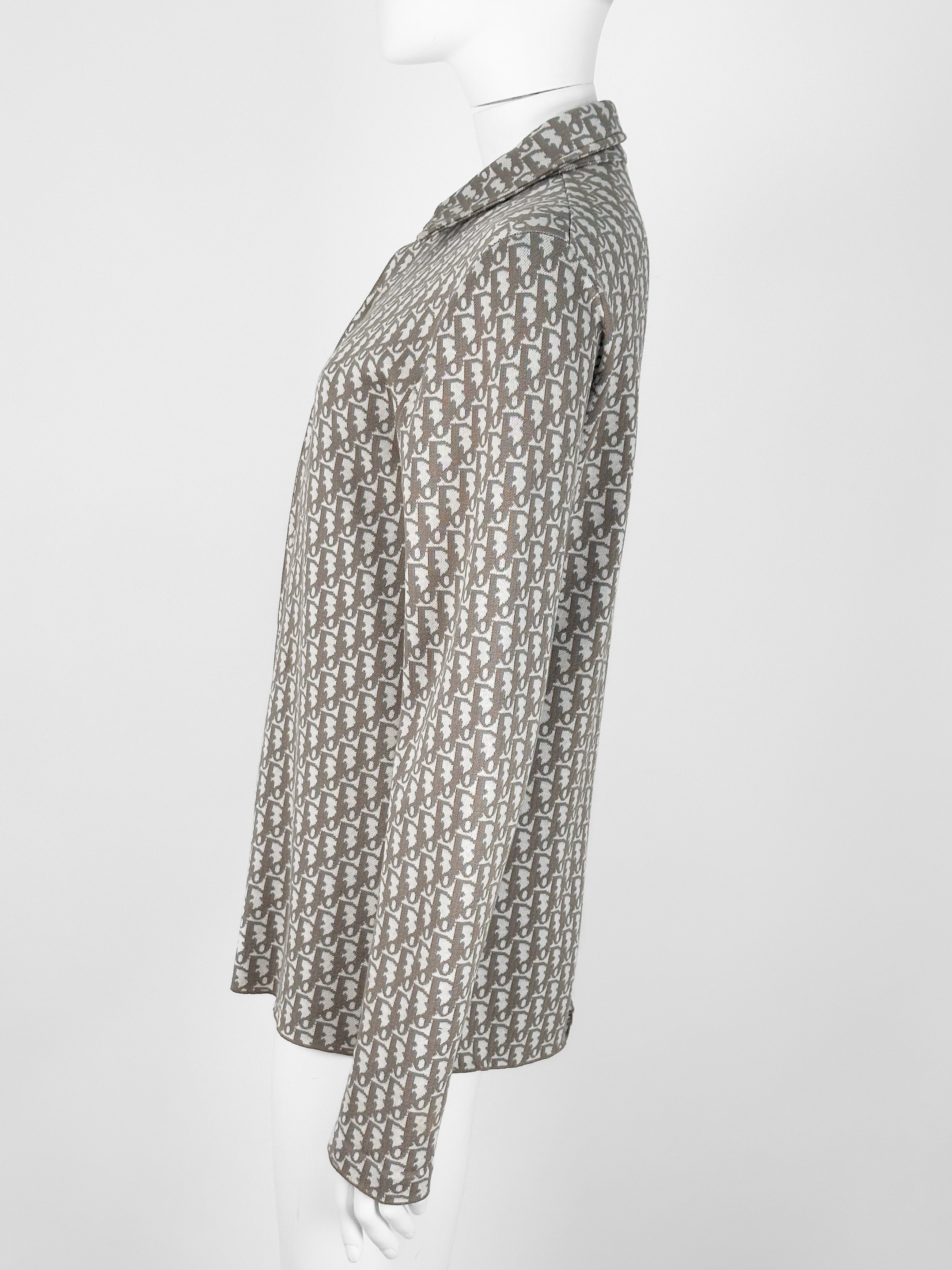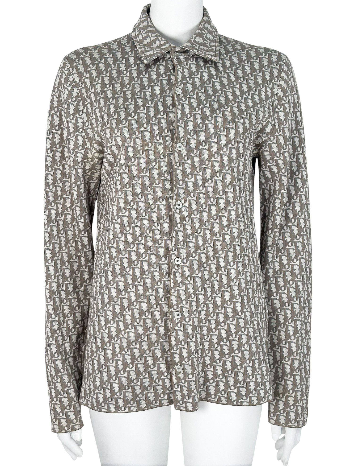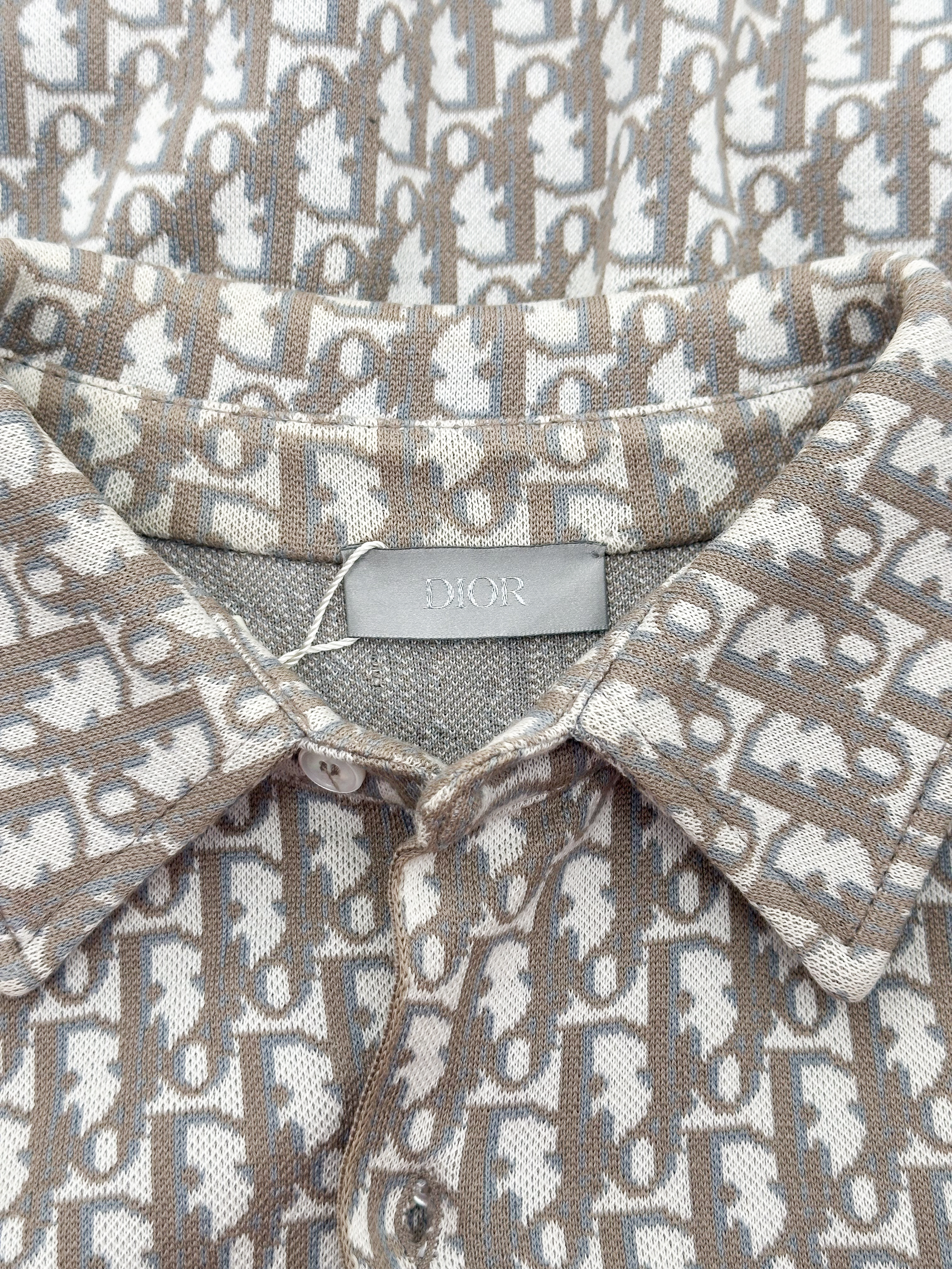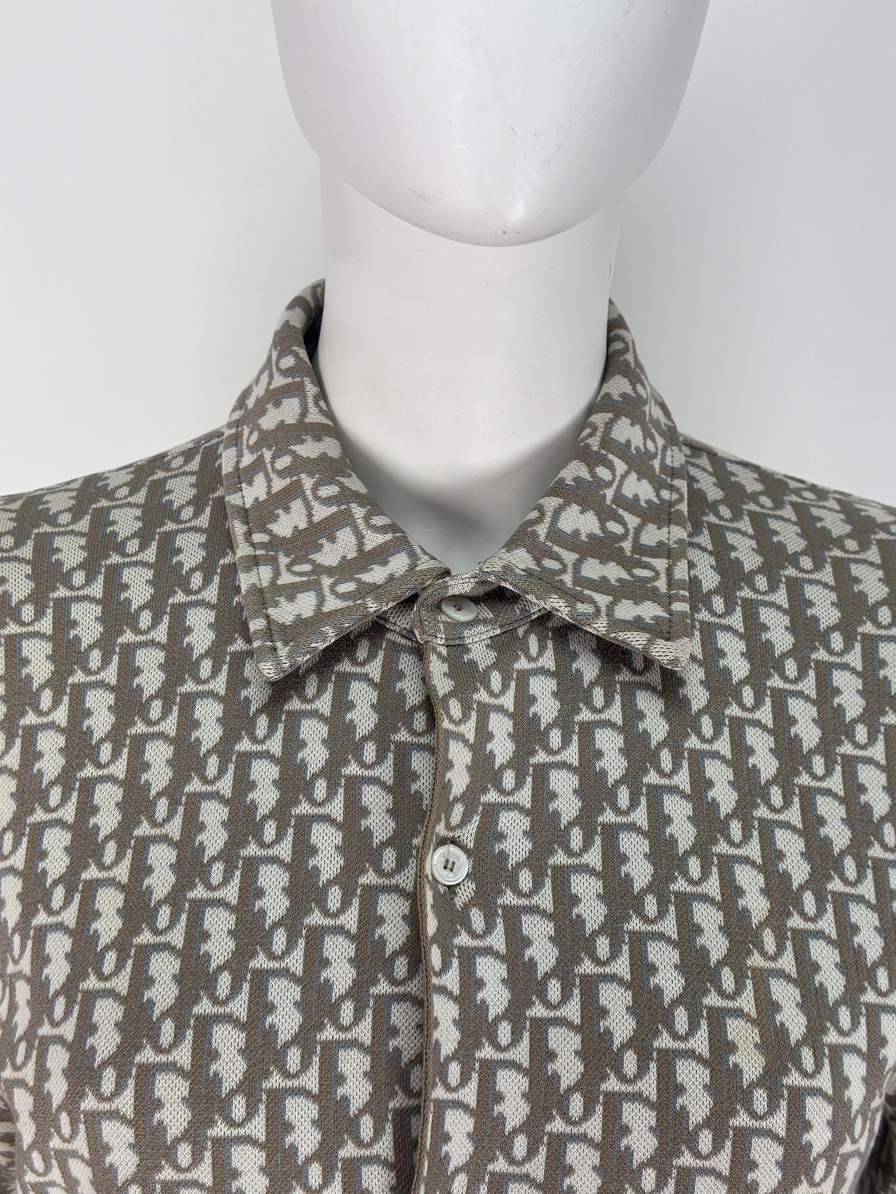 "Beżowa koszula w monogram marki, klasyczny krój, zapinana na guziki, rozmiar z metki XS. Skład: 100 % bawełna. Wymiary: szerokość 48 cm, długość 72 cm."