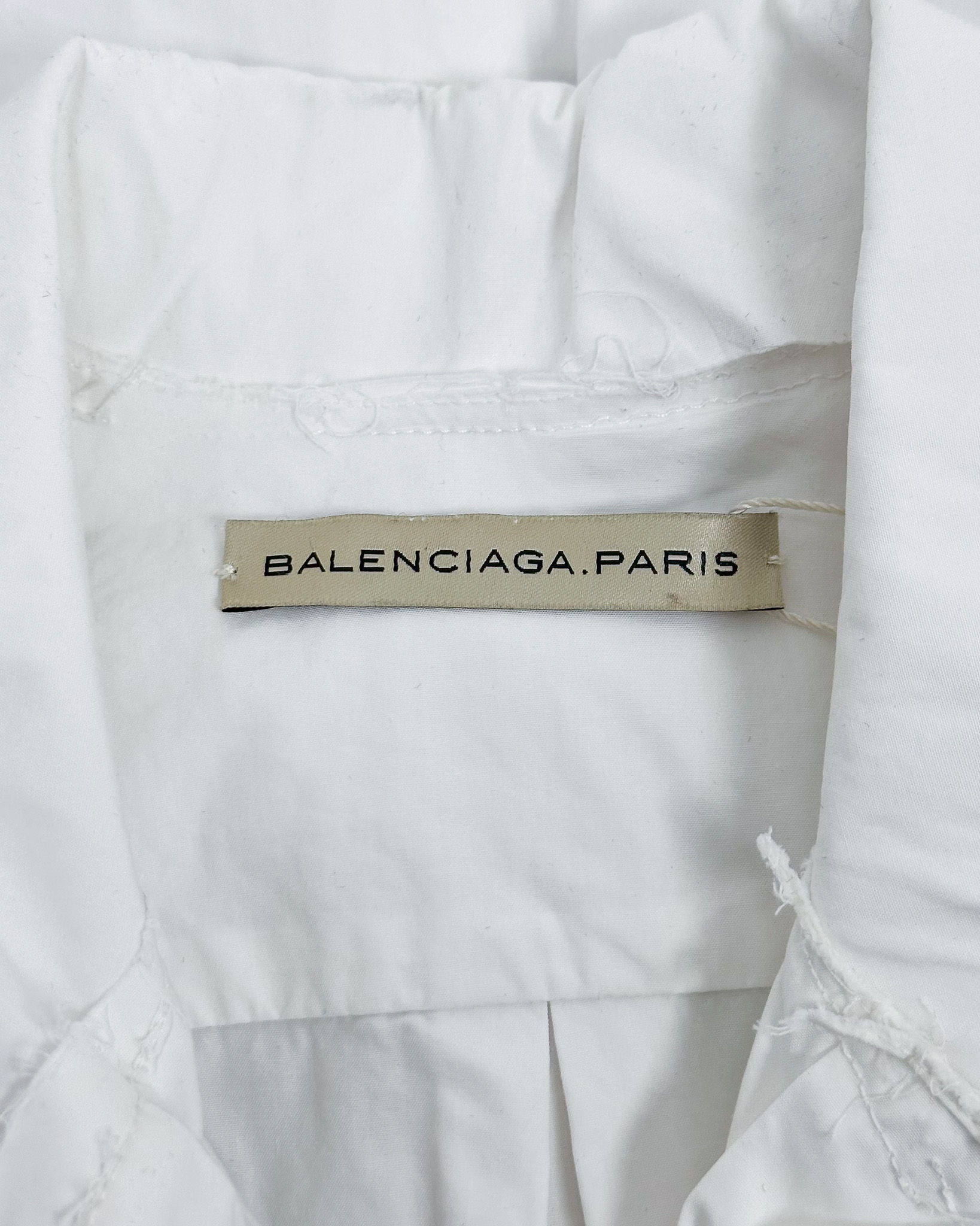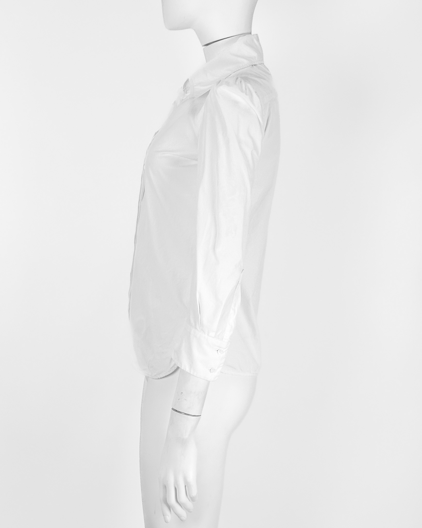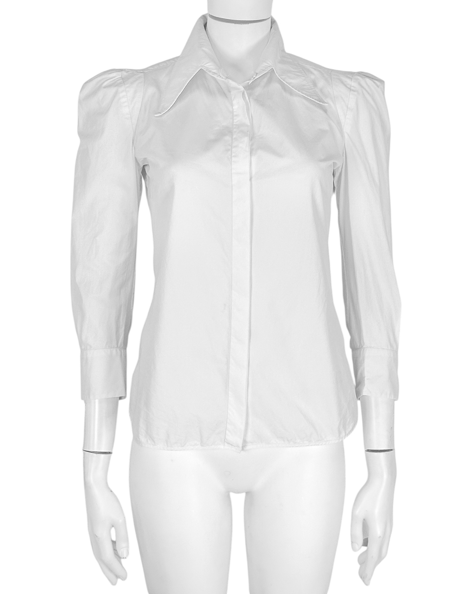 "Biała koszula zapinana na kryte guziki, duży szpiczasty kołnierzyk, bufiaste rękawy, dopasowany krój, taliowana, rozpinane mankiety, delikatne rozcięcia po bokach, zaokrąglony dół. Brak metki ze składem i rozmiarem. Rozmiarowo wypada jak XS/S."