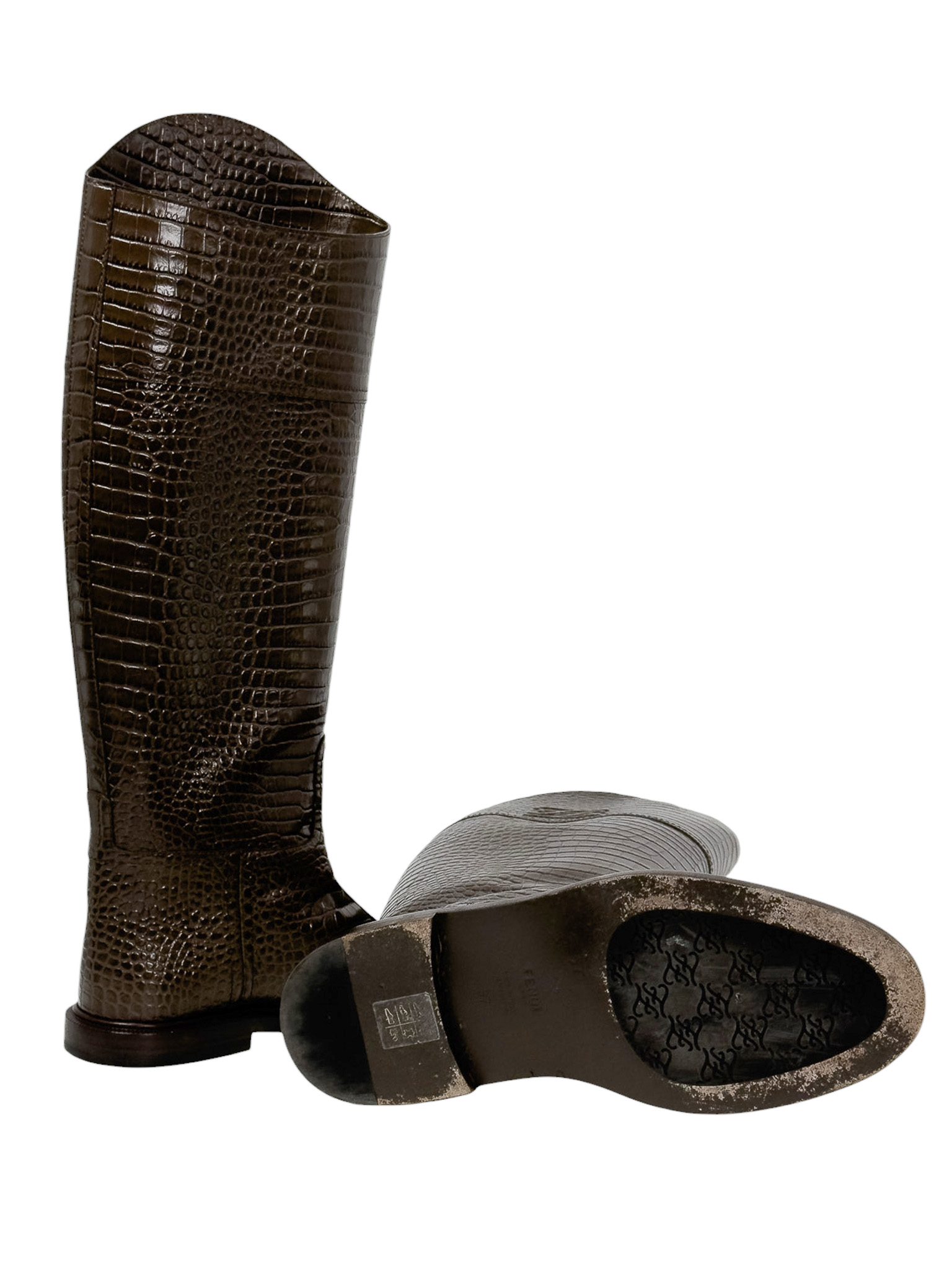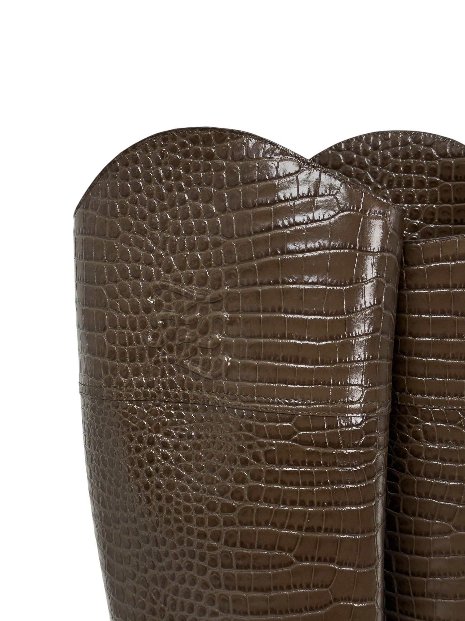 "Płaskie, brązowe kozaki z krokodyla, asymetryczna cholewka, wsuwane, wytłaczane logo marki w bocznej części, migdałowe noski, niski obcas, wykończone przeszyciami. Stan bardzo dobry. Rozmiar 37."