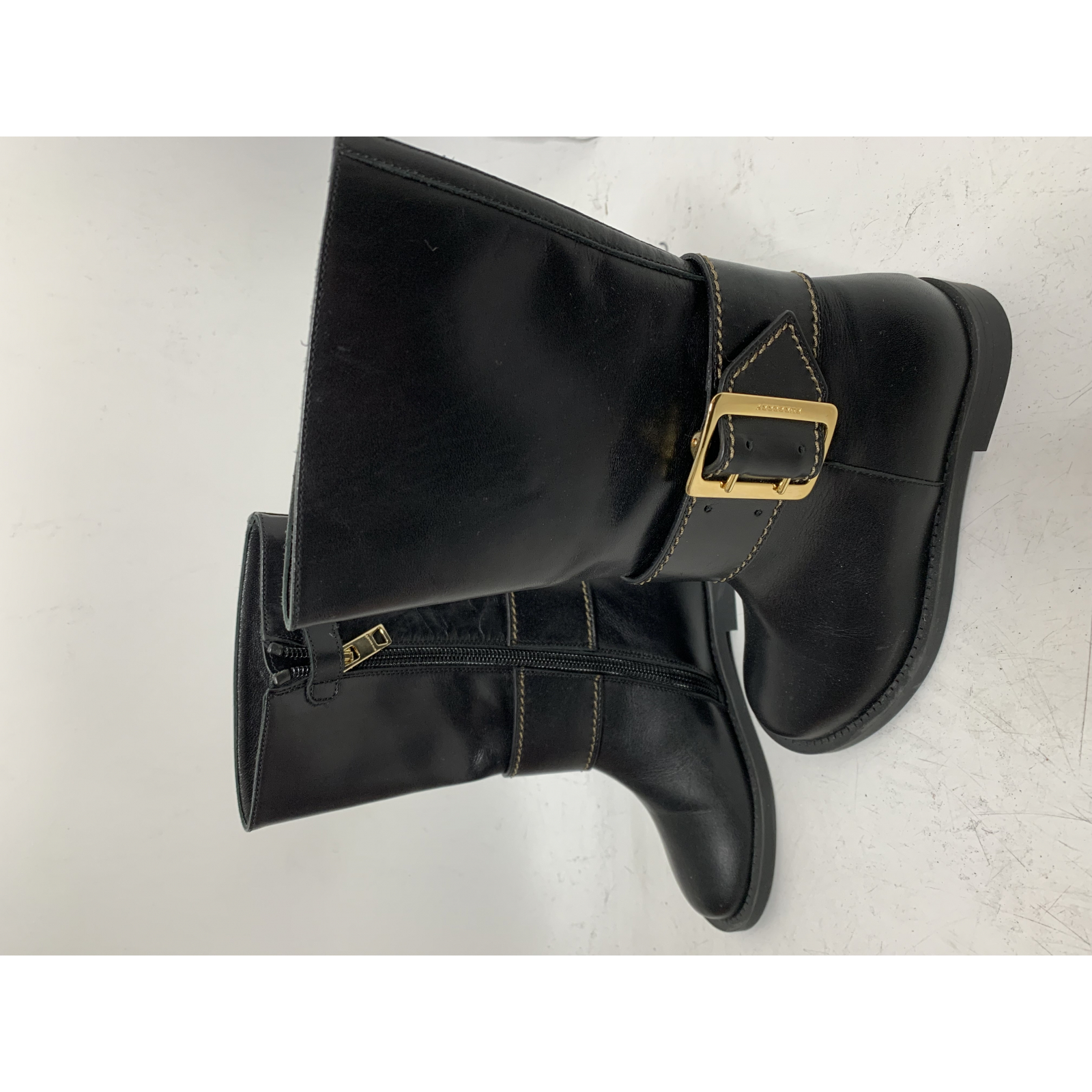 "czarne skórzane kozaki, zapinane z boku na suwak, pasek ze złotą klamerką wokół kostki, rozmiar 27"