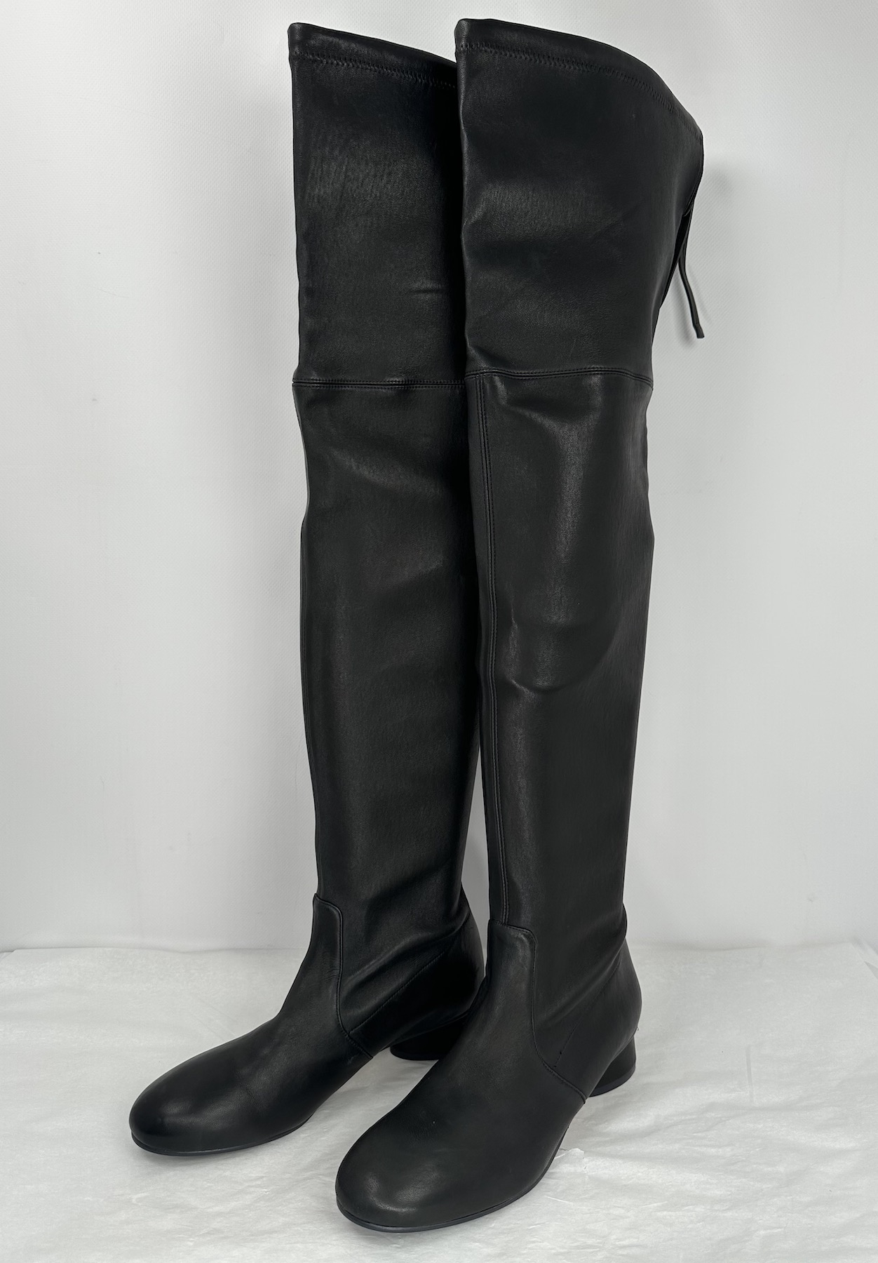 "czarne, skórzane kozaki z długą cholewką, niski okrągły obcas, nowe stan bardzo dobry, zarysowania na skórze. Rozmiar 39, wys obcasa 3 cm."