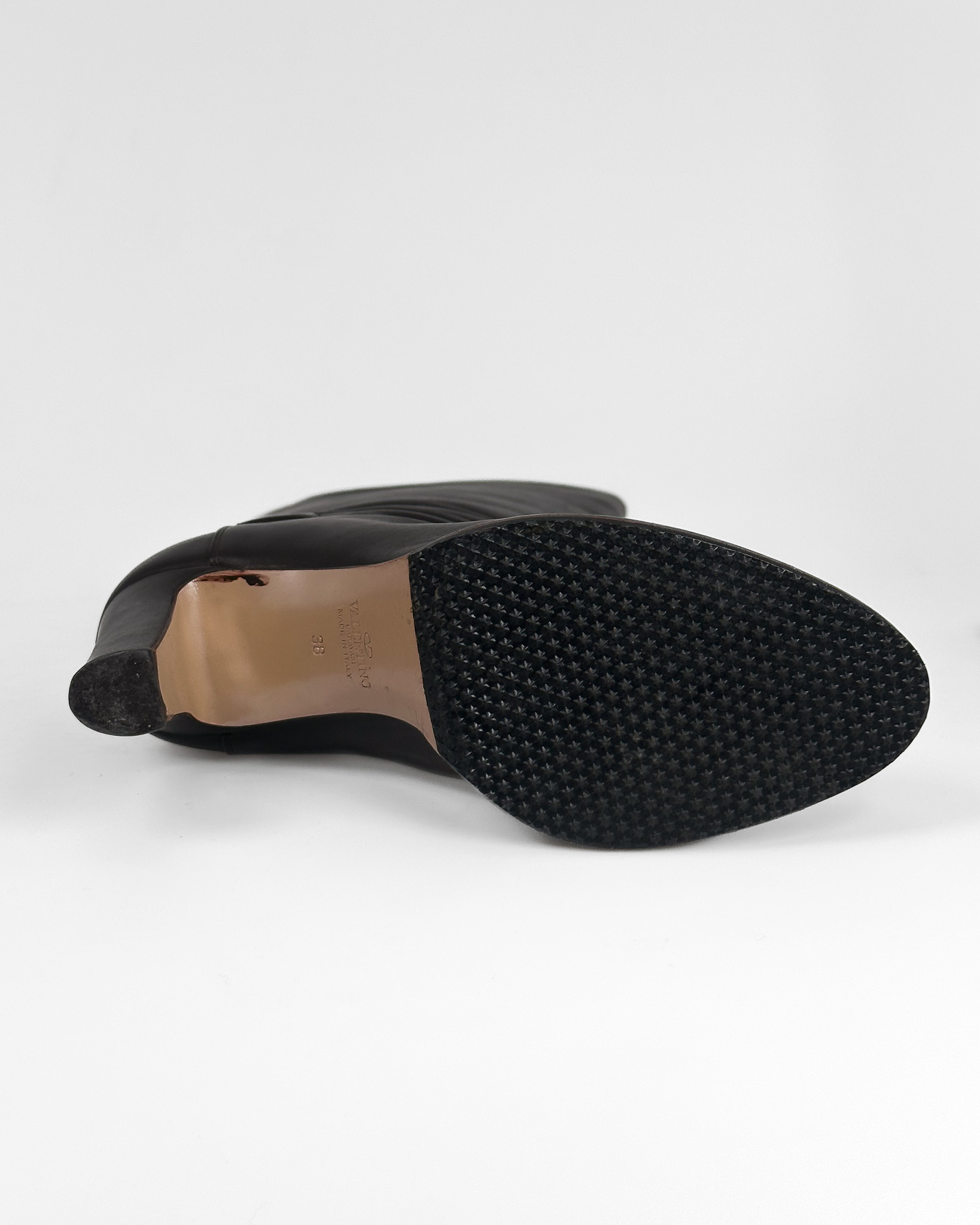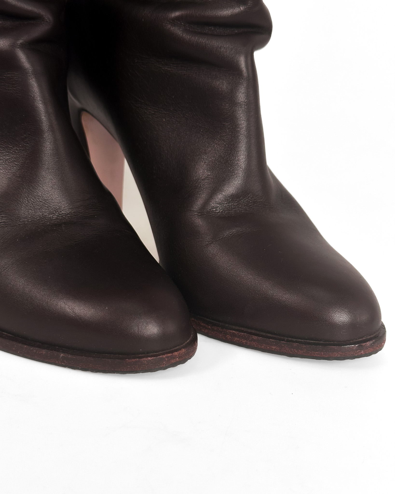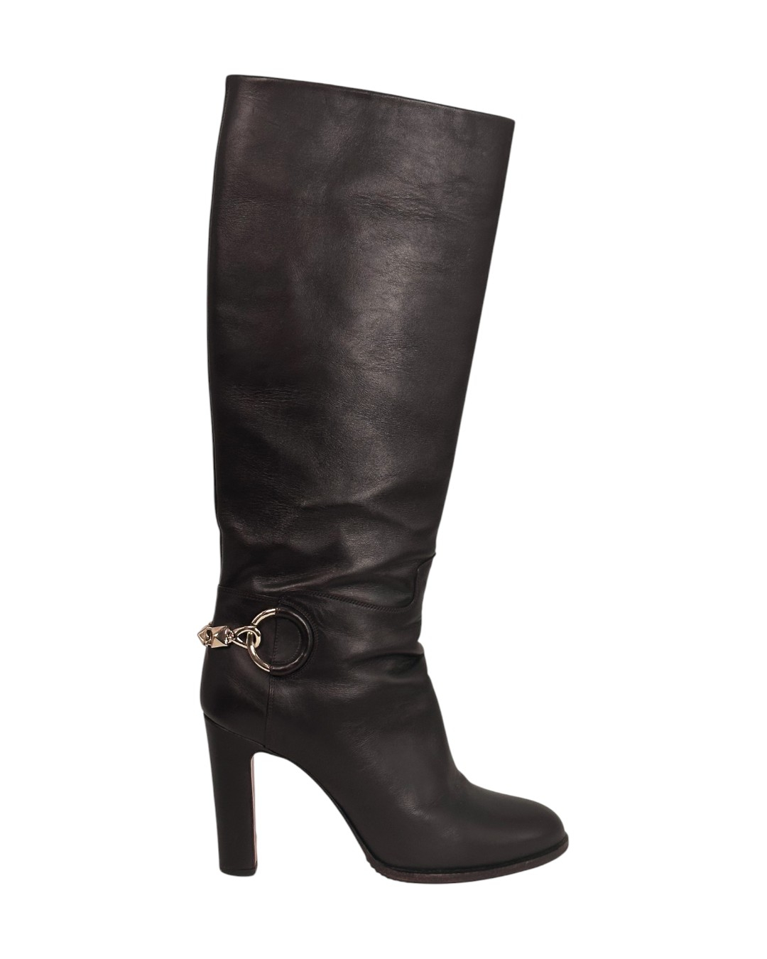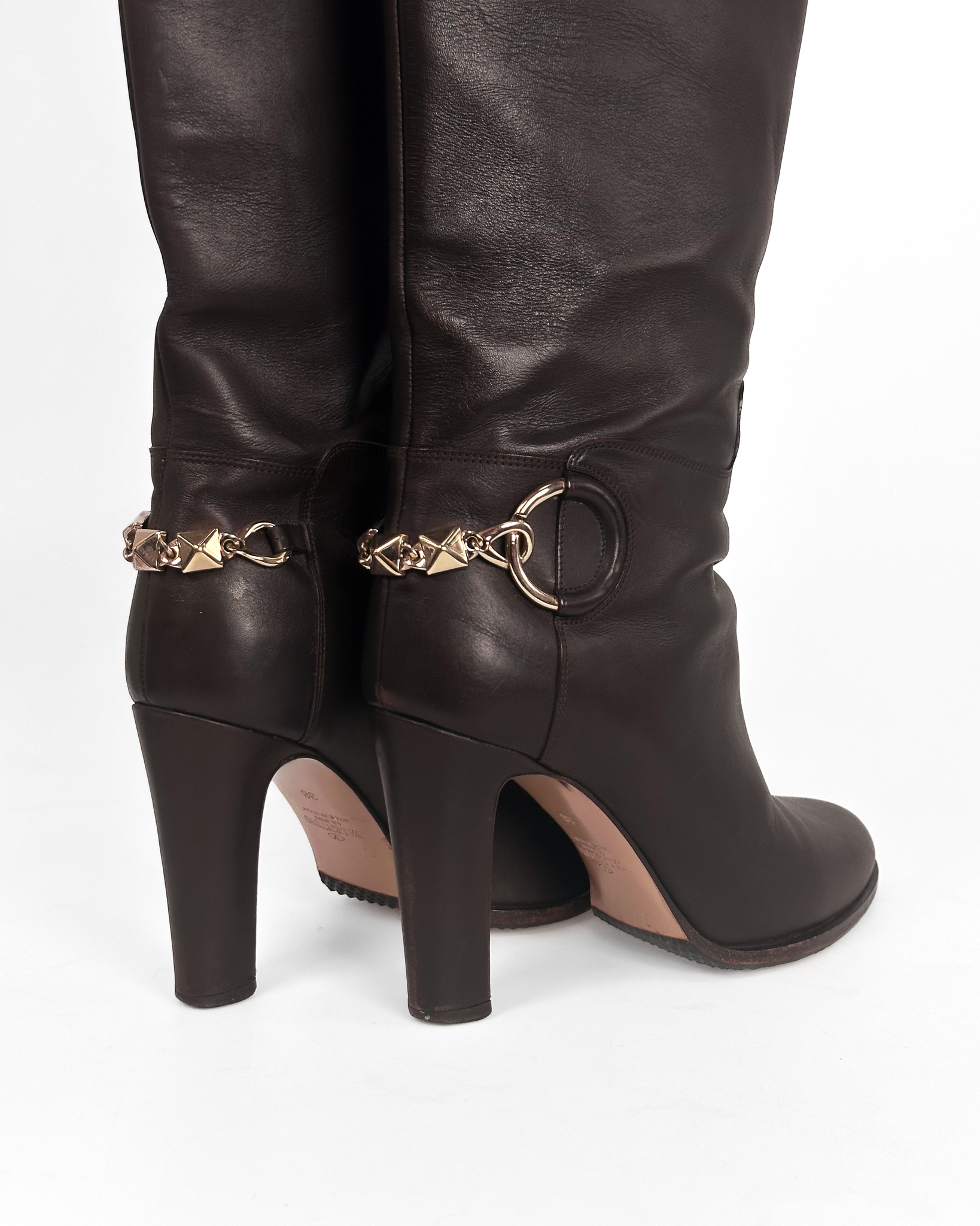 "Brązowe skórzane kozaki przed kolano, na obcasie, podzelowane, ćwieki charakterystyczne dla marki, łańcuchowa wstawka w tylnej części, zaokrąglone noski. Stan bardzo dobry. Rozmiar 38.