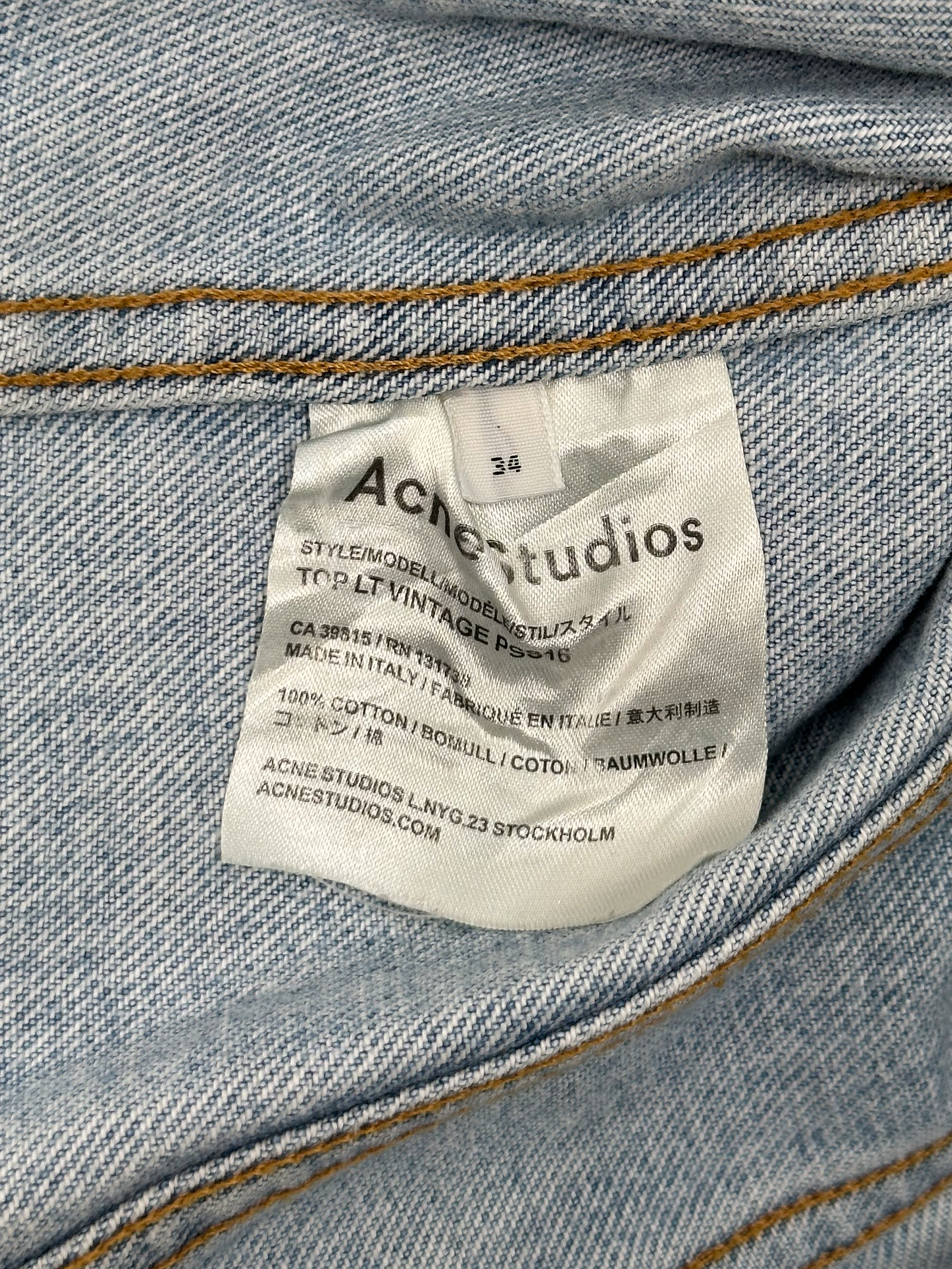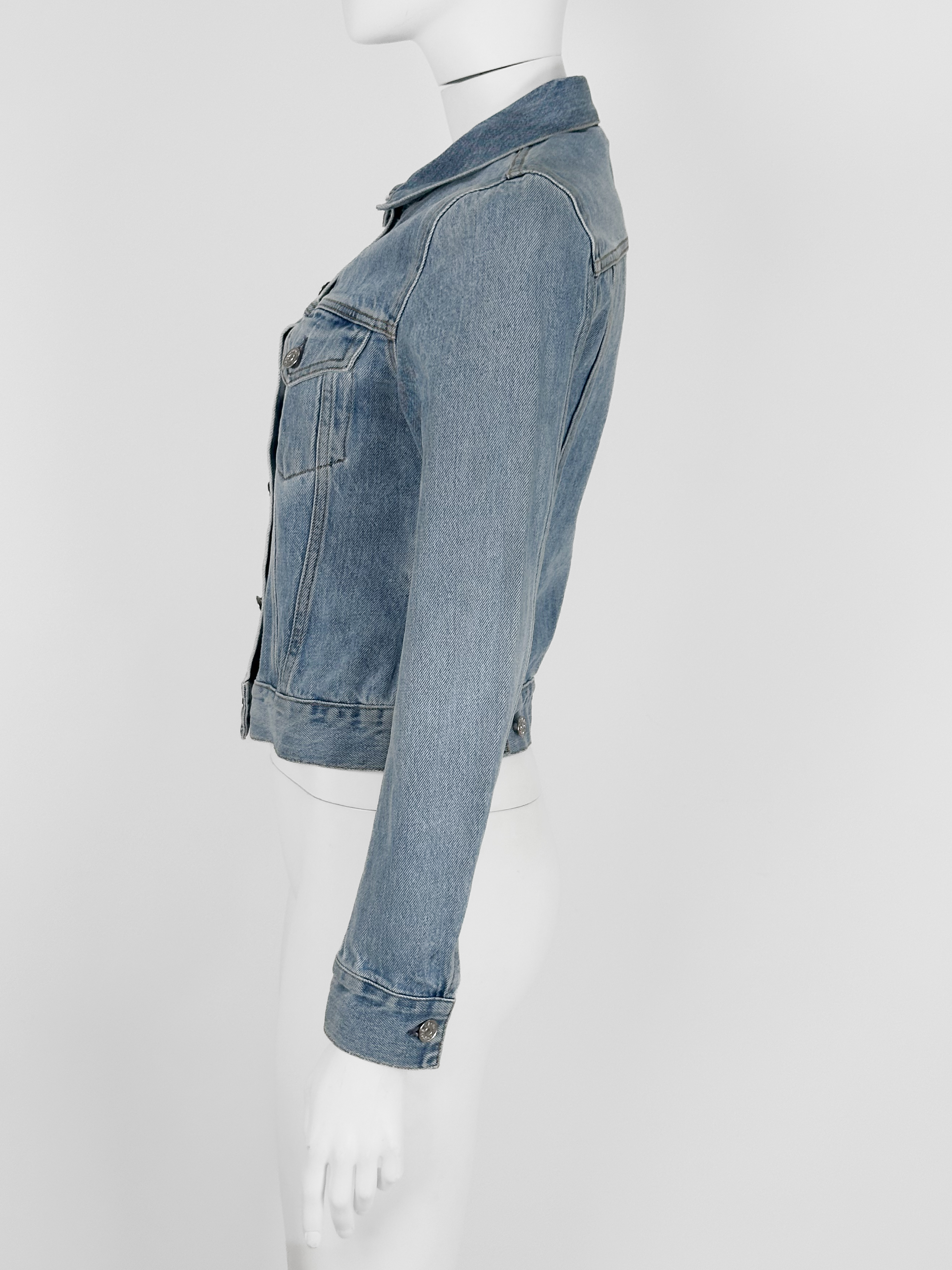 "Kurtka jeansowa jasnoniebieska, dwie kieszenie na przodzie, zapinana na srebrne guziki, regulowany pas, rozpinane mankiety. Rozmiar z metki 34. Skład: 100% bawełna."