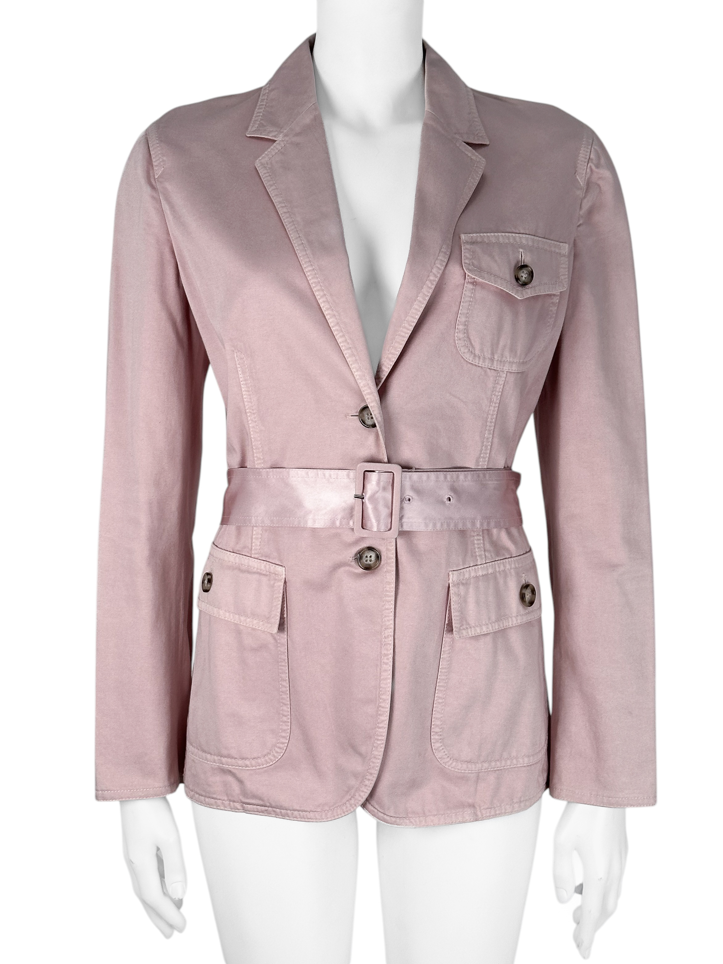 "Kurtka/marynarka w kolorze różowym, pasek w talii, dekolt w szpic, trzy kieszenie na przodzie, zapinana na szylkretowe guziki. Stan bardzo dobry. Rozmiar z metki IT 44. Skład: 100% bawełna. Wymiary: szerokość mierzona od pachy do pachy 50cm, długość całkowita 69cm."