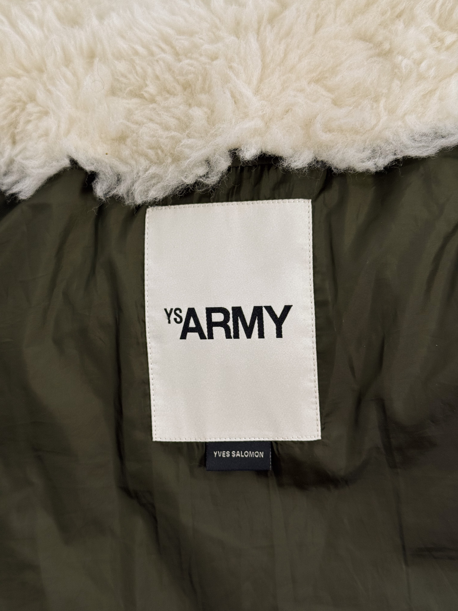 "Kurtka puchowa w kolorze khaki, wykończona odpinaną czarną skórzaną podszewką z kapturem z białym futrem, krótki krój, zapinana na logowany suwak, dwie kryte kieszenie po bokach zapinane na zatrzaski, naszywka z logo marki na rękawie, z lini A (Army). Rozmiar 36. Skład: 100% skóra jagnięca; ściągacz: 68% poliester, 26% wiskoza, 6% elastan. Wymiary: szerokość: 69cm długość: 66cm"