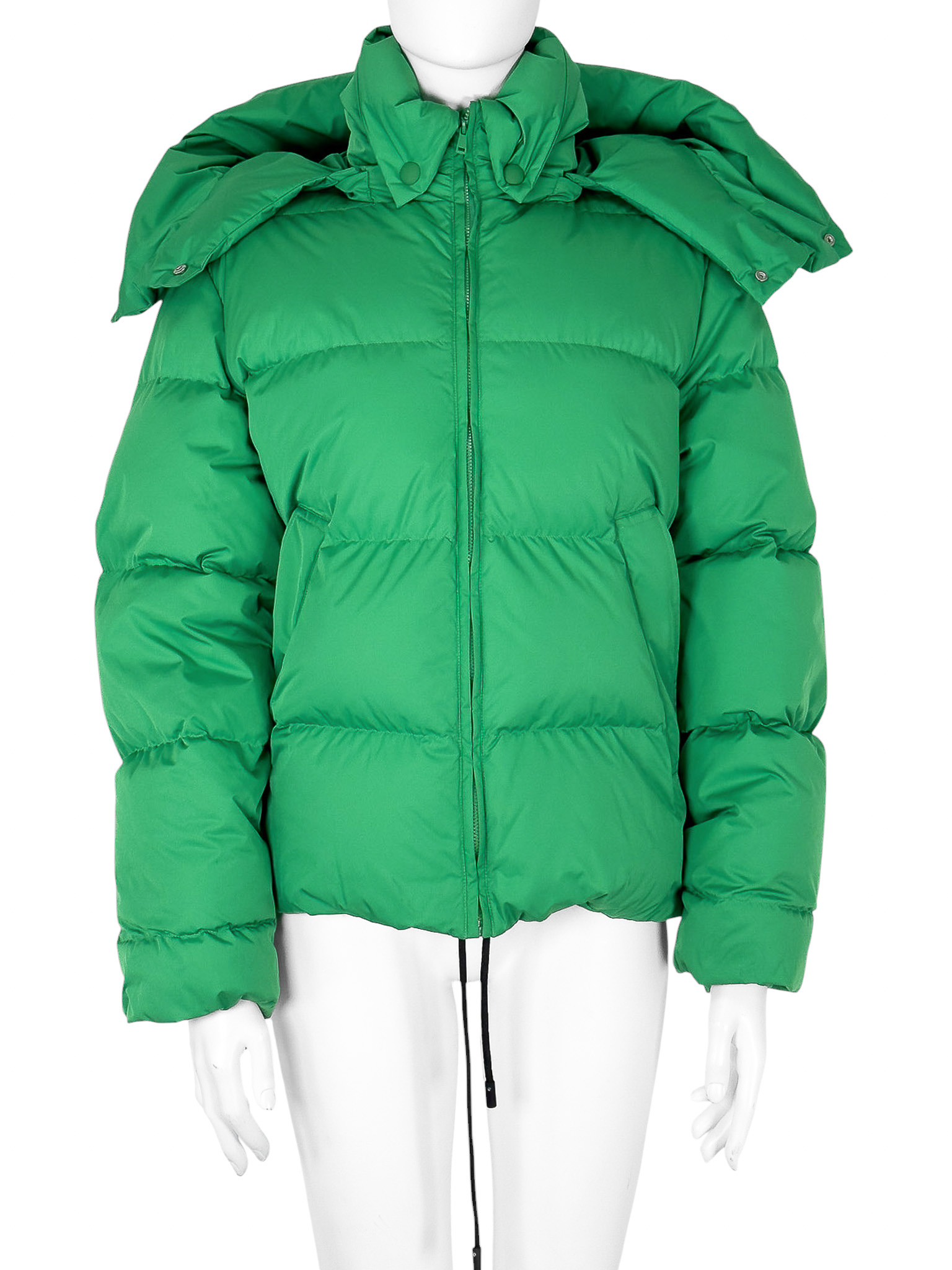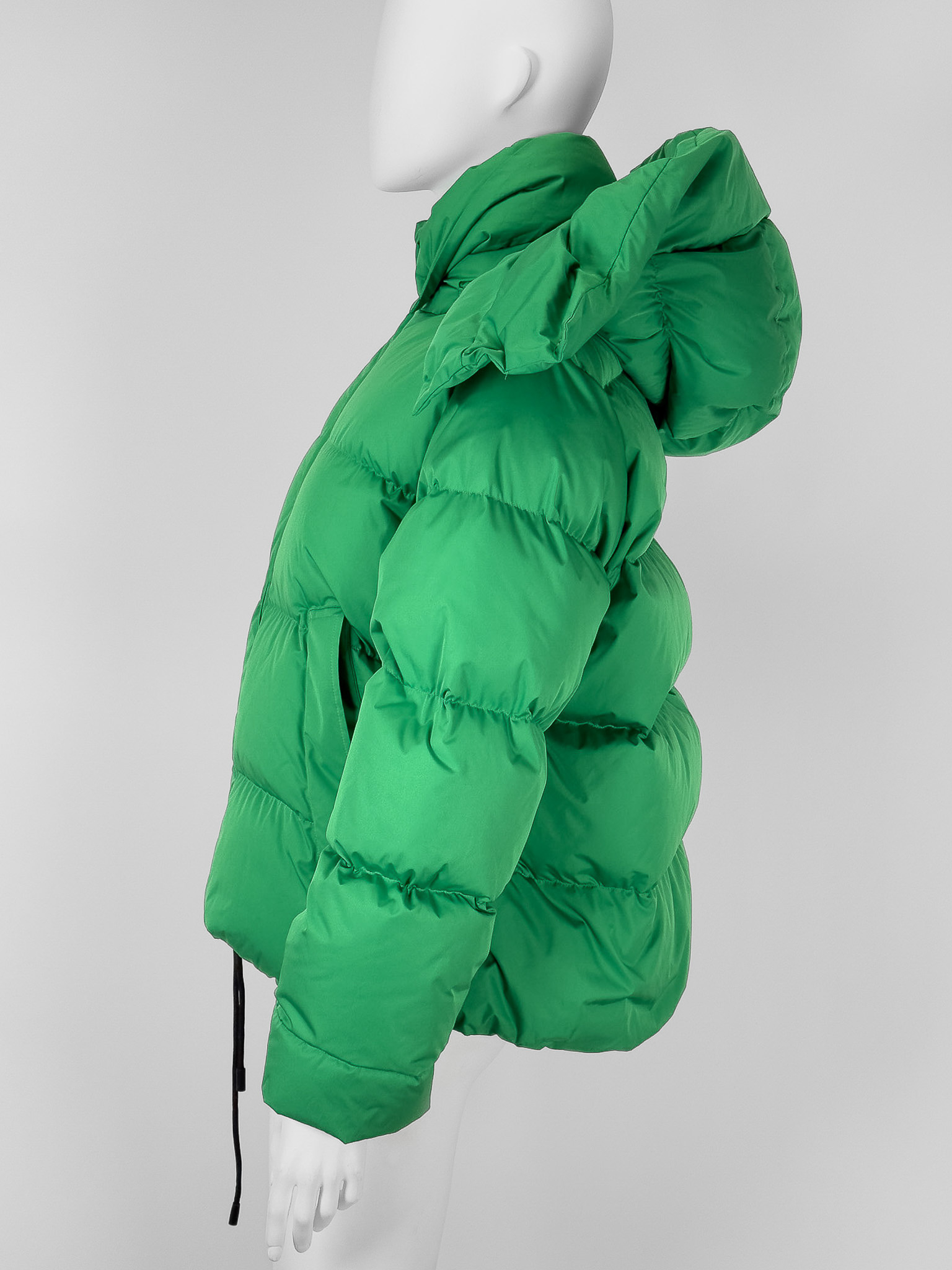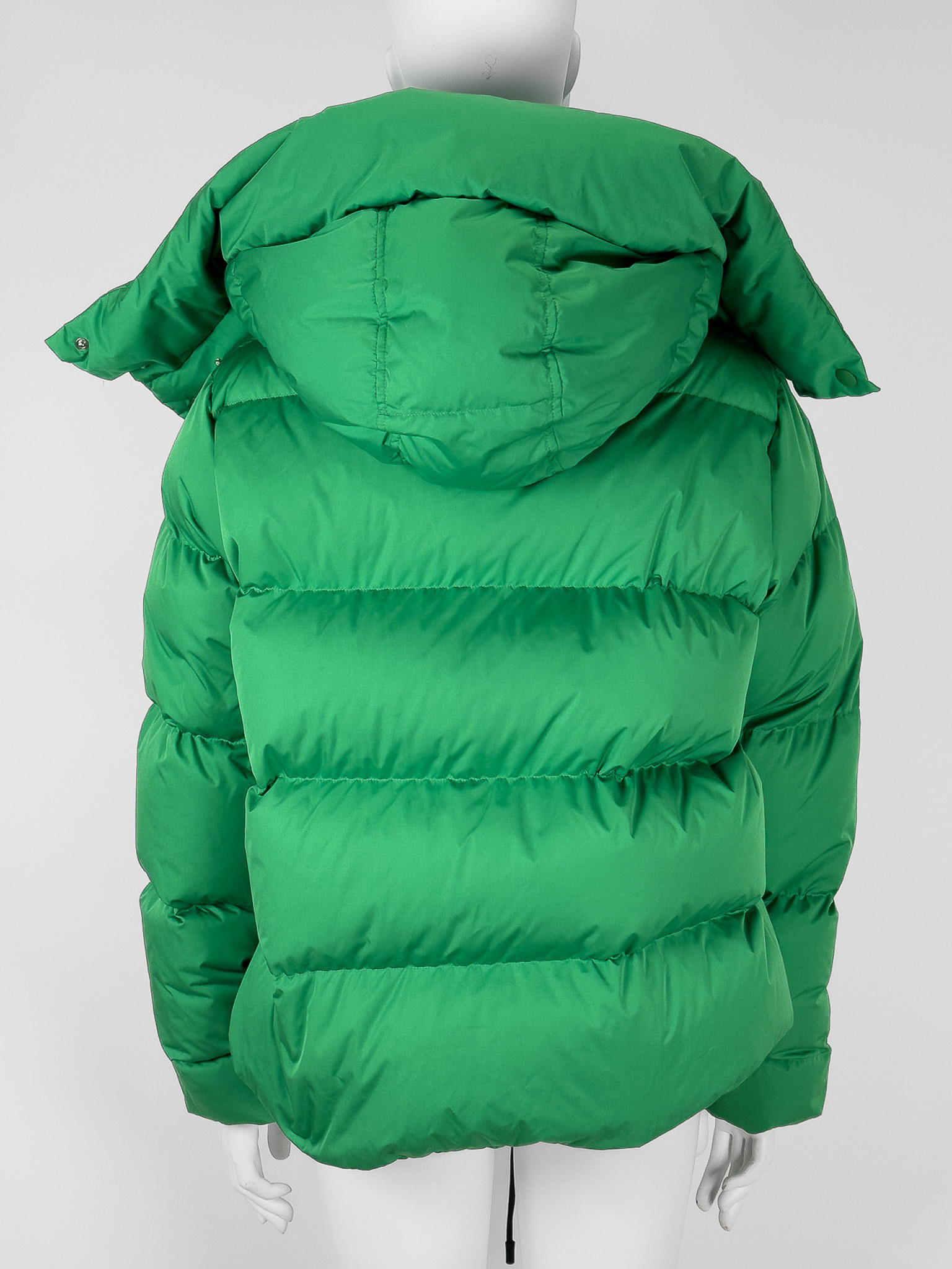 "Zielona kurtka puchowa z kapturem, krótki krój oversize, odpinany kaptur, stójka, pikowana, dwie kryte kieszenie po bokach, zapinana na suwak, regulowana ściągaczem w dolnej części, paski ułatwiające noszenie od wewnętrznej strony. Stan bardzo dobry, delikatnie zgnieciony jeden aglet przy ściągaczu. Rozmiar z metki IT 40. Skład: 100% poliester, wypełnienie: 90% puch, 10% pióra. Wymiary: szerokość mierzona od pachy do pachy 60cm, długość całkowita 60cm."