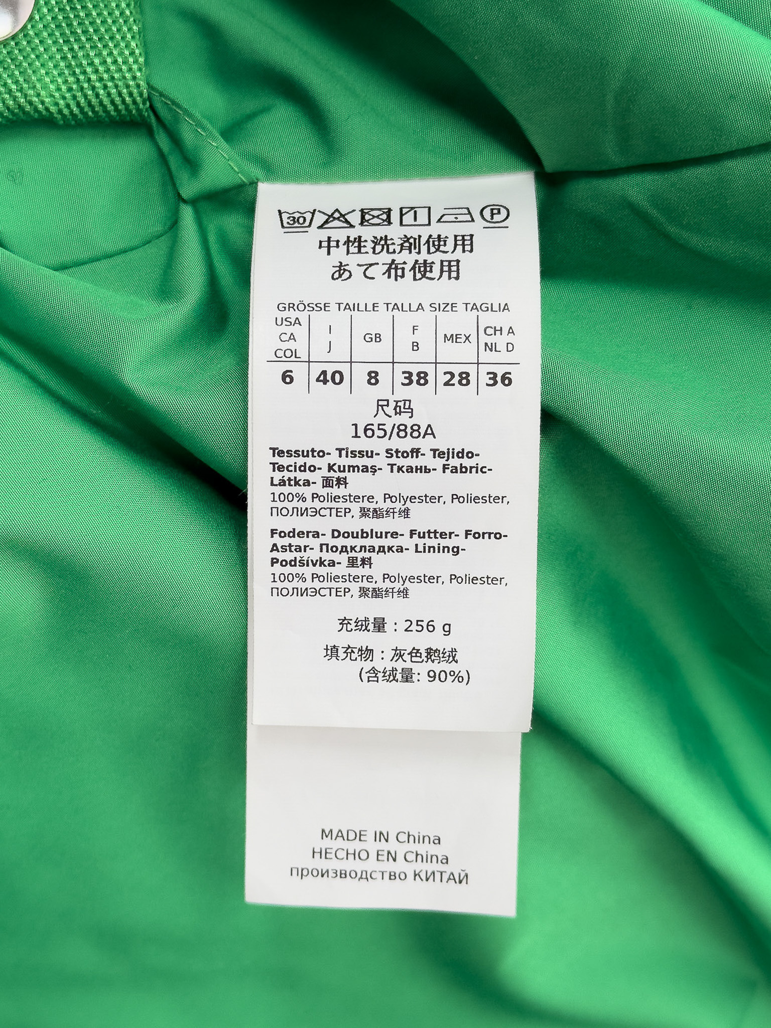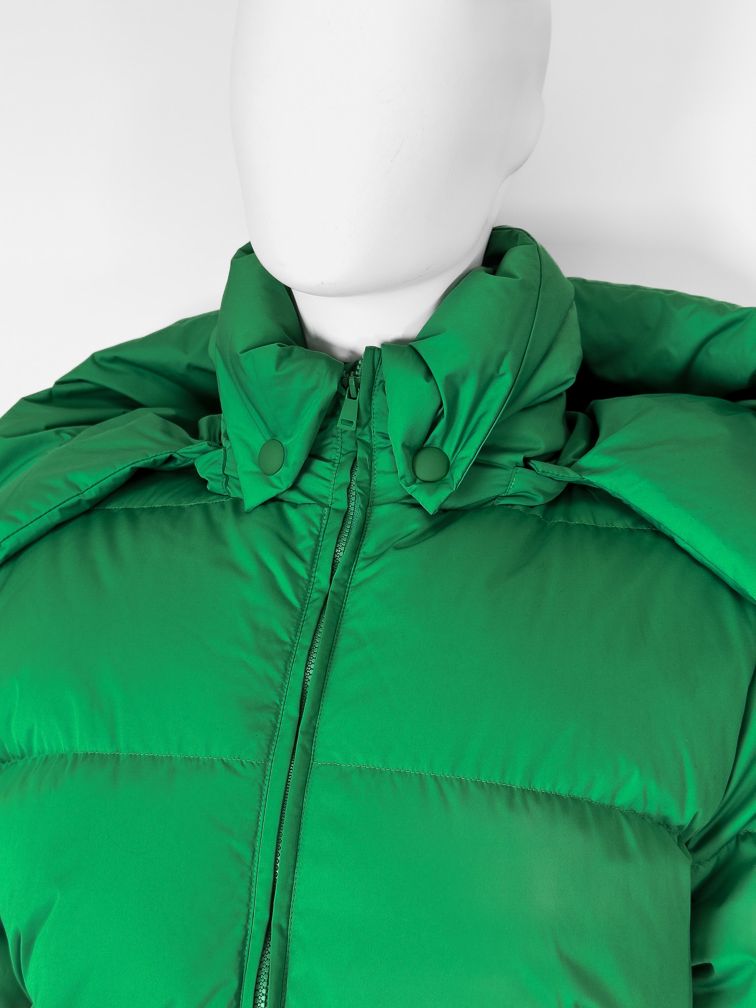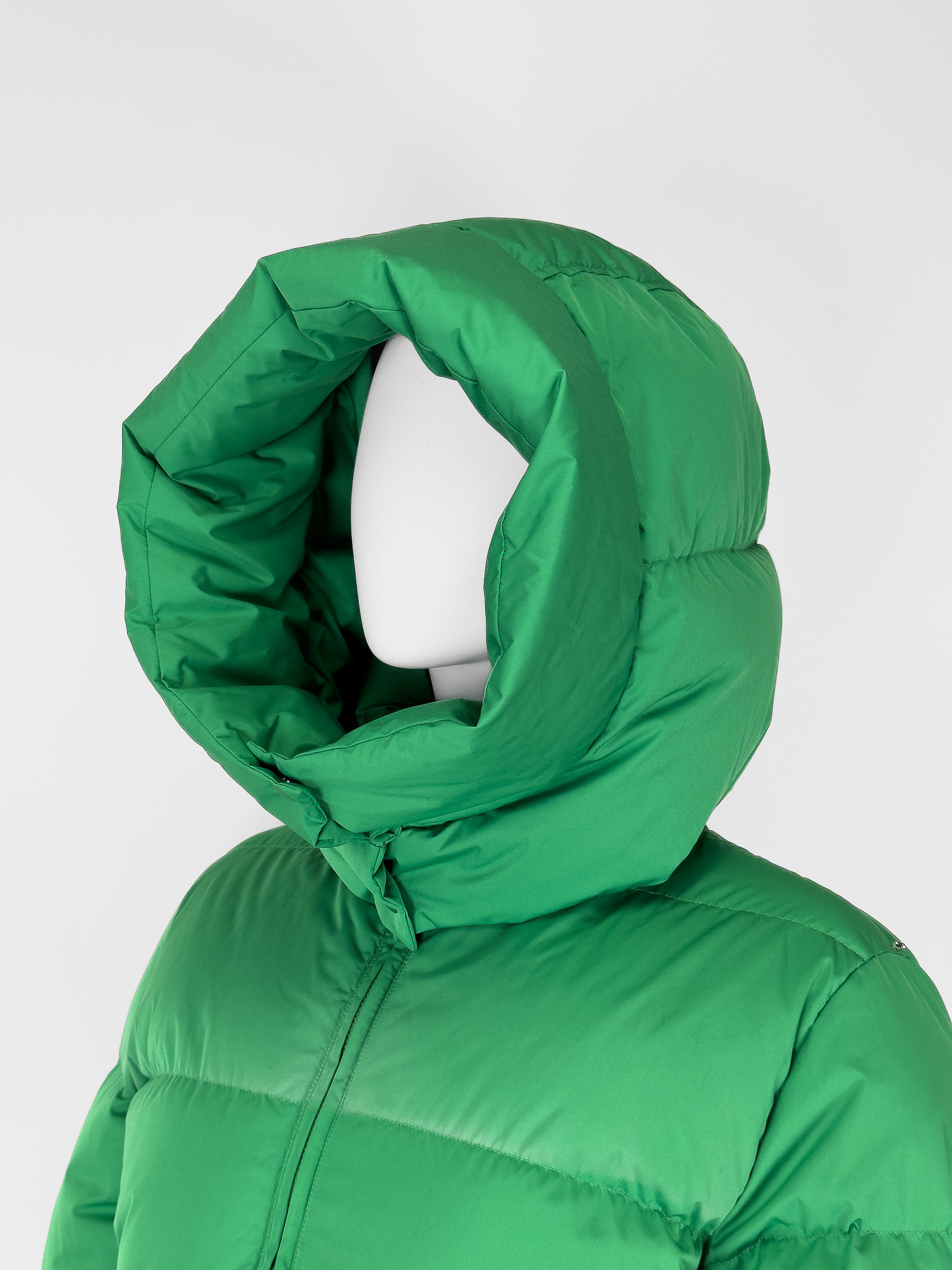 "Zielona kurtka puchowa z kapturem, krótki krój oversize, odpinany kaptur, stójka, pikowana, dwie kryte kieszenie po bokach, zapinana na suwak, regulowana ściągaczem w dolnej części, paski ułatwiające noszenie od wewnętrznej strony. Stan bardzo dobry, delikatnie zgnieciony jeden aglet przy ściągaczu. Rozmiar z metki IT 40. Skład: 100% poliester, wypełnienie: 90% puch, 10% pióra. Wymiary: szerokość mierzona od pachy do pachy 60cm, długość całkowita 60cm."