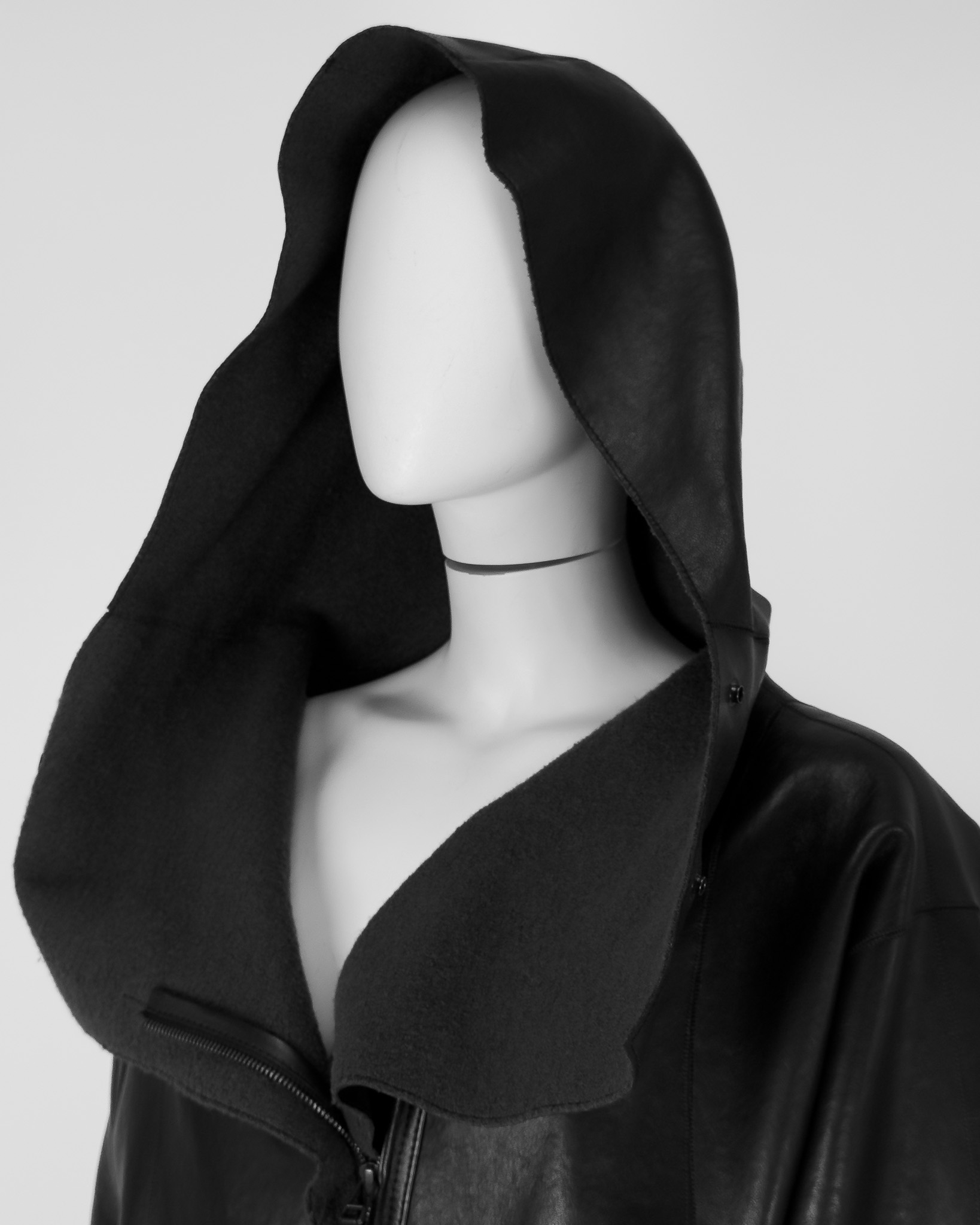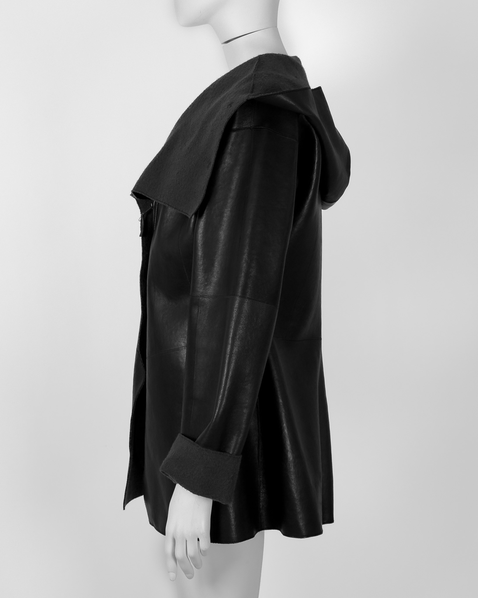 "Dłuższa kurtka skórzana w stylu oversize z kapturem, ma charakterystyczny dla tego modelu suwak po skosie wzdłuż frontu, wysoki kołnierz zapinany na dwa guziki, wykończona przeszyciami ora grafitową podszewką, dwie kryte kieszenie po bokach. Stan bardzo dobry. Rozmiar z metki 42. Skład 100 % skóra. Wymiary: szerokość mierzona od pachy do pachy 59cm, długość całkowita 78cm."