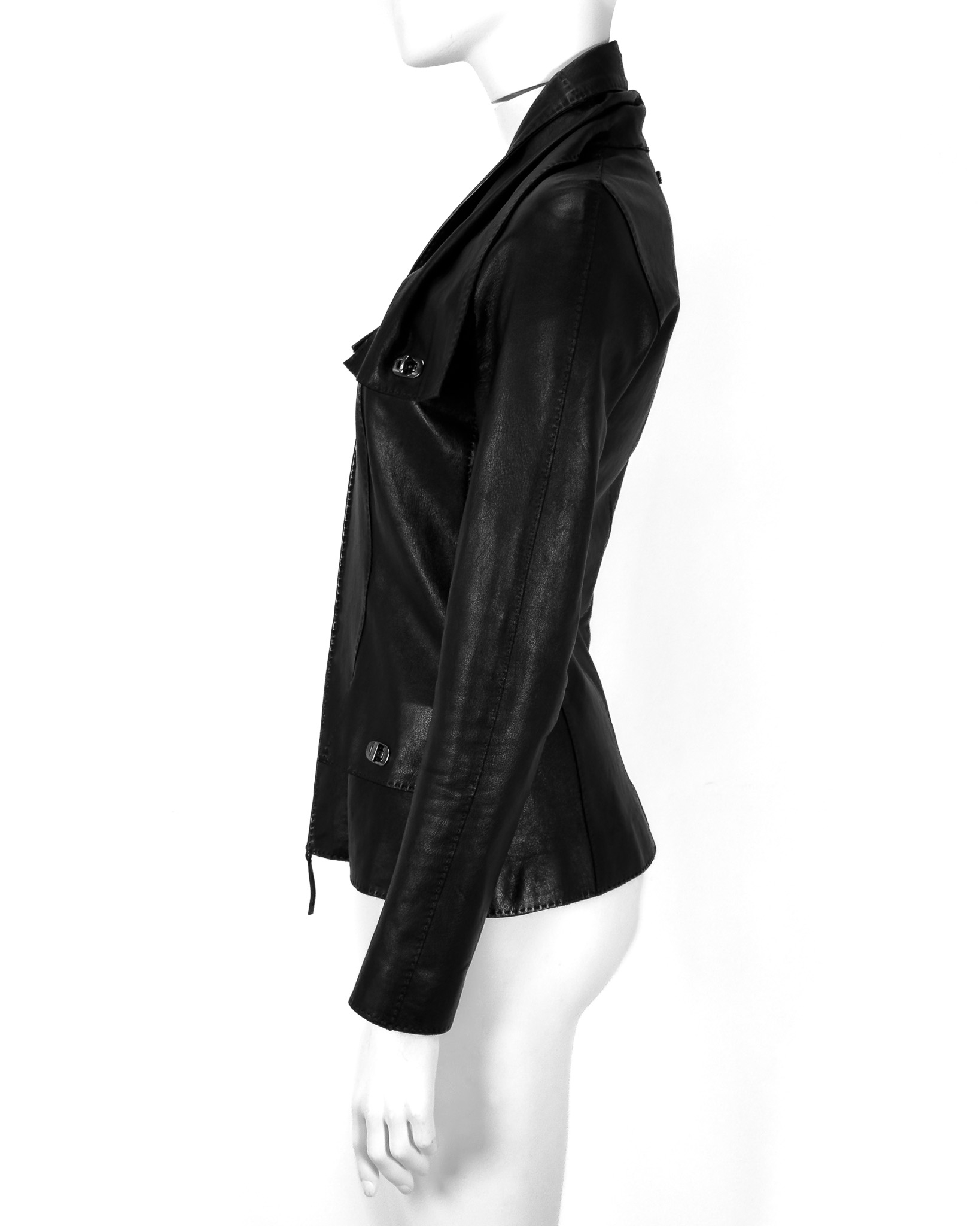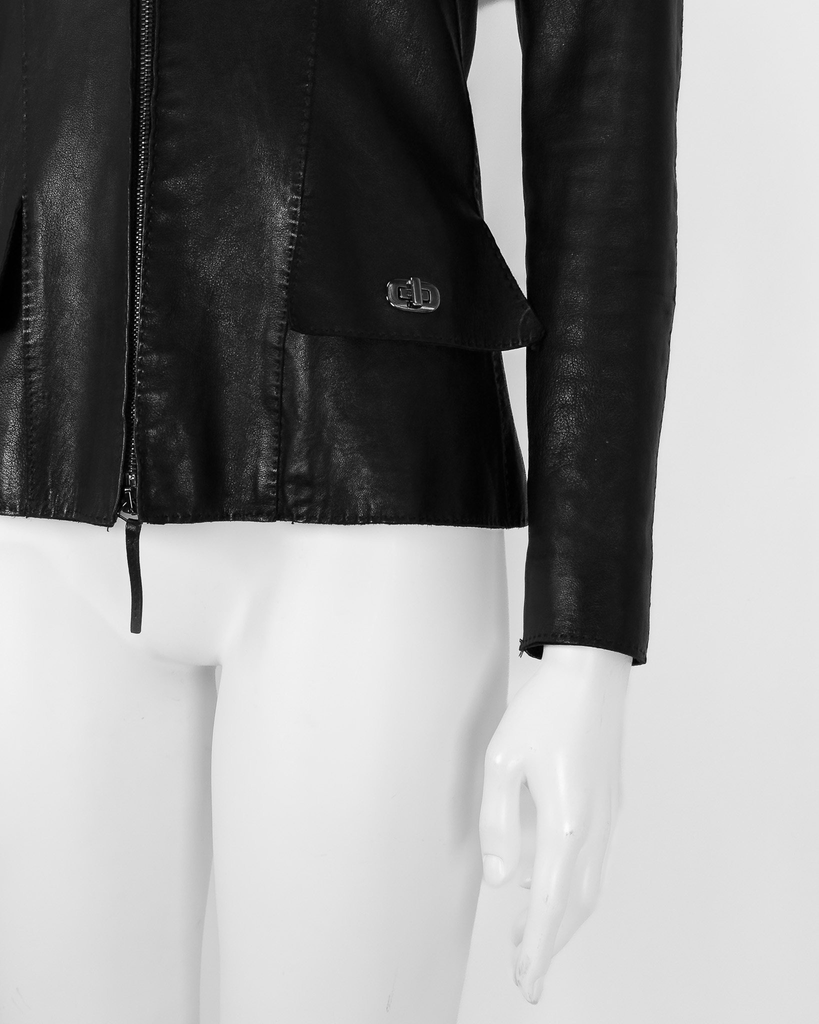 "Czarna kurtka skórzana, miękka skóra, szeroki kołnierz wykończony srebrnym przekręcam zapięciem na kieszeniach w okolicy biustu, taliowana, cztery kieszenie z klapami, zapinana na dwa suwaki, delikatne poduszki na ramionach, ozdobiona stębnowaniem. Rozmiar z metki IT 40. Skład: 100% skóra owcza; podszewka: 60% acetat, 40% rayon. Wymiary: szerokość mierzona od pachy do pachy 43cm, długość całkowita 62cm."