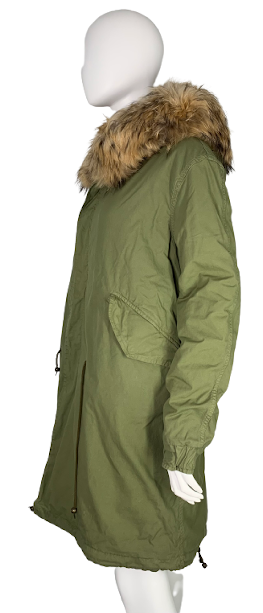 "kurtka parka męska, dłuższa, khaki, oceplana, przy kapturze futerko, rozmiar M, stan bardzo dobry, wewnątrz przy suwaku lamówka brązowa skóra"