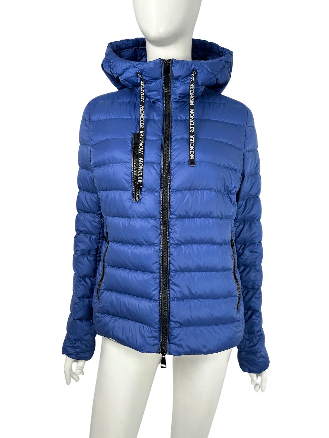 "Granatowa kurtka puchowa z regulowanym kapturem, krótka, zapinana na dwa czarne suwaki na przodzie, trzy zapinane kieszenie, logowane sznurki przy kapturze, proste rękawy, lekka, biała naszywka z logo marki na rękawie. Rozmiar z metki 3. Skład: 100% poliamid; podszewka: 100% poliamid; wypełnienie: 90% gęsi puch, 10% gęsie pióra. Wymiary: szer. biust 50, szer ramiona 40 cm, długość 60cm , rękaw 64 cm"