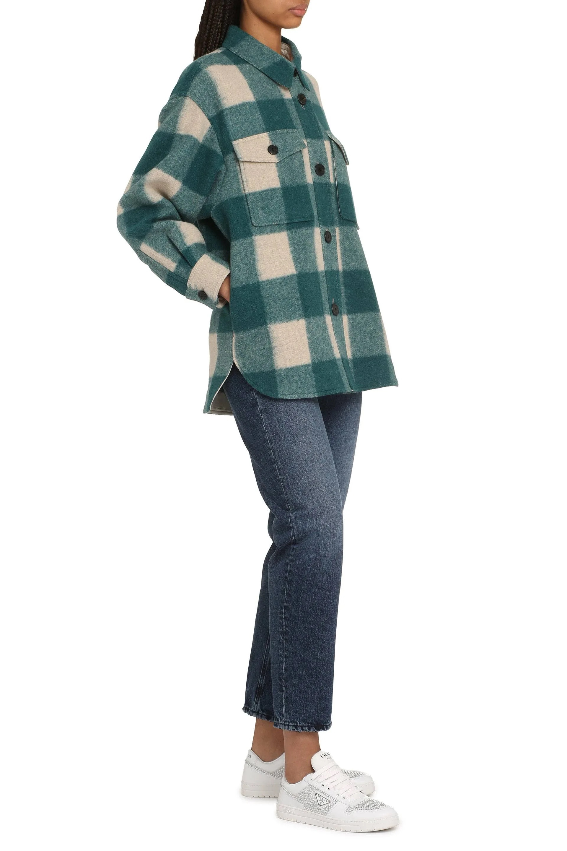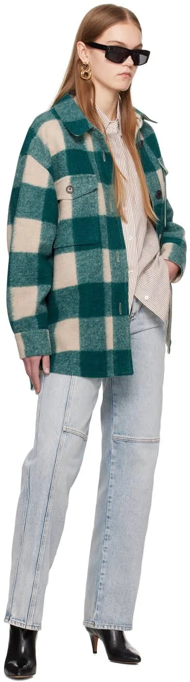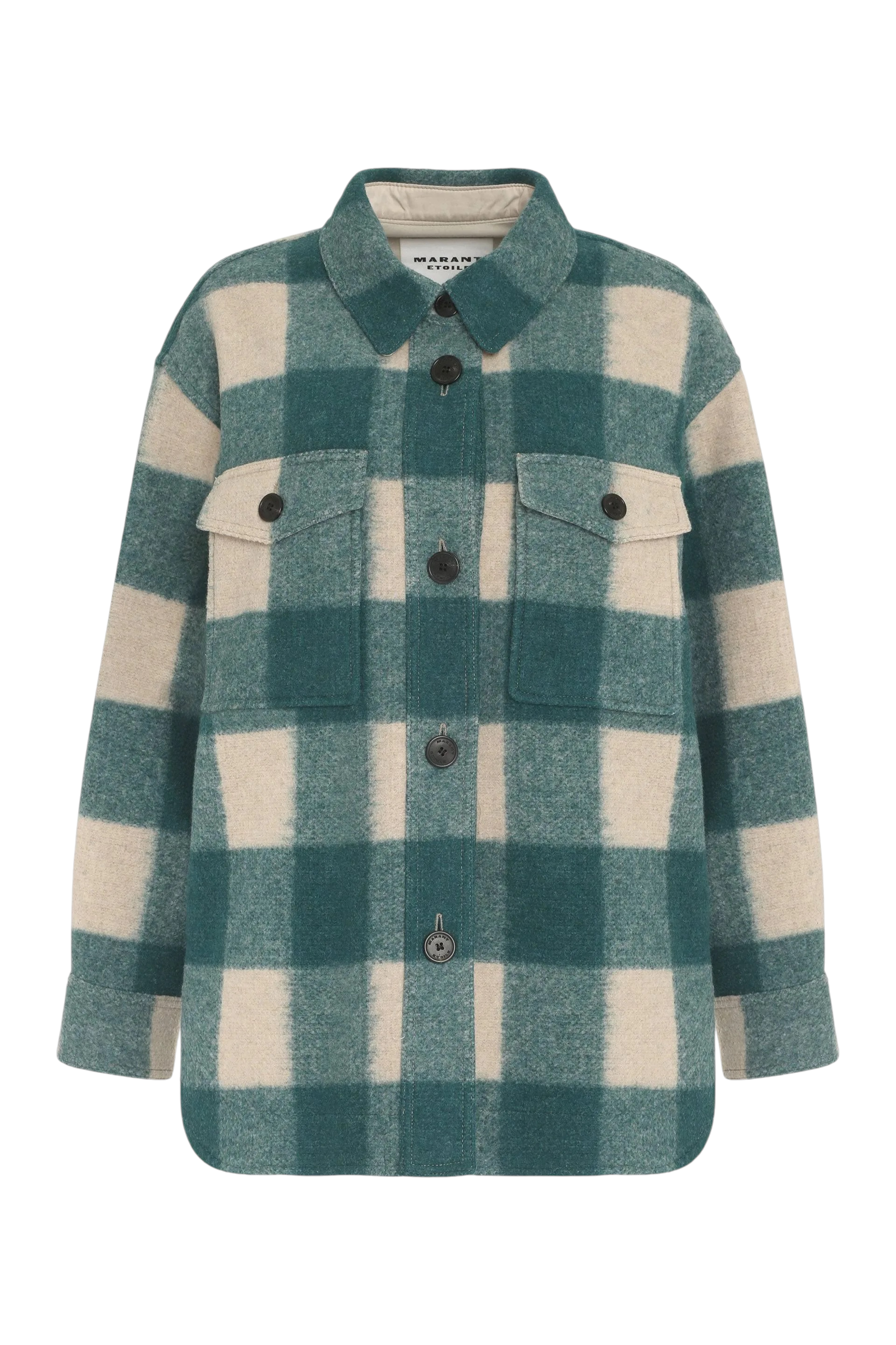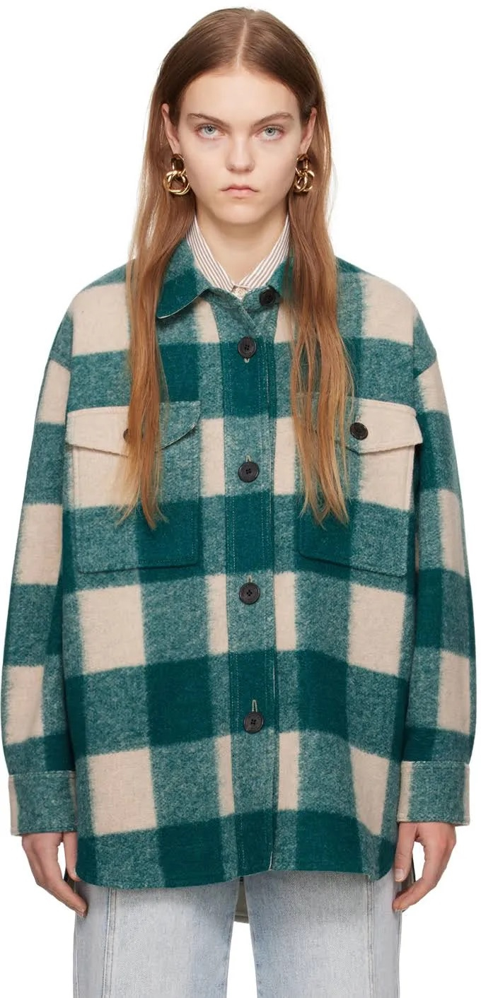 "Kurtka w beżowo-zieloną kratę z domieszką wełny w składzie, kołnierzyk, prosty krój, zapinana na czarne guziki, dwie kieszenie z klapami w okolicy biustu oraz dwie kryte po bokach, rozpinane makiety, zaokrąglony dół. Stan bardzo dobry. Rozmiar z metki 36. Skład: 58% poliester, 27% wełna dziewicza, 15% akryl. Wymiary: szerokość mierzona od pachy do pachy 58cm, długość całkowita 73cm."