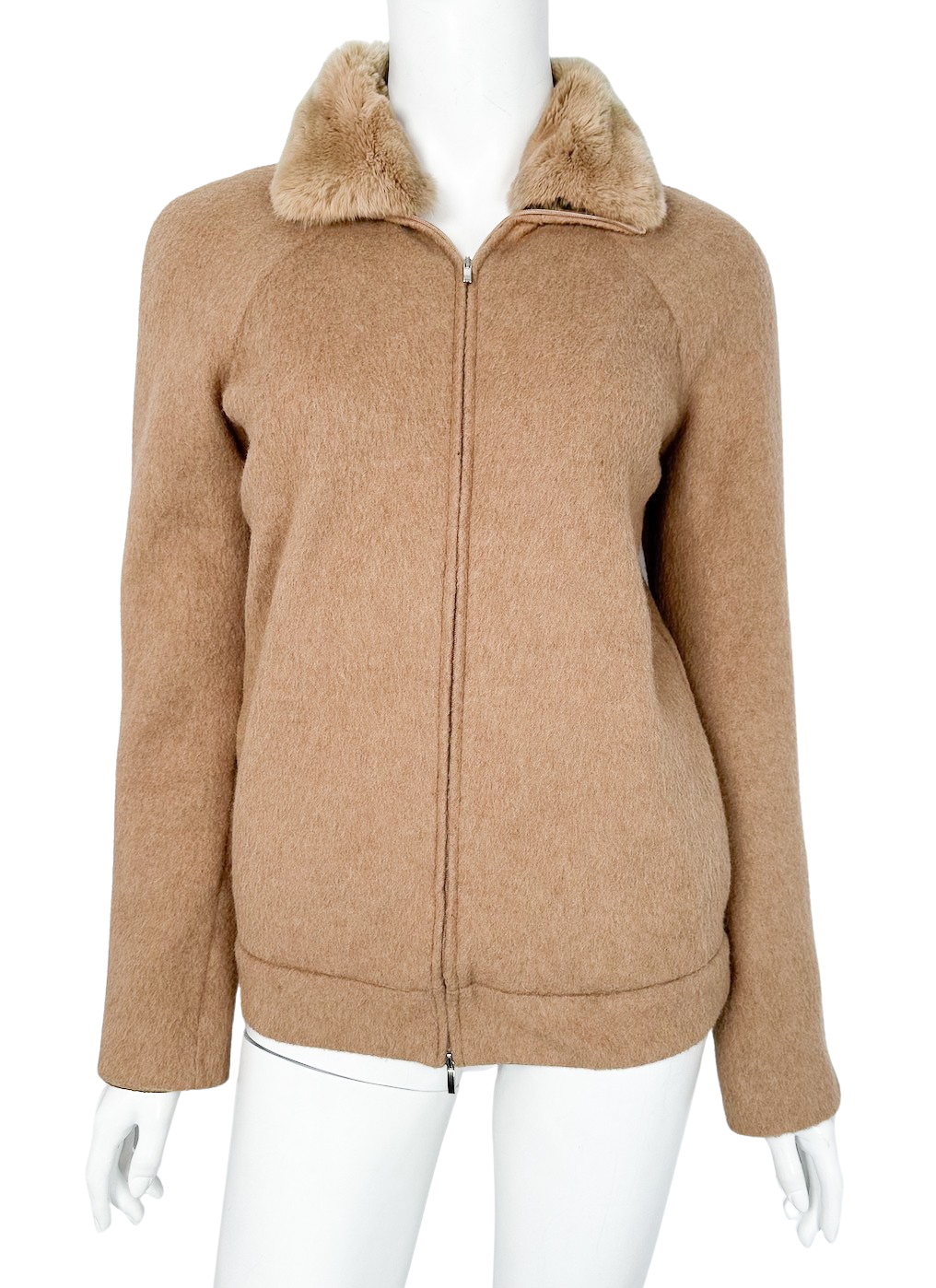 "Kurtko-sweter zapinany na suwak, w odcieniu jasnego brązu. Futrzany kołnierzyk z możliwością odpięcia, dwie boczne kieszenie. Rozmiar 38. Skład: 100% wełna z wielbłąda. Wymiary: szerokość mierzona od pachy do pachy 47cm, długość rękawa 60cm, długość całkowita 59,5cm."