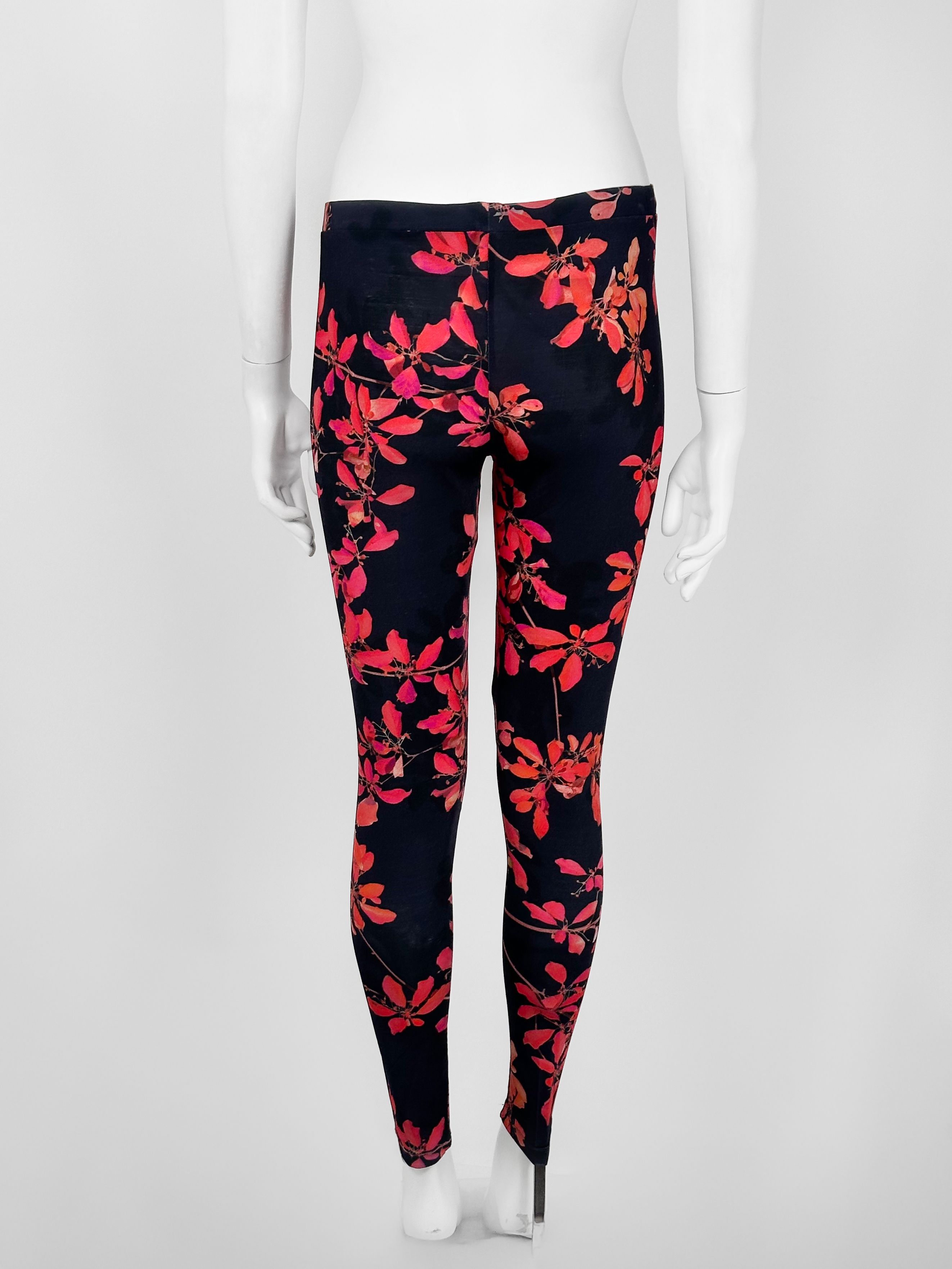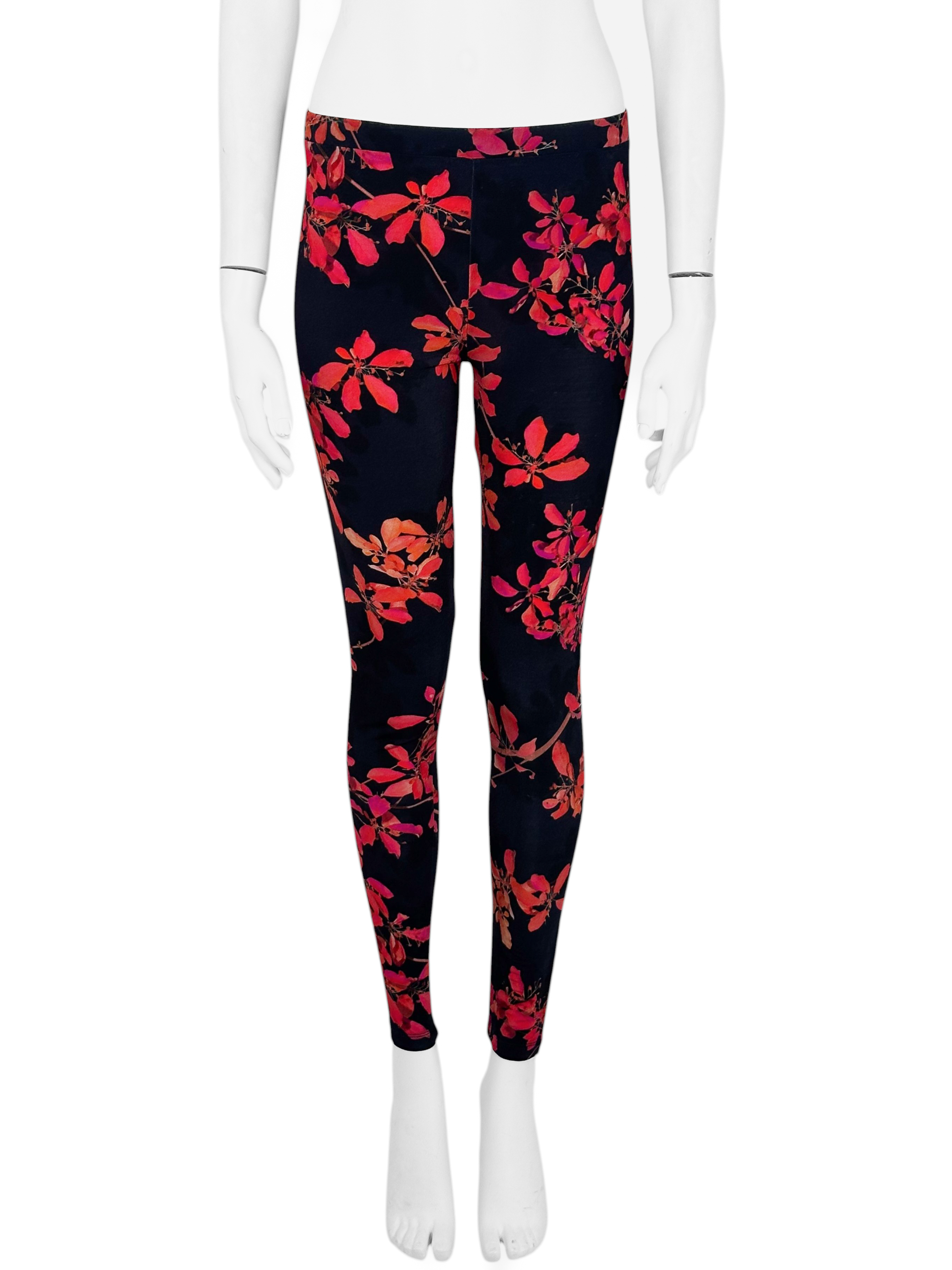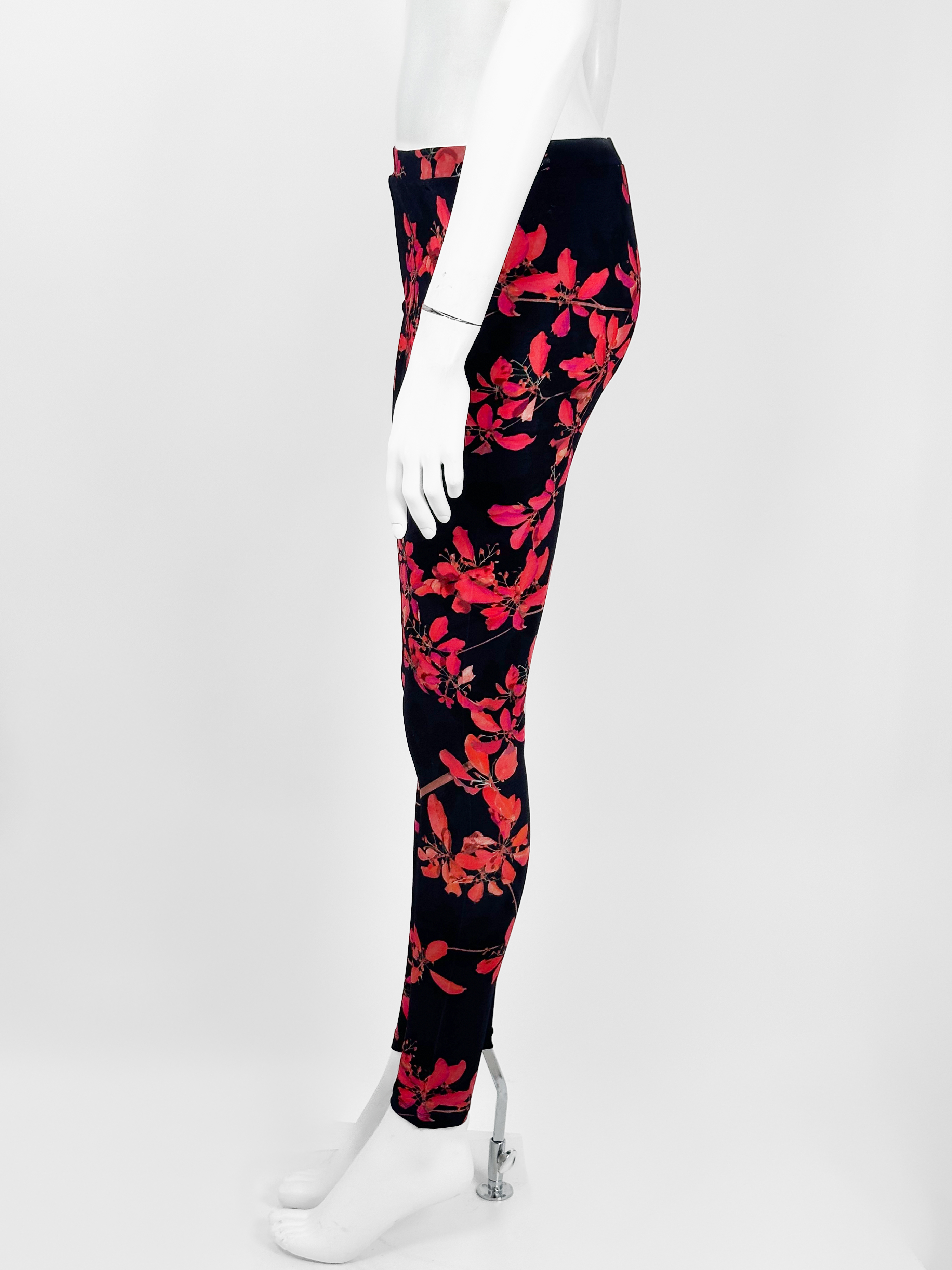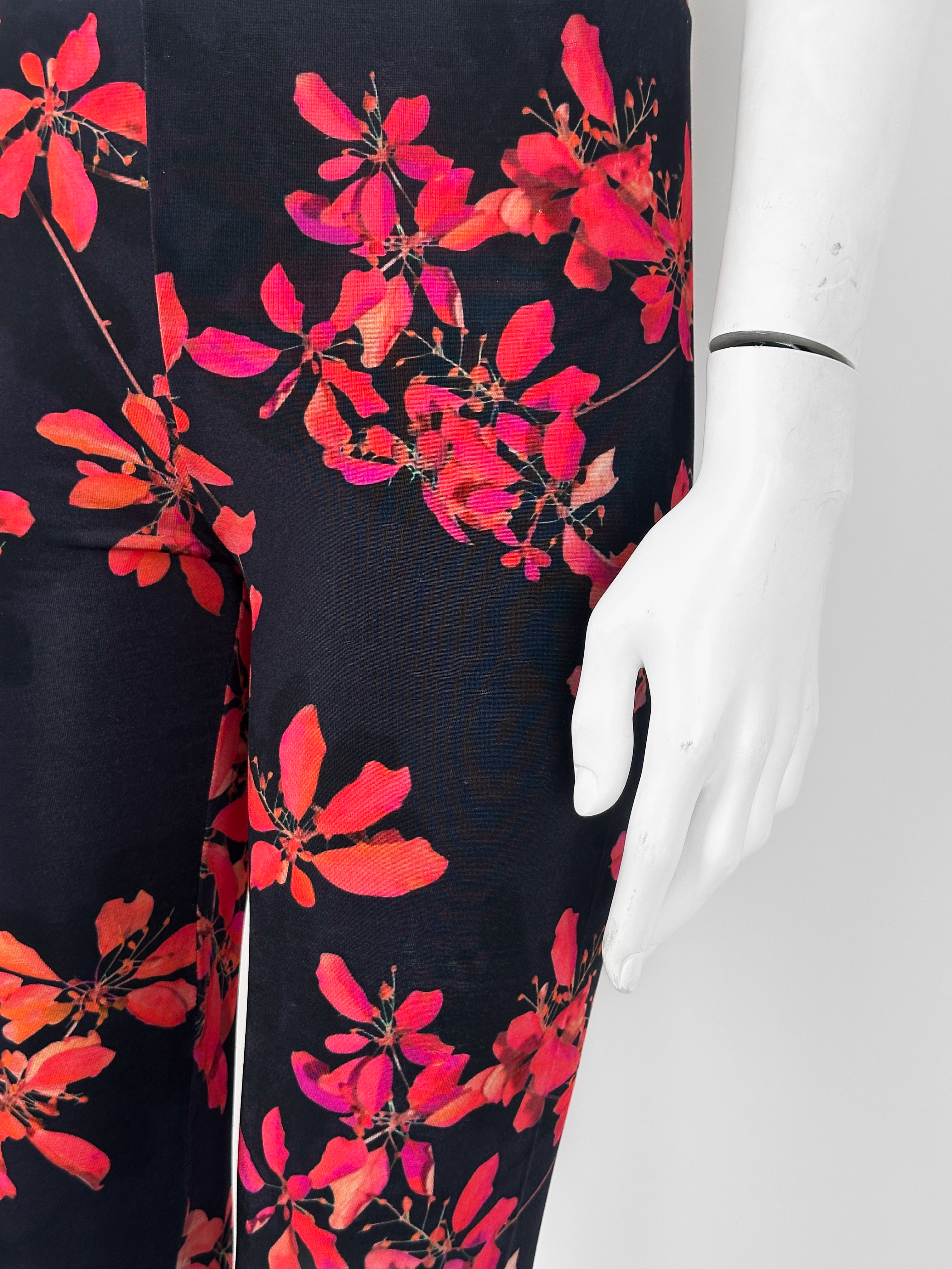 "Czarne dopasowane spodnie w motyw różowych kwiatów, legginsy, guma w pasie, wysoki stan. Stan bardzo dobry. Rozmiar z metki L. Skład: 90% wiskoza, 10% elastan. Stan bardzo dobry. Wymiary: szerokość w pasie 38cm, długość nogawki mierzona od zewnętrznej strony 102cm."