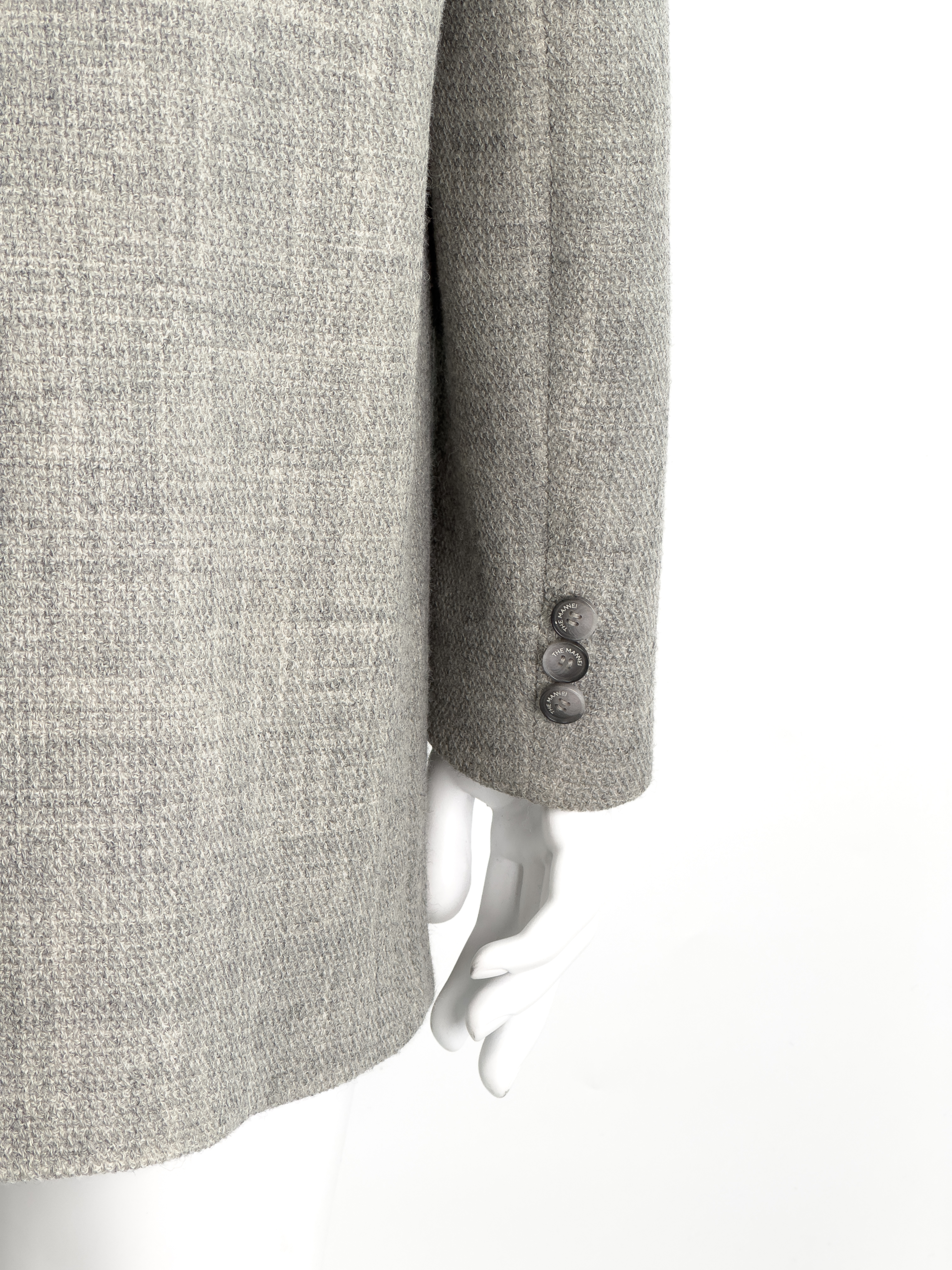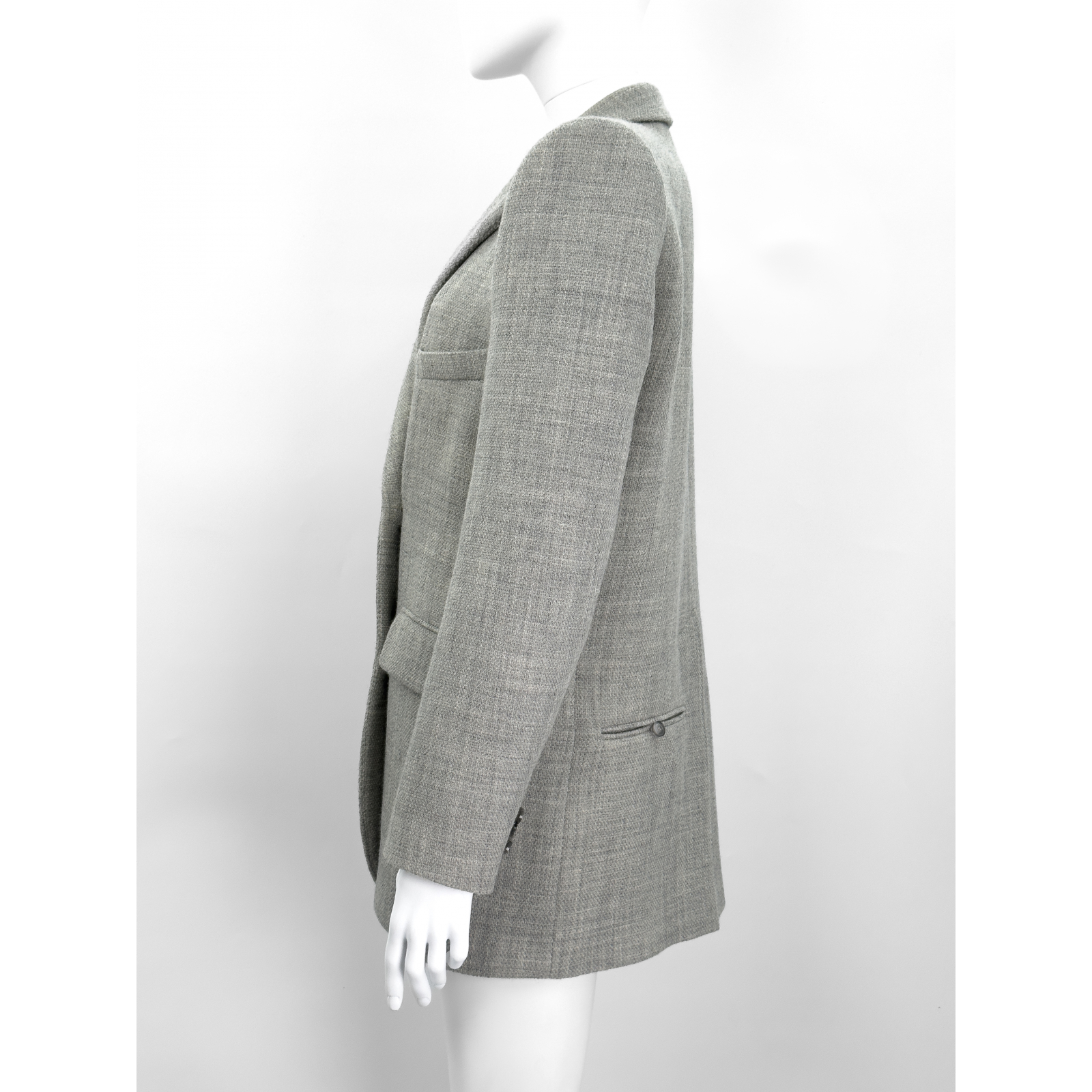 "Szara marynarka, prosty, dłuższy krój, oversize, duże poduszki na ramionach, zapinana na dwa logowane guzki, głęboki dekolt w szpic, szpiczasty kołnierz, proste rękawy, dwie kieszenie z klapami po bokach, mankiety ozdobione trzema guzikami, rozporek, imitacja kieszeni z tyłu, używana. Stan dobry, skulkowany materiał na podszewce. Rozmiar z metki 34. Skład: 82% wiskoza, 16% nylon, 2% elastan; podszewka: 58% wiskoza, 35% nylon, 10% jedwab. Wymiary: szerokość mierzona od pachy do pachy 54cm, długość całkowita 81cm."