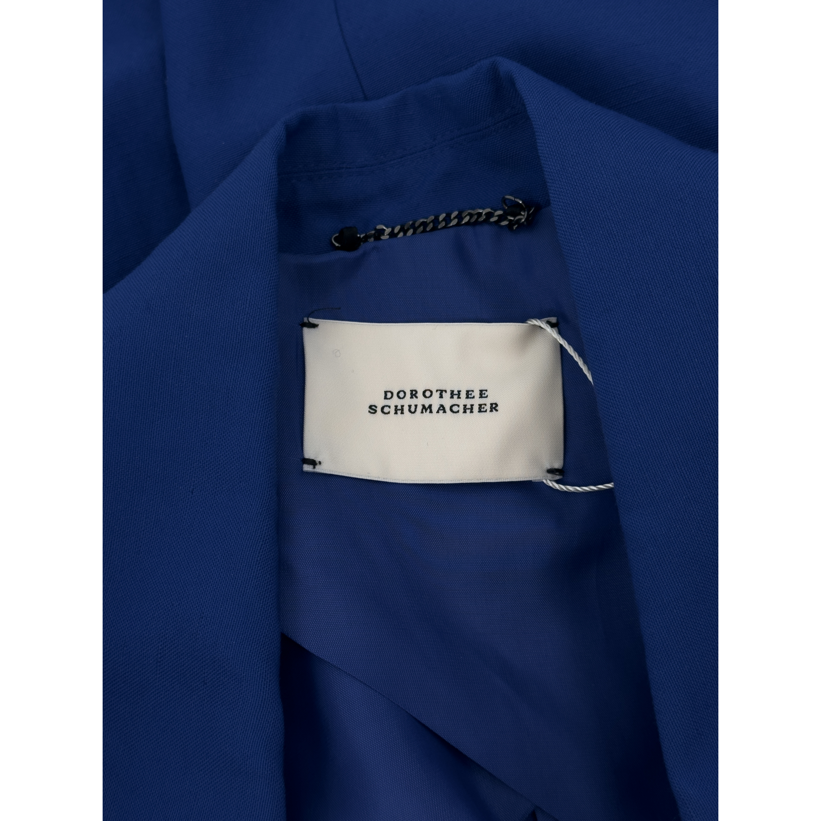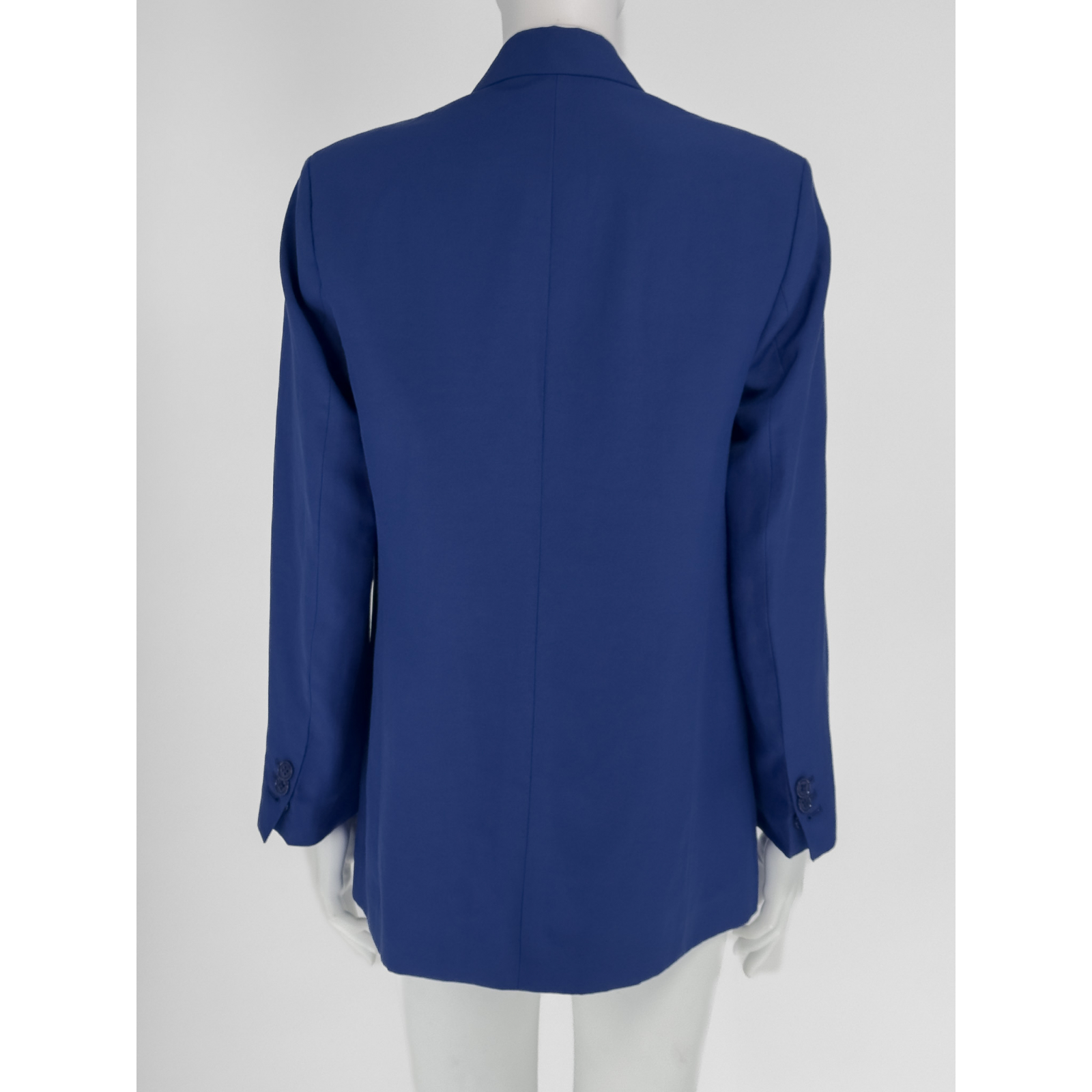 "Kobaltowa dwurzędowa marynarka, zapinana na granatowe guziki, prosty krój, częściowa podszewka w górnej części oraz w rękawach, dwie kryte kieszenie po bokach, poduszki na ramionach. Brak metki z rozmiarem oraz składem. Rozmiarowo wypada jak L. Wymiary: szerokość mierzona od pachy do pachy 52cm, długość całkowita 73cm."