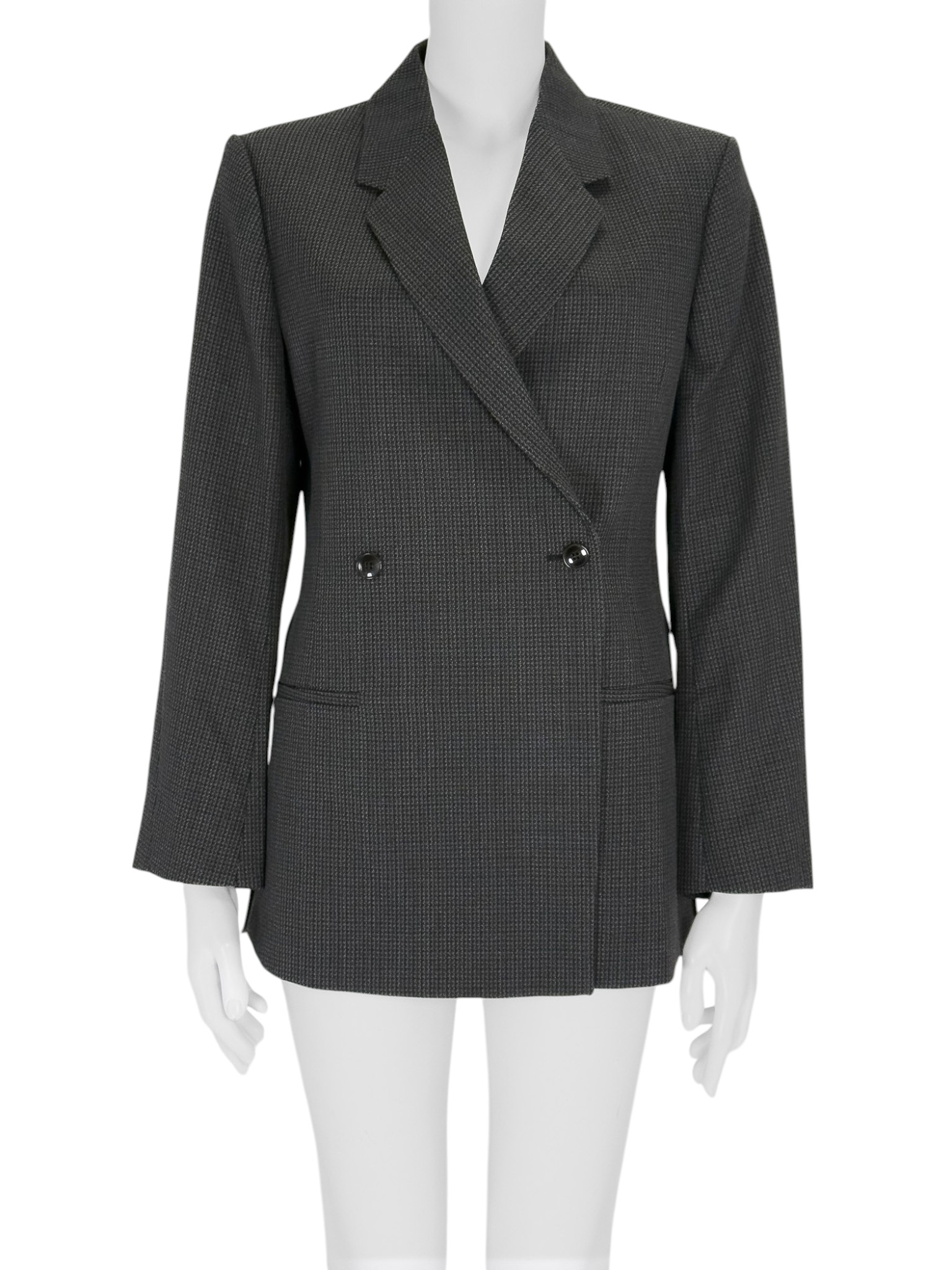 "Szaro-czarna wełniana marynarka w pepitkę, krój oversize, dekolt w serek, dwurzędowa, delikatne poduszki na ramionach, dwie kryte zaszyte kieszenie po bokach, dwa rozcięcia, czarna podszewka. Rozmiar z metki XXS. Skład: 100% wełna dziewicza; podszewka: 50% acetat, 50% wiskoza. Wymiary: szerokość mierzona od pachy do pachy 49cm, długość całkowita 73cm."
