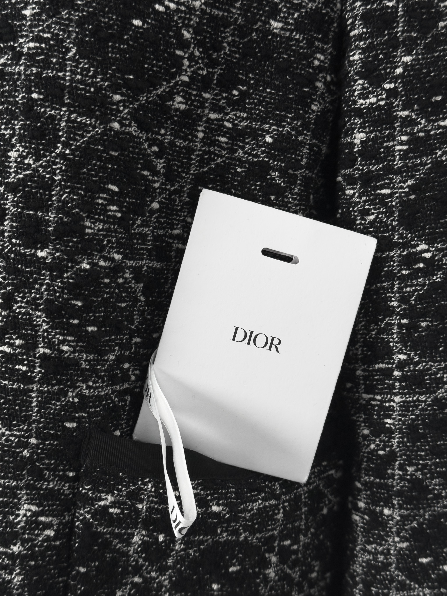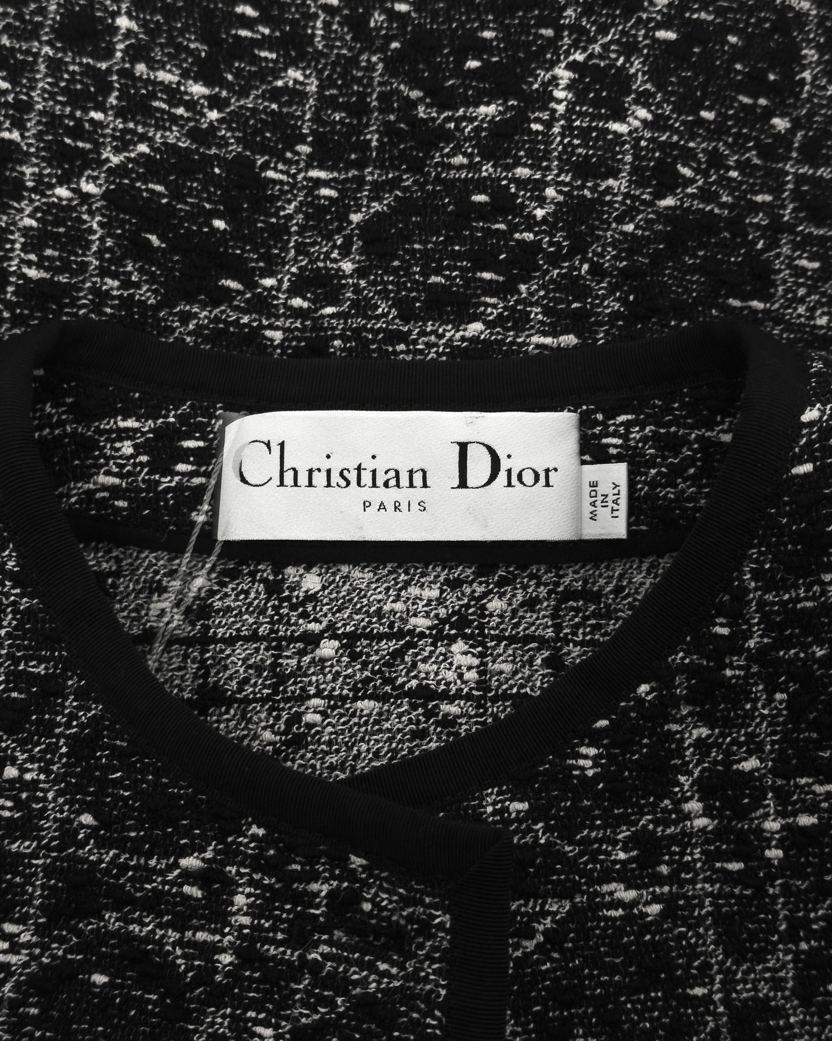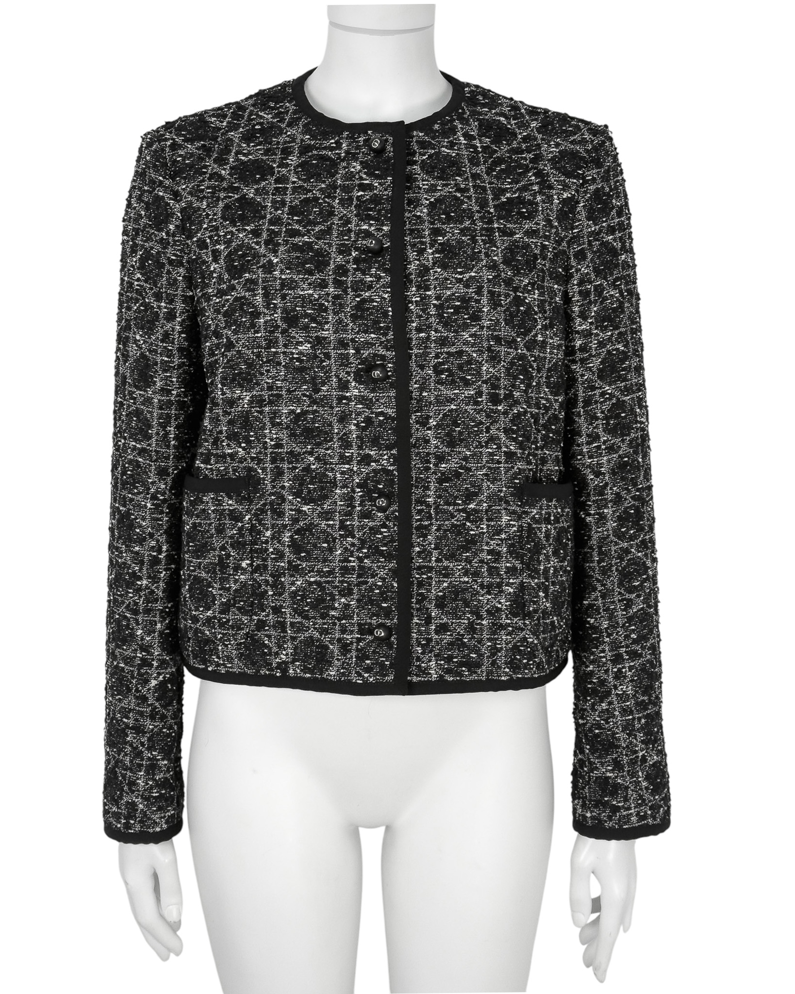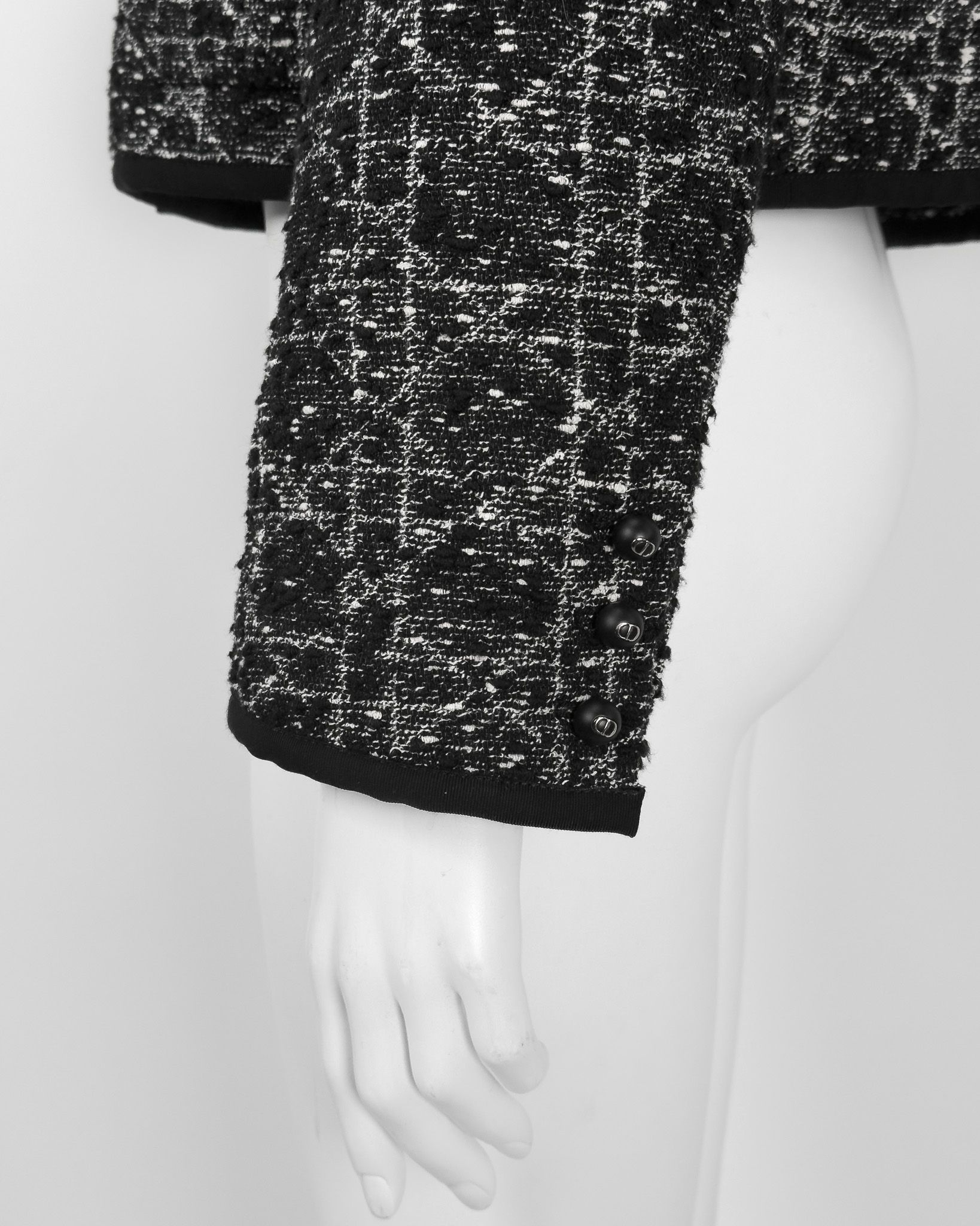 "Czarno-biała tweedowa marynarka z czarną lamówką, pudełkowy krój, kwadratowe kieszenie z przodu, okrągłe guziki z logo marki, zaokrąglony dekolt. Stan idealny, z metką. Rozmiar z metki IT 46. Skład: 54% bawełna, 27% akryl, 19% poliamid. Wymiary: szerokość mierzona od pachy do pachy 52cm, długość całkowita 53cm."