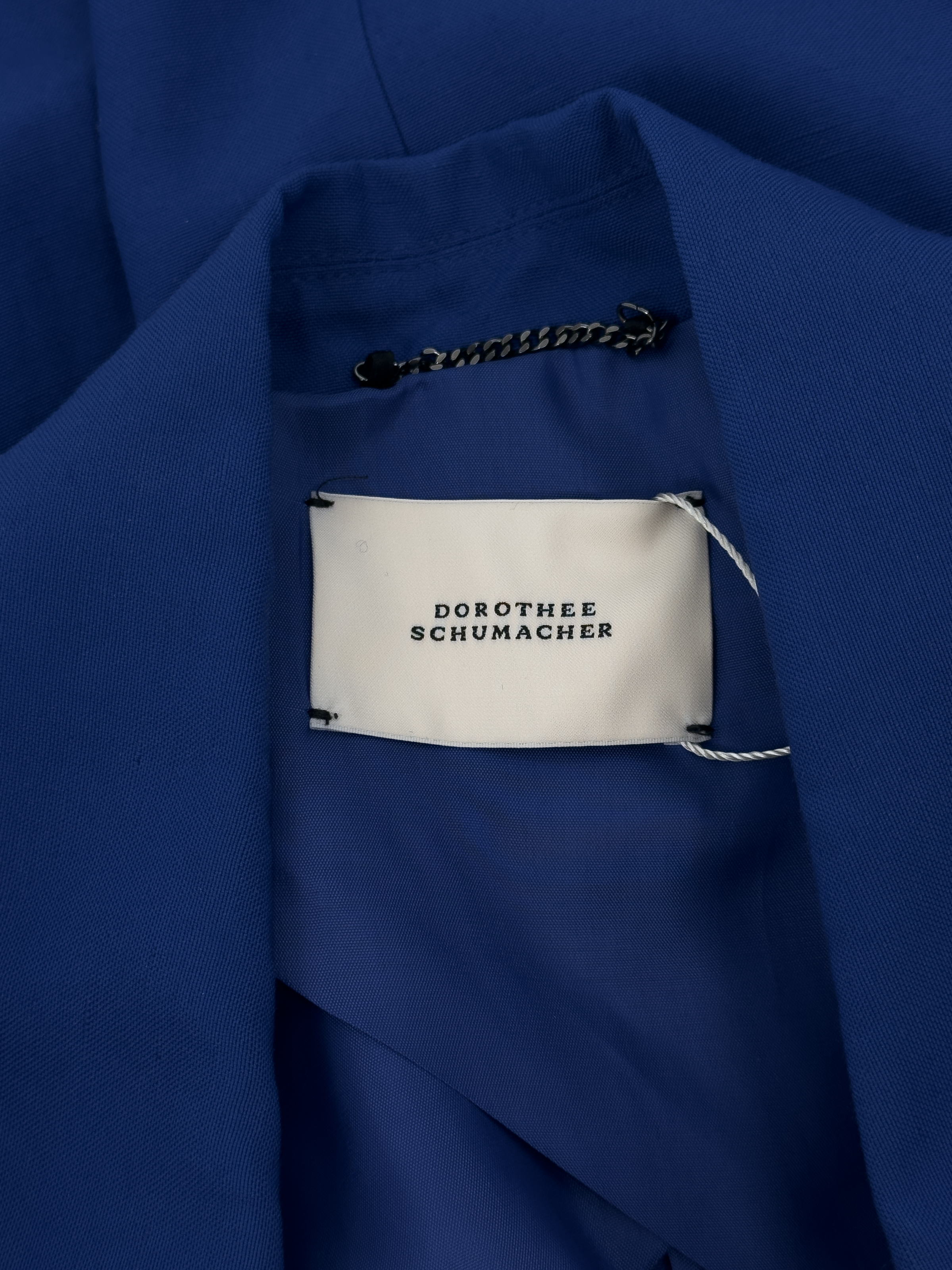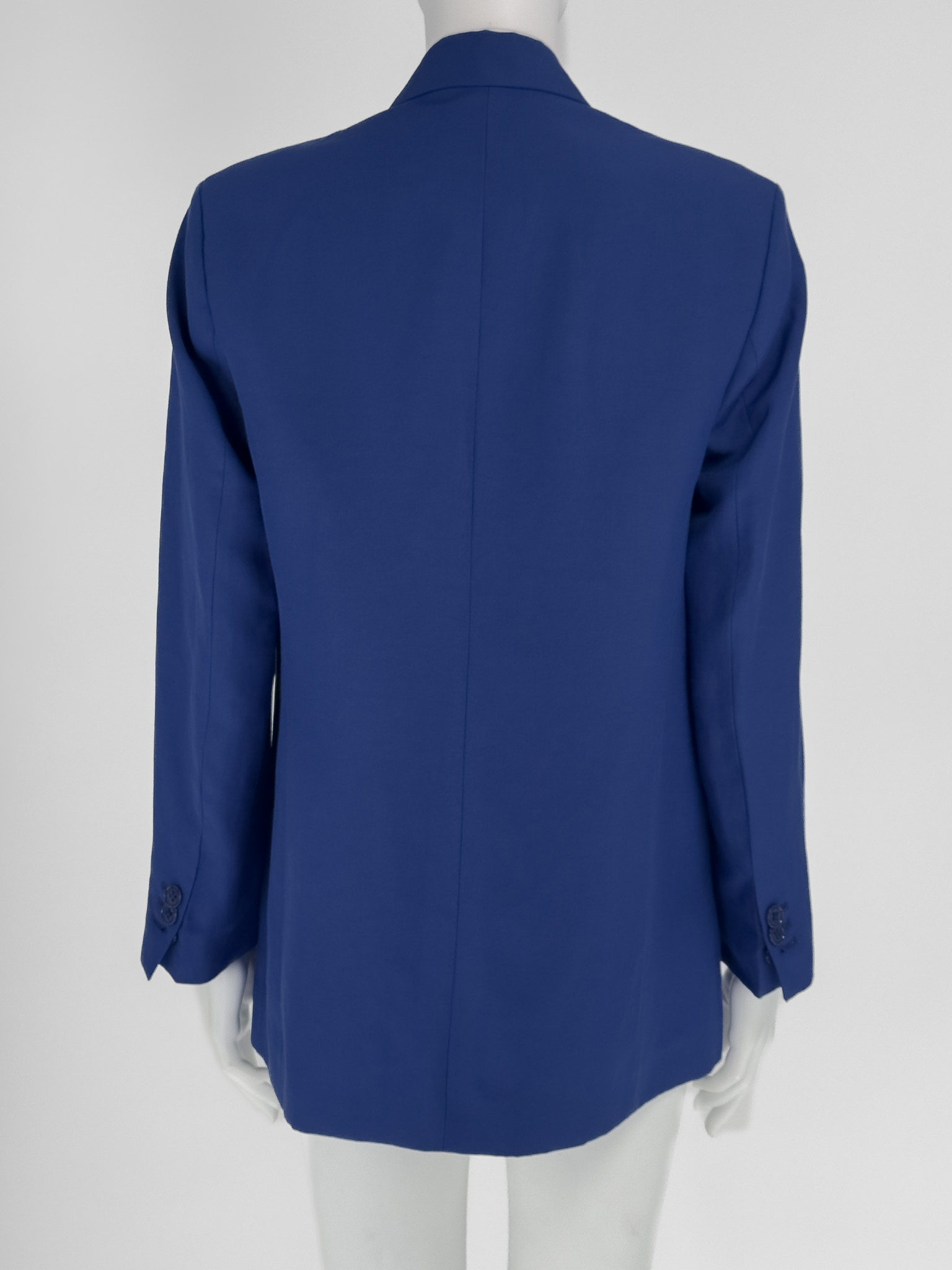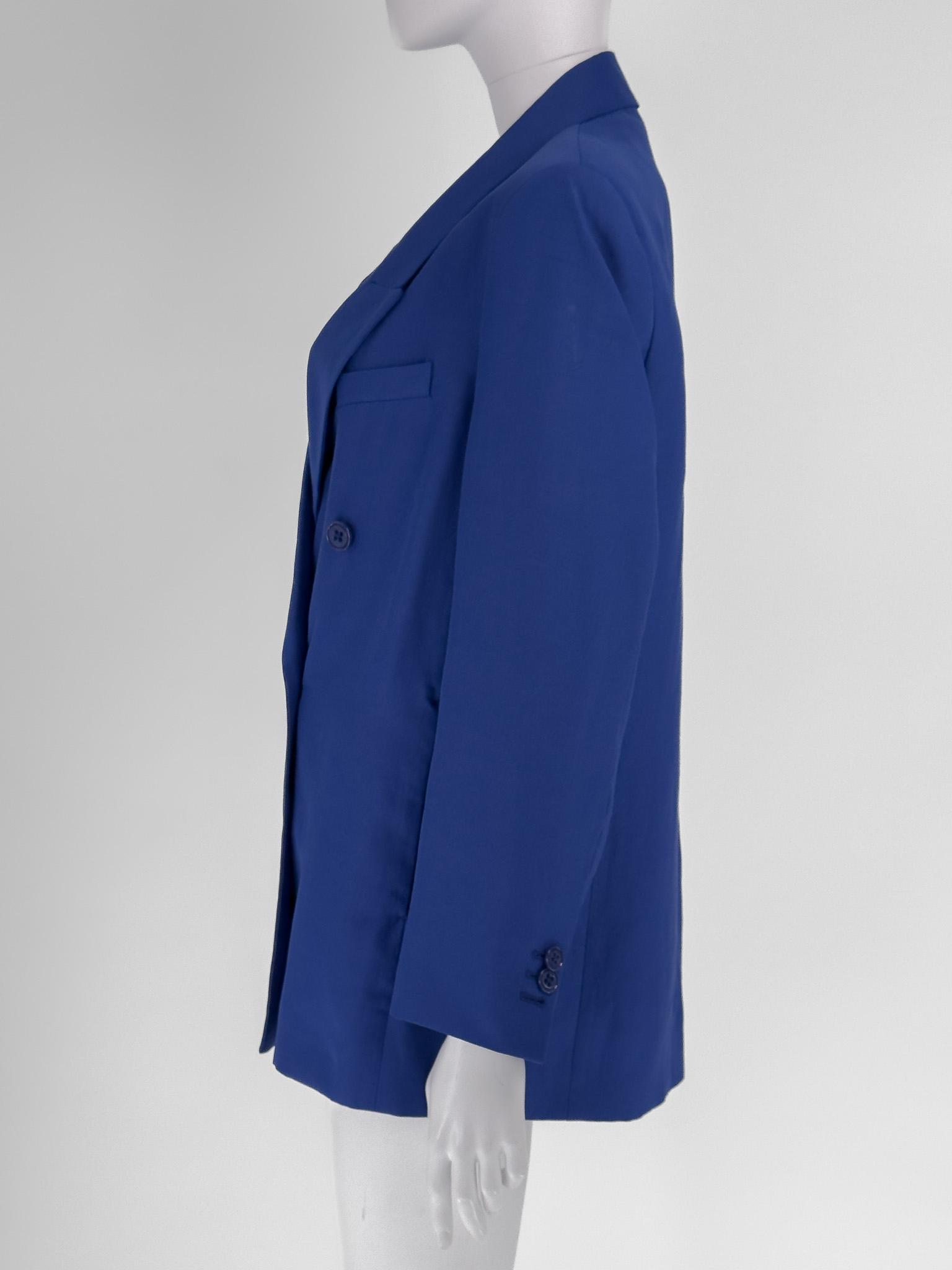 "Kobaltowa dwurzędowa marynarka, zapinana na granatowe guziki, prosty krój, częściowa podszewka w górnej części oraz w rękawach, dwie kryte kieszenie po bokach, poduszki na ramionach. Brak metki z rozmiarem oraz składem. Rozmiarowo wypada jak L. Wymiary: szerokość mierzona od pachy do pachy 52cm, długość całkowita 73cm."