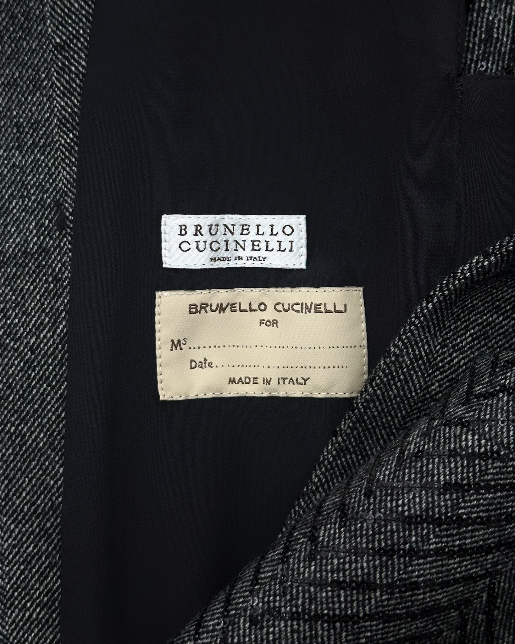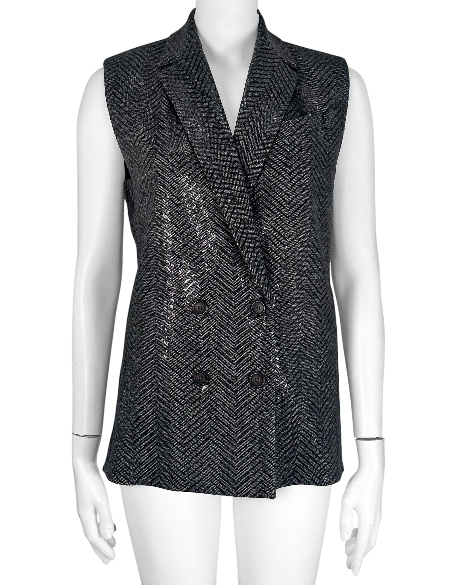 "Prosta marynarkowa kamizelka z cekinami w jodełkę, jedwabna podszewka, zapinana na dwurzędowe guziki, rozmiar 40. Stan - jak nowa.