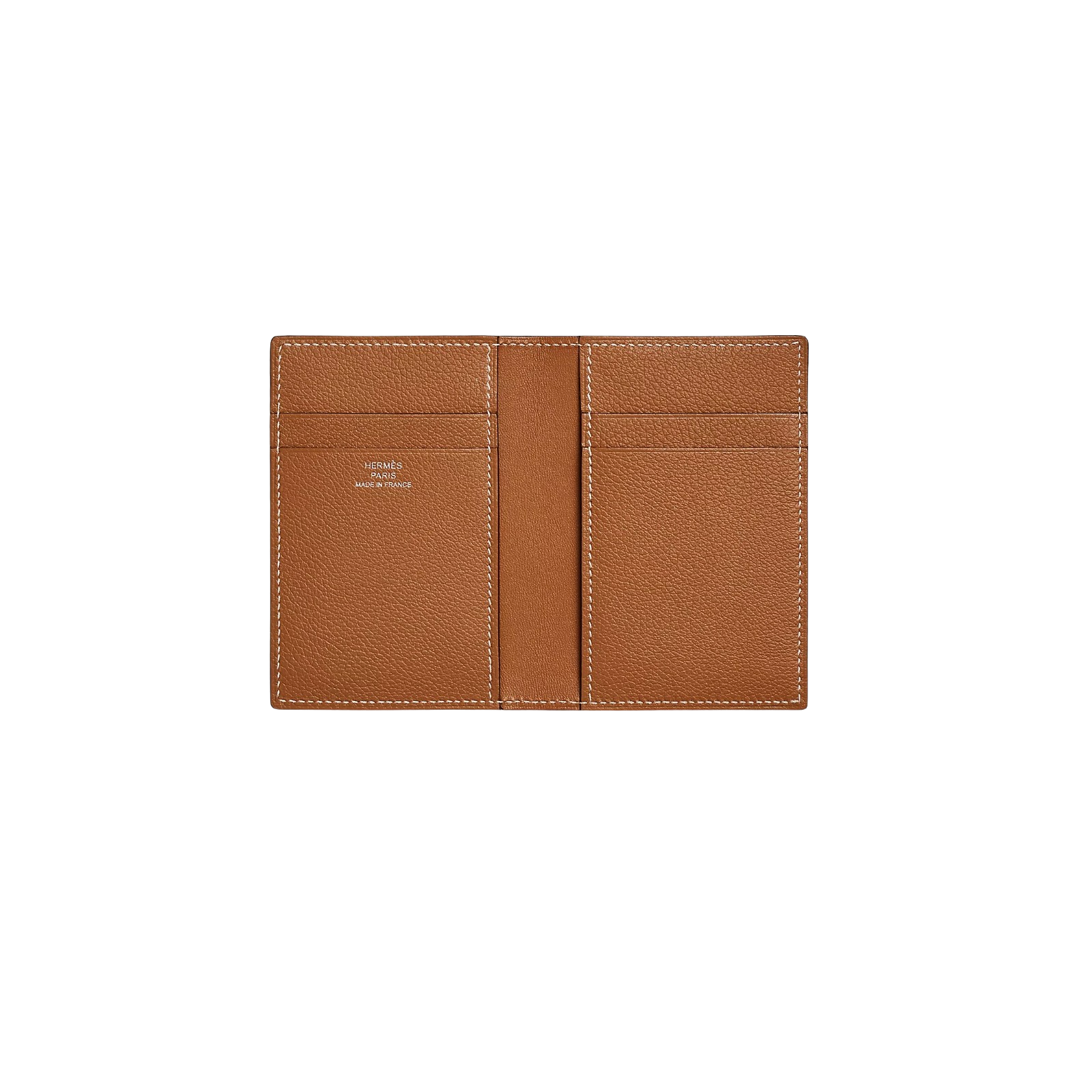"camelowe etui na karty, prostokątne, w środku przegrody, obszyty białą nitką, nowe pudełko w zestawie. Wymiary: 10,5 cm x 7 cm."