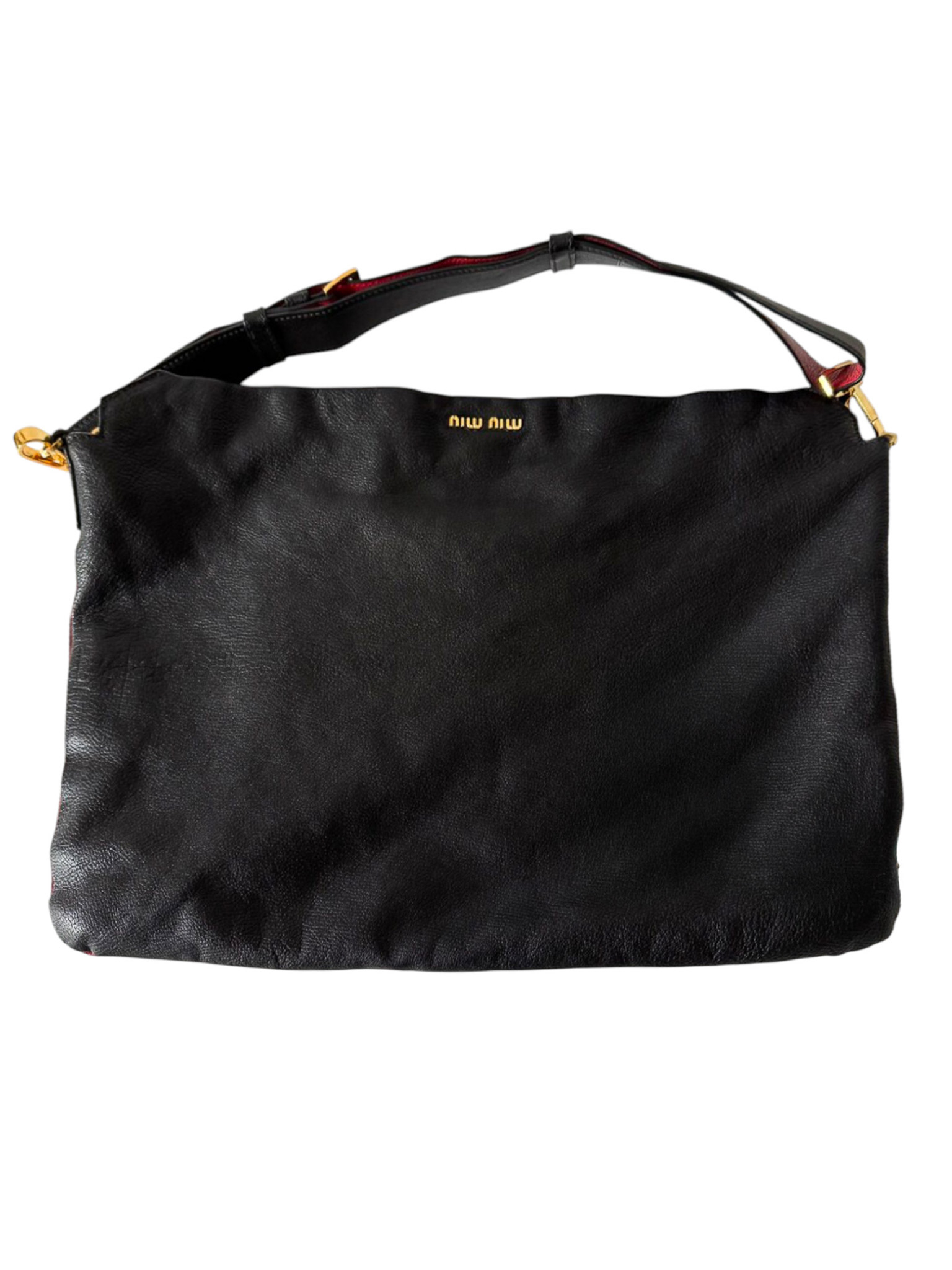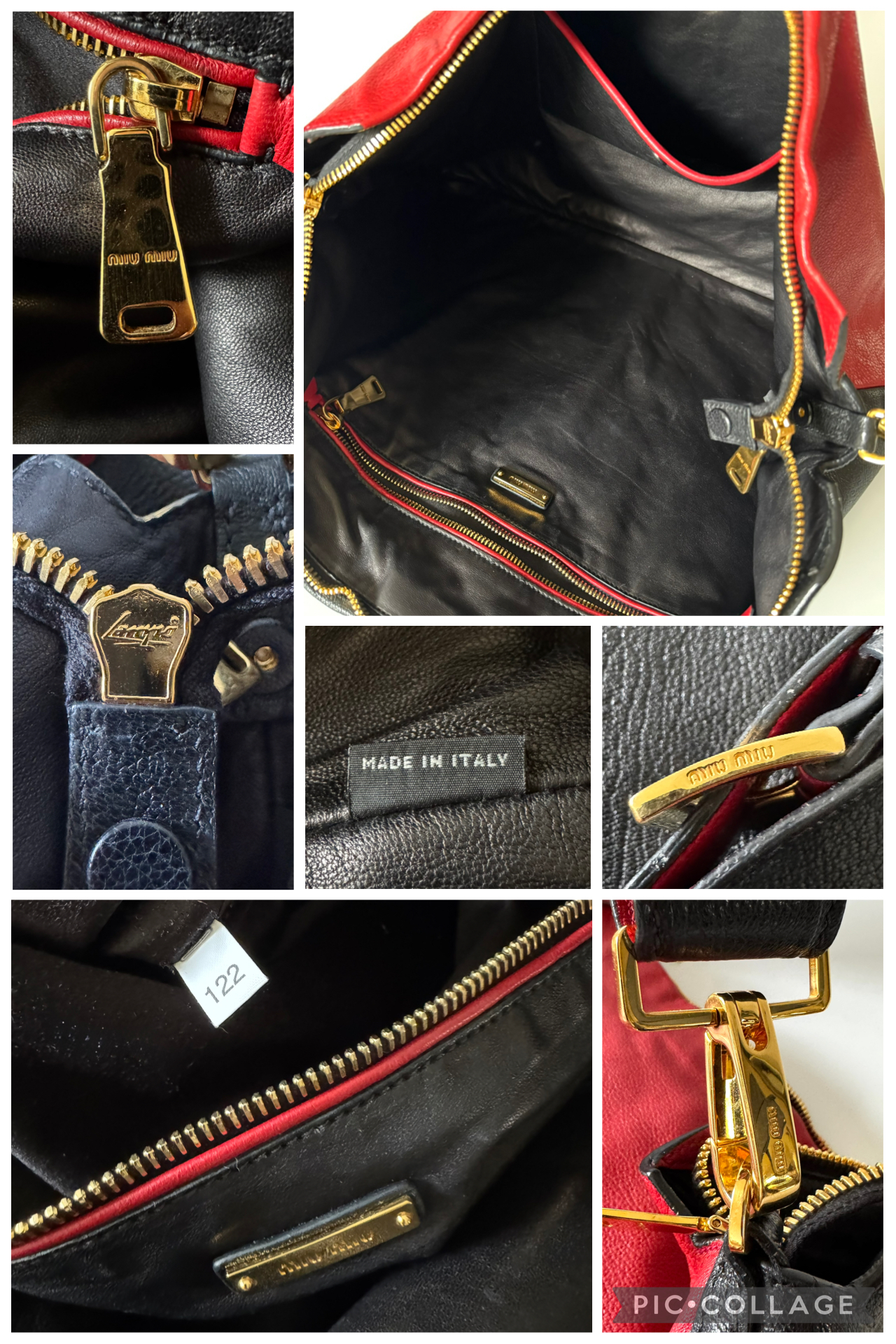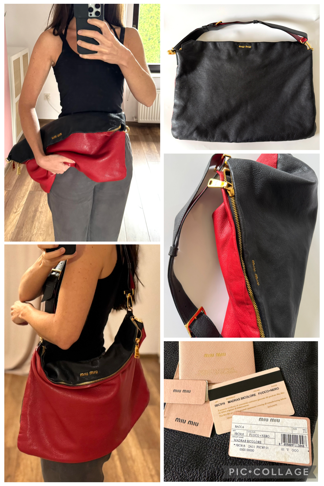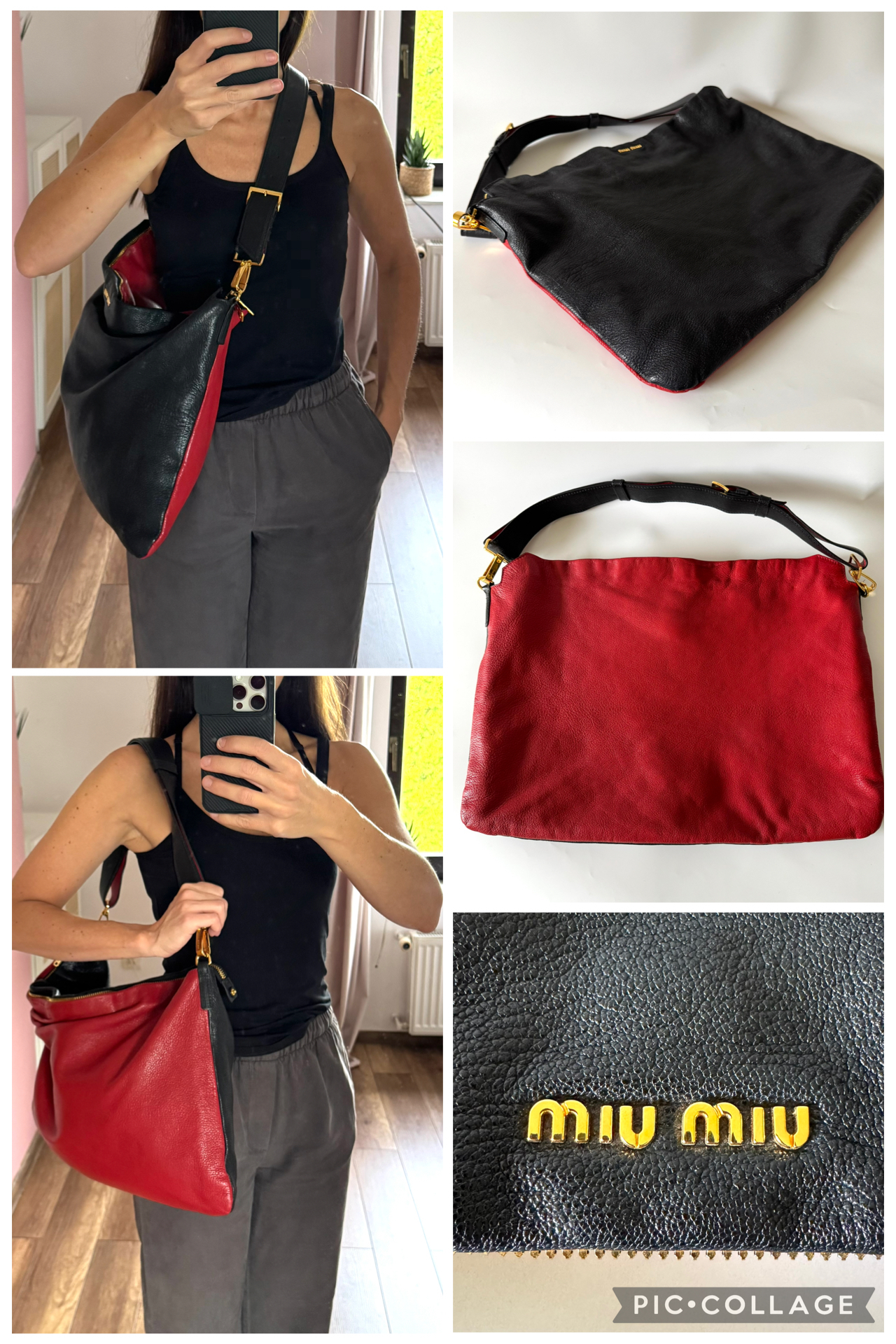 ▪️Wszechstronna i praktyczna torebka z linii Cloud marki Miu Miu, wykonana z miękkiej czarno-czerwonej skóry koziej ze złotymi okuciami.