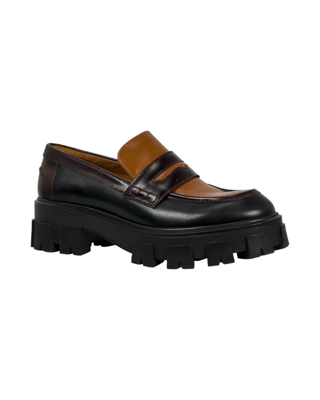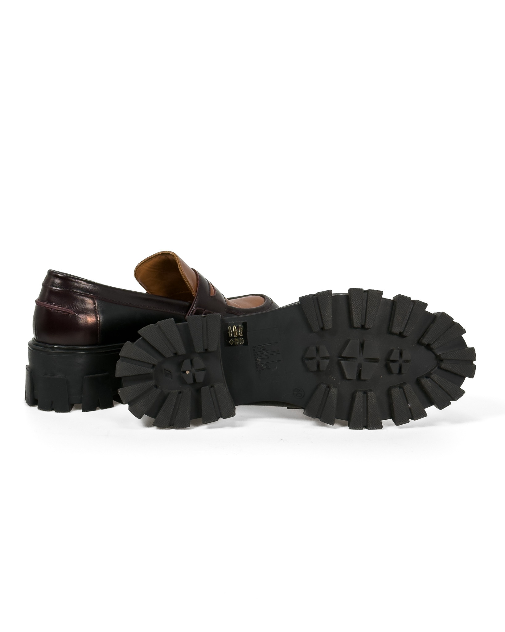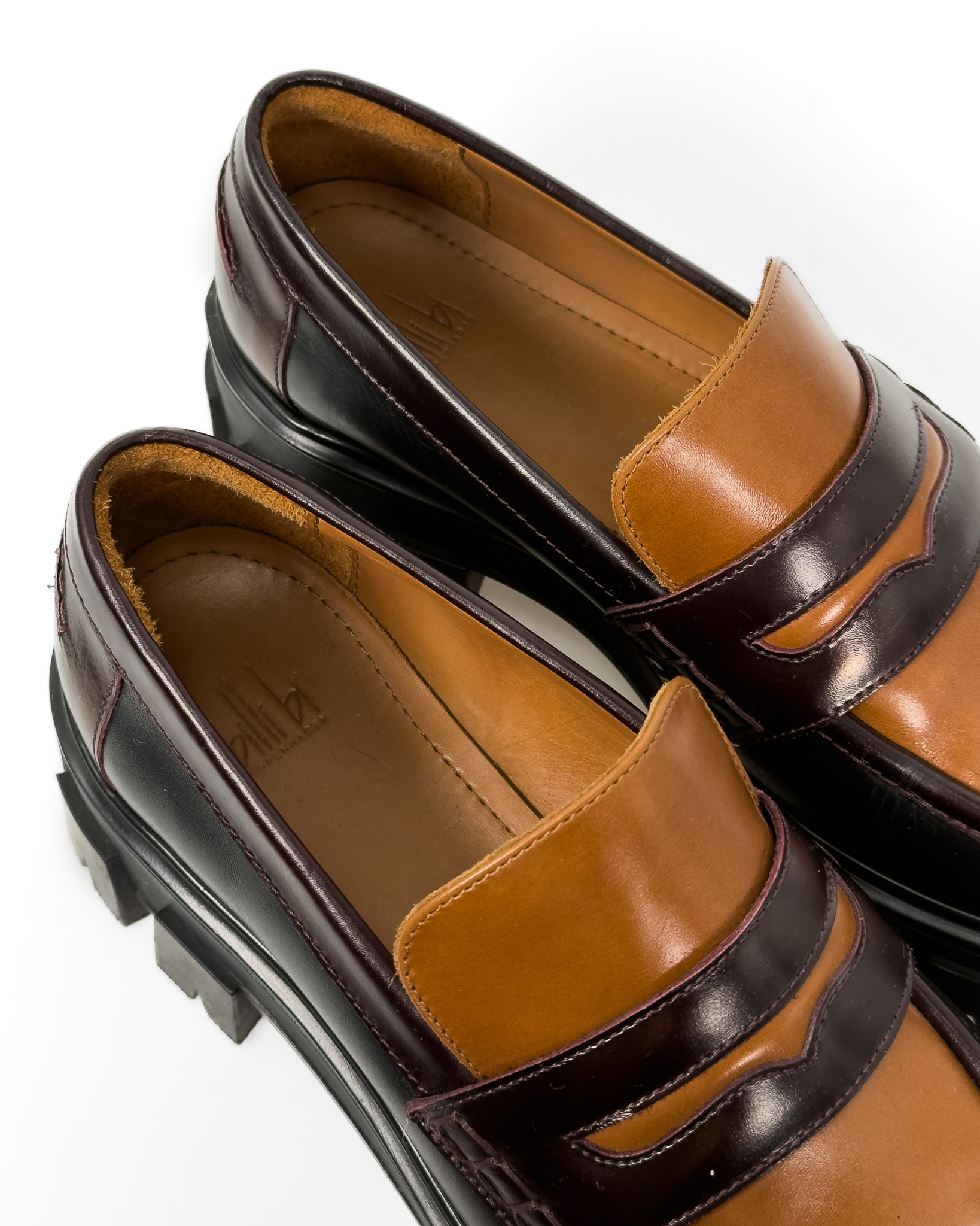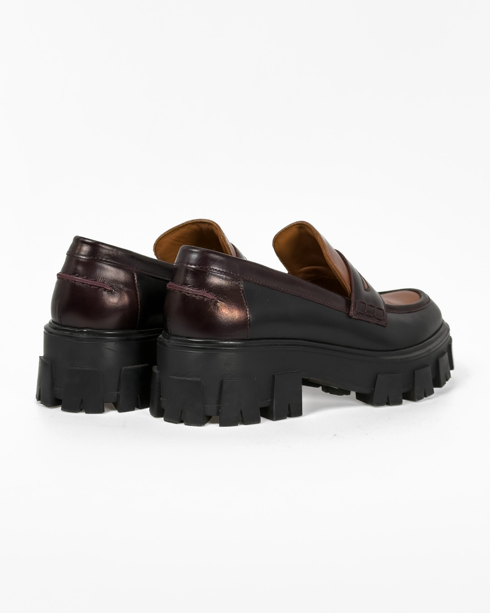 "Czarno-kamelowe z bordowym wykończeniem mokasyny na traperowej podeszwie 5,5cm. Stan jak nowe, użyte raz. Rozmiar 40."