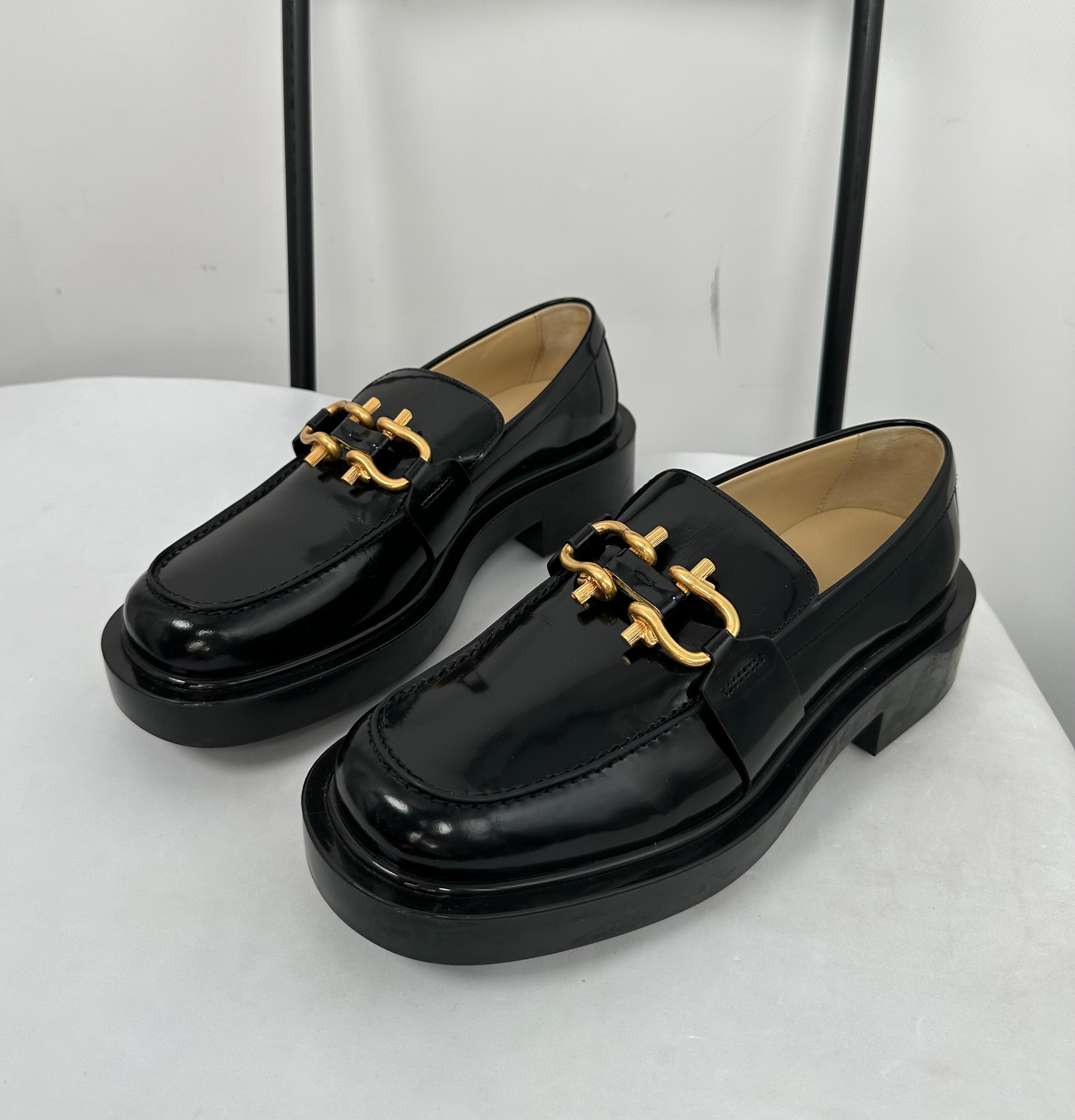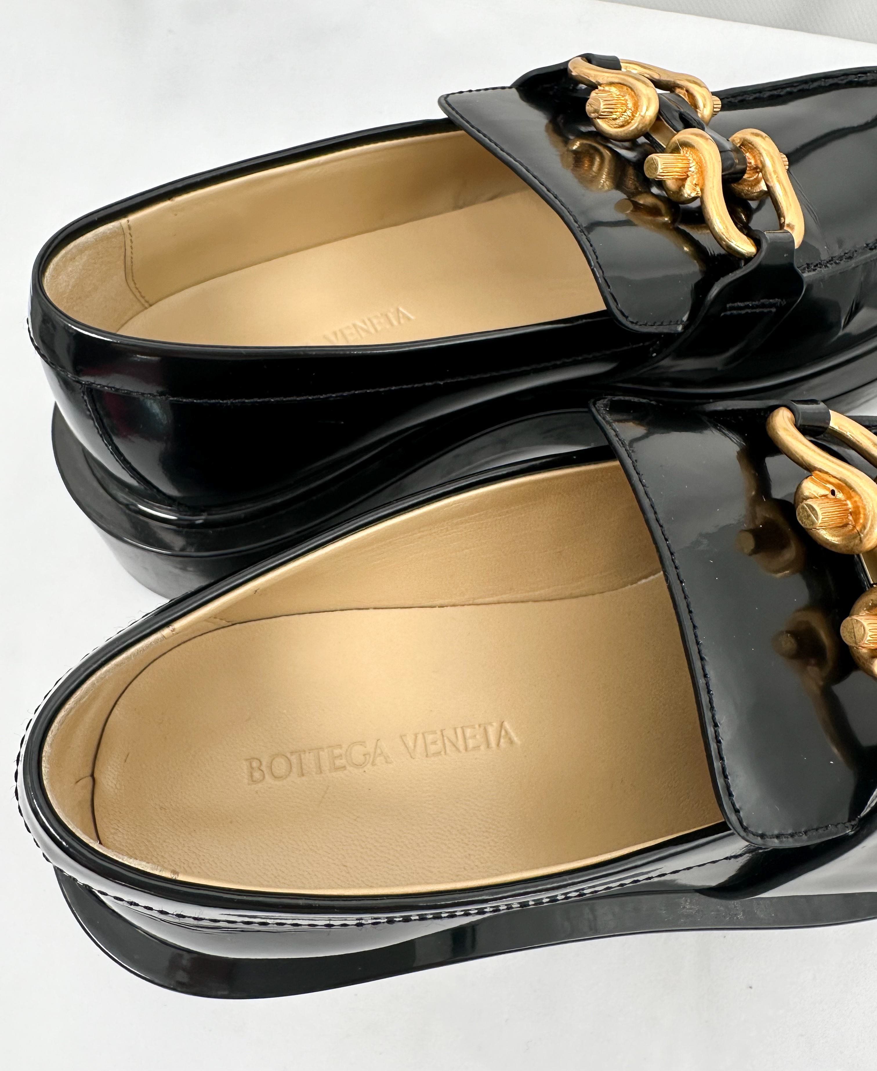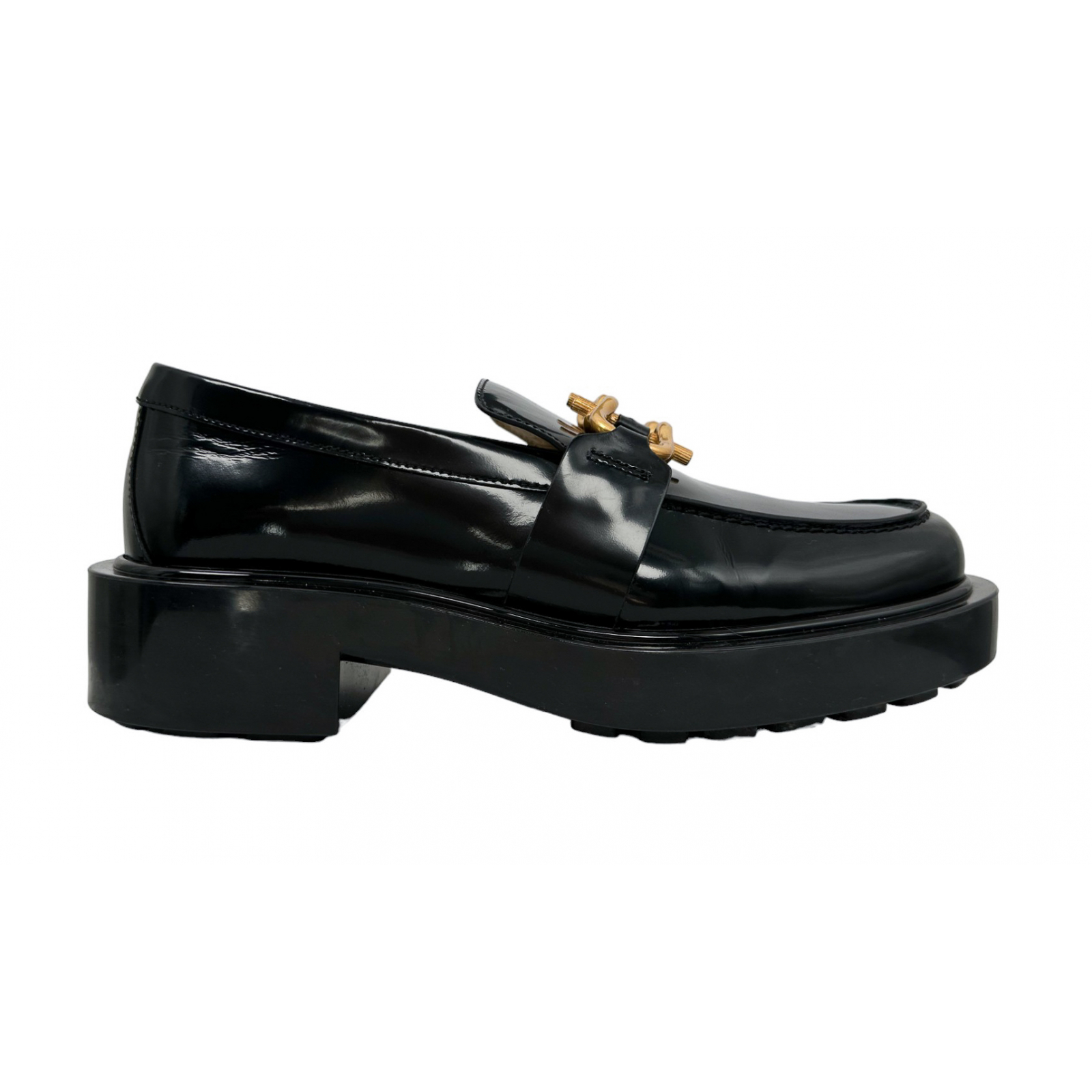 "Czarne mokasyny wykonane z lakierowanej skóry, gumowa podeszwa, ścięte noski, obcas klocek, złota matowa ozdoba w przedniej części, wsuwane, wycięcia po bokach, w zestawie z pudełkiem oraz workami przeciwkurzowymi, używane. Stan dobry, przetarcia oraz delikatne zagniecenia na skórze, ślady użytkowania na podeszwie. Rozmiar 39."