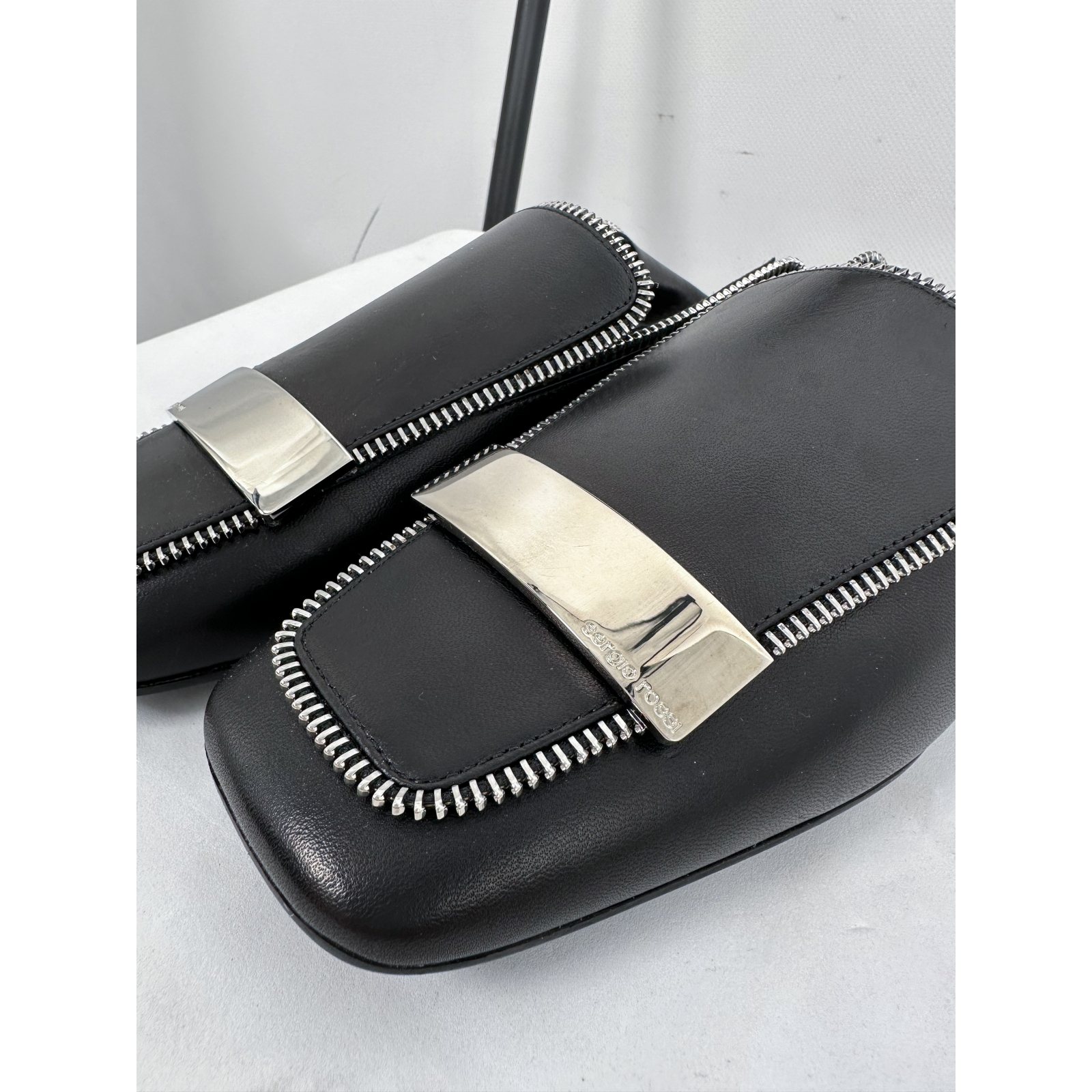 "Czarne mokasyny z wywijaną zapiętką z możliwością noszenia jako klapki, kwadratowe noski, srebrne suwaki wzdłuż przeszyć oraz blaszka z logo, roz. 36,5"