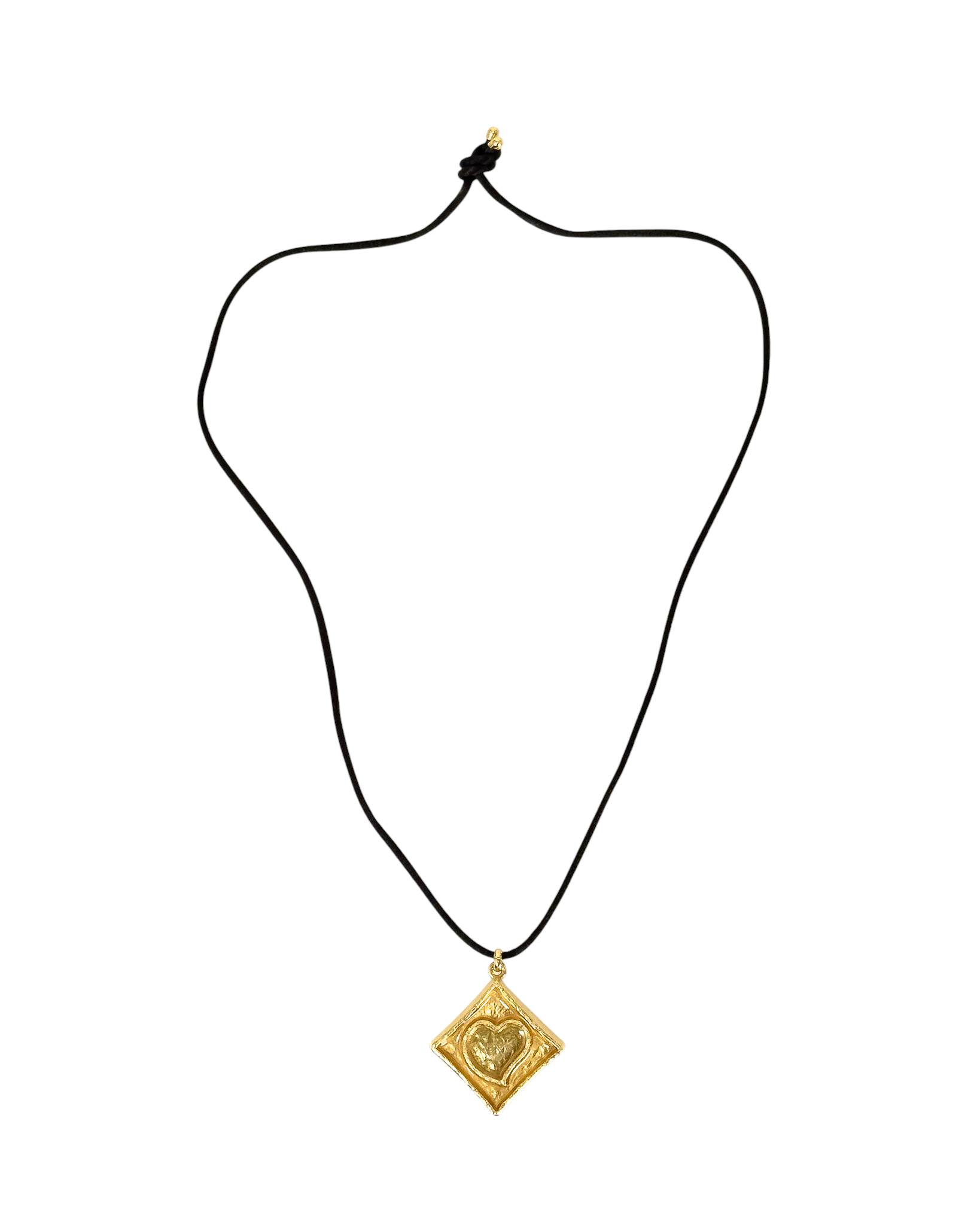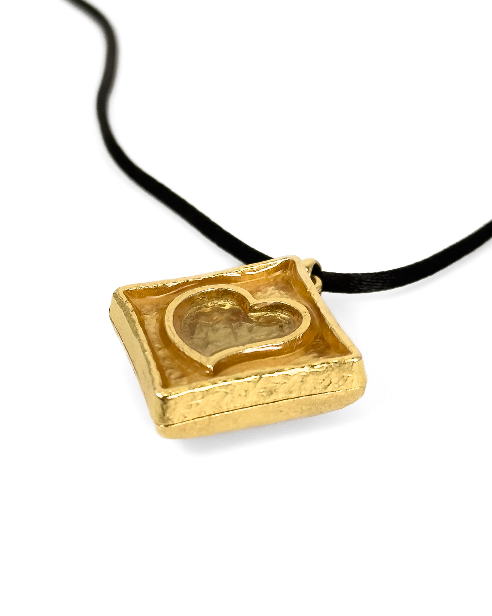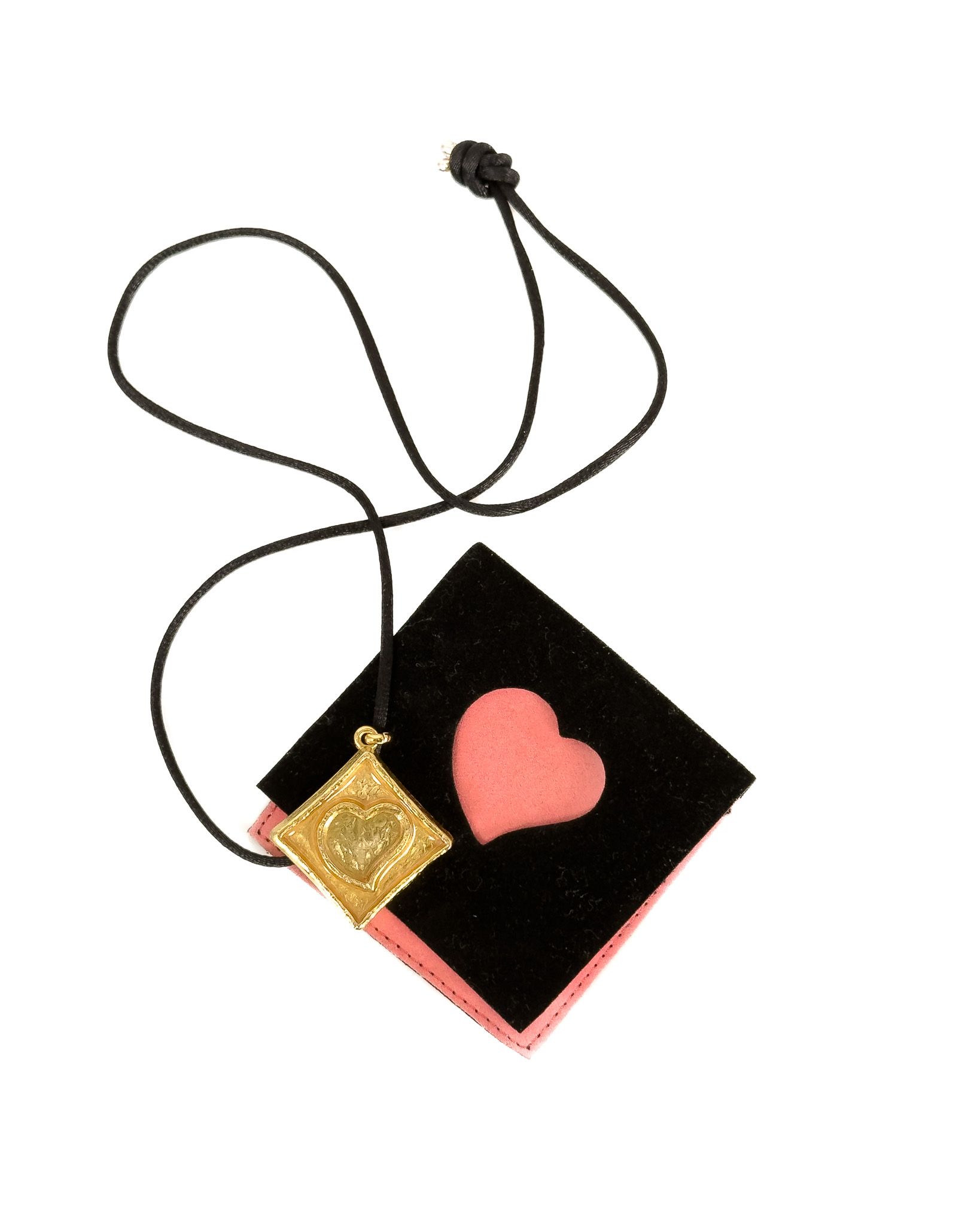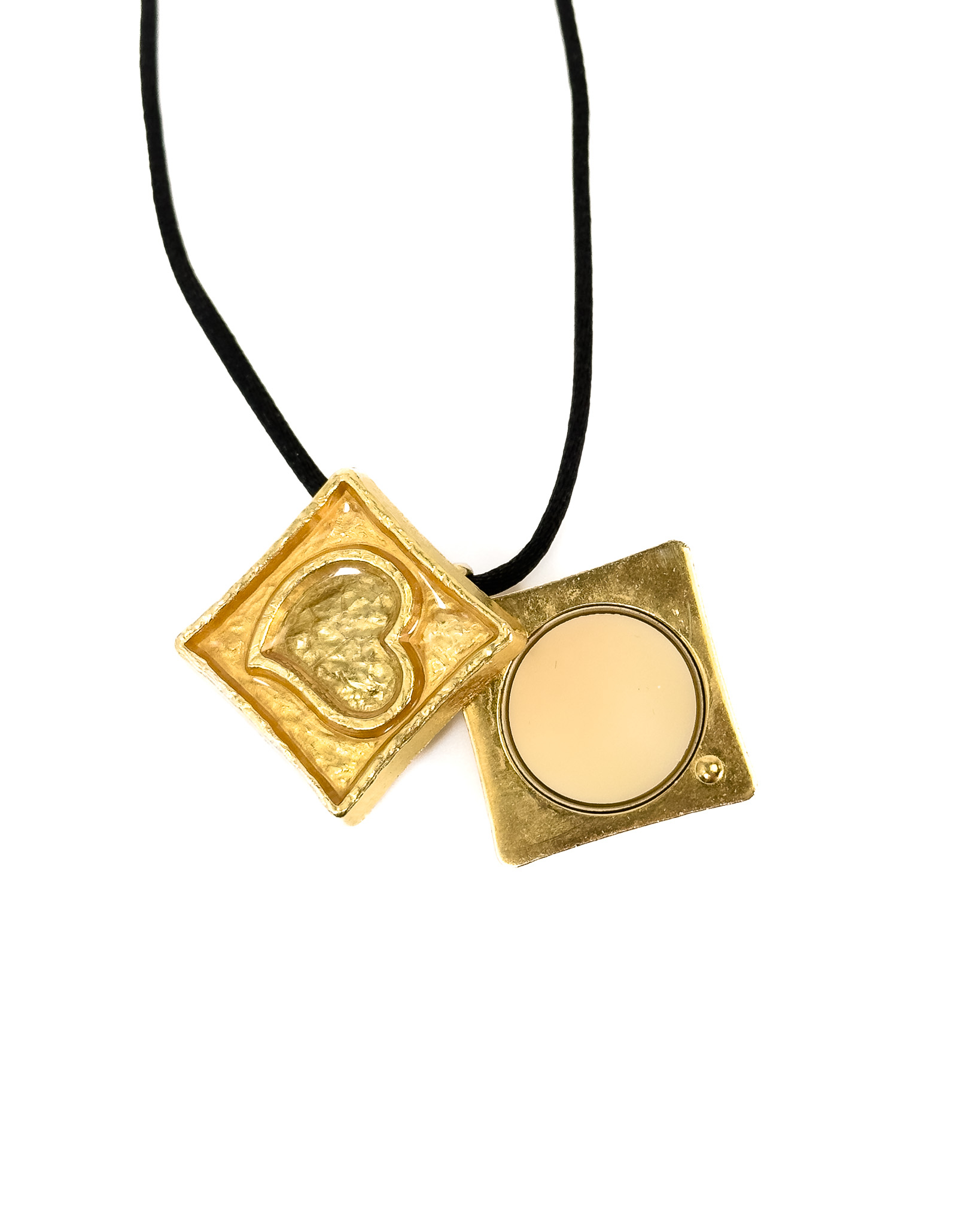 "Czarny naszyjnik ozdobiony złotą kwadratową zawieszką z grafiką serca, na rzemyku, wiązany, w środku zawieszki perfumowany balsam, w zestawie z pokrowcem. Stan bardzo dobry. Wymiary zawieszki: 2,2cm x 2,2 cm."