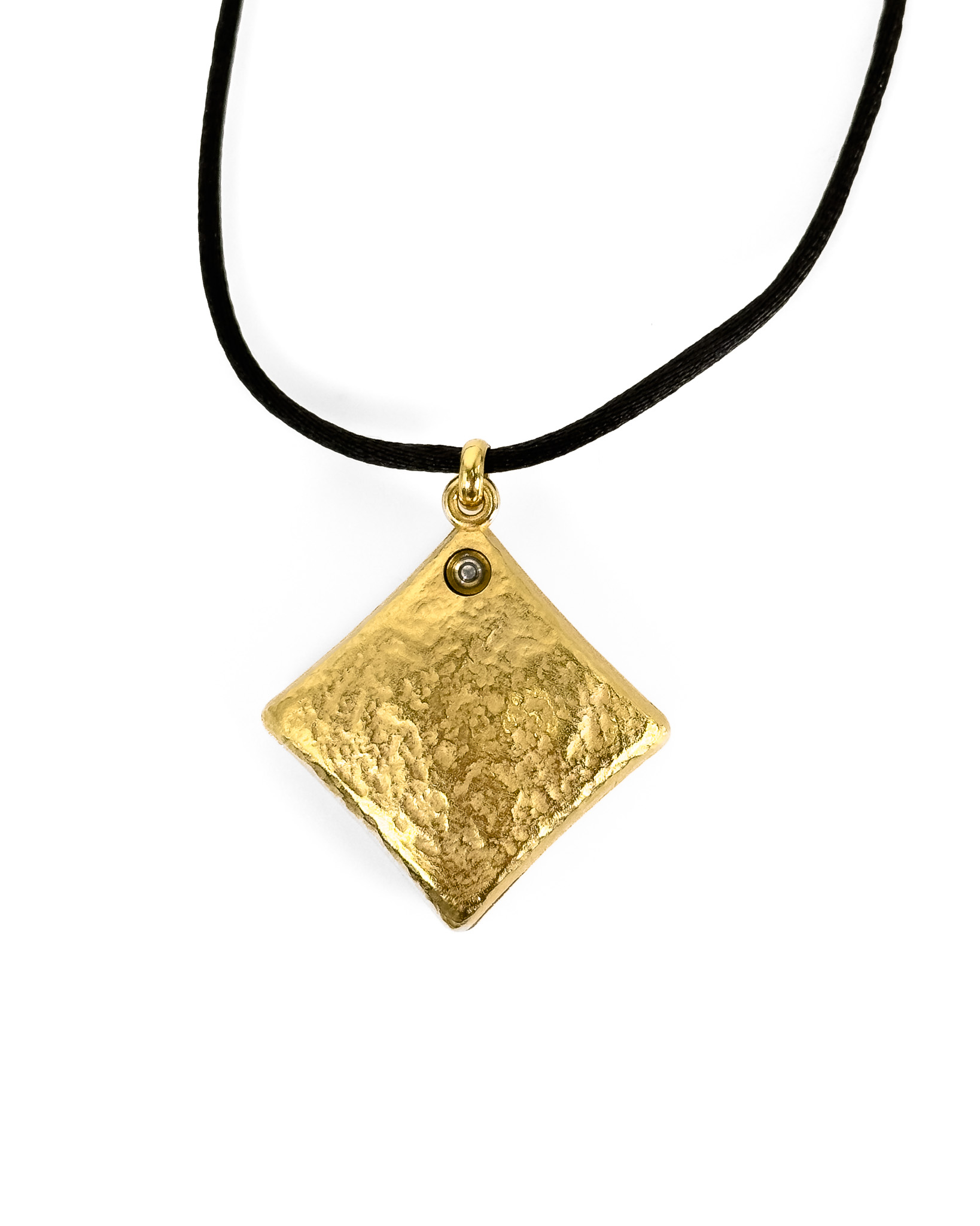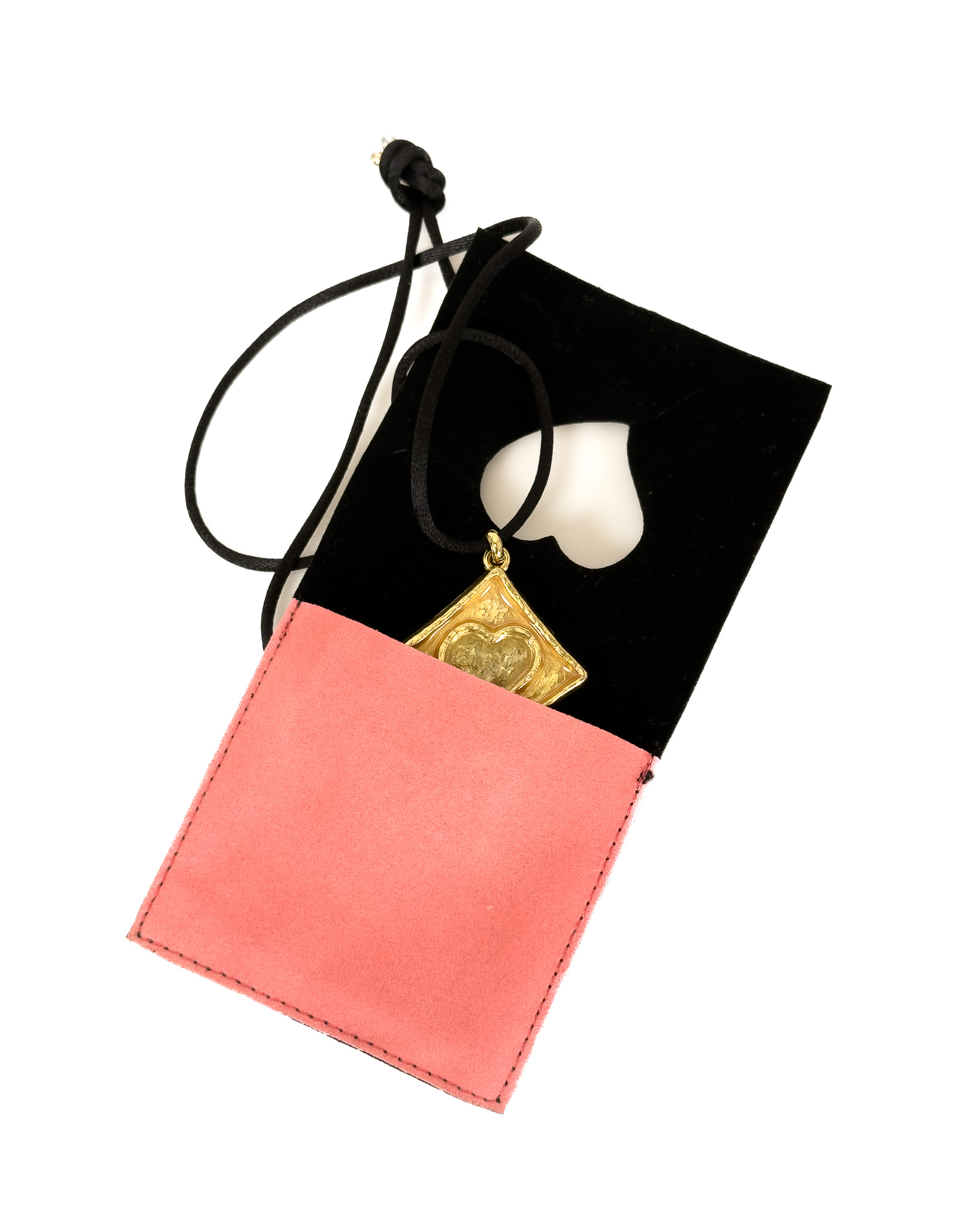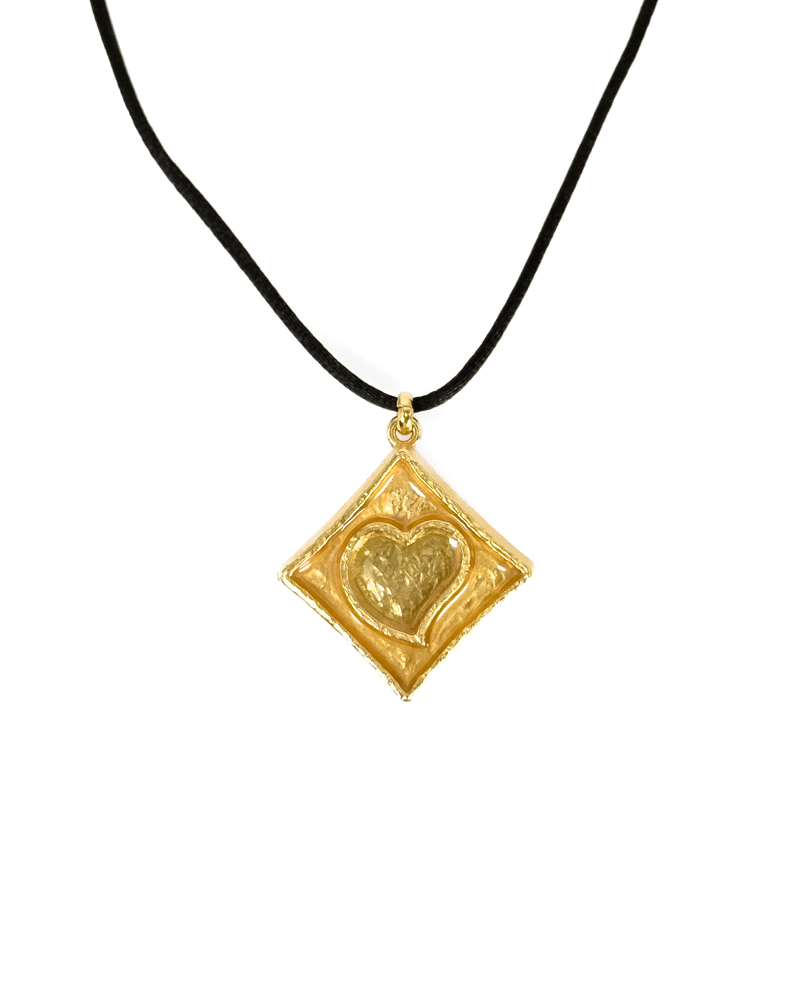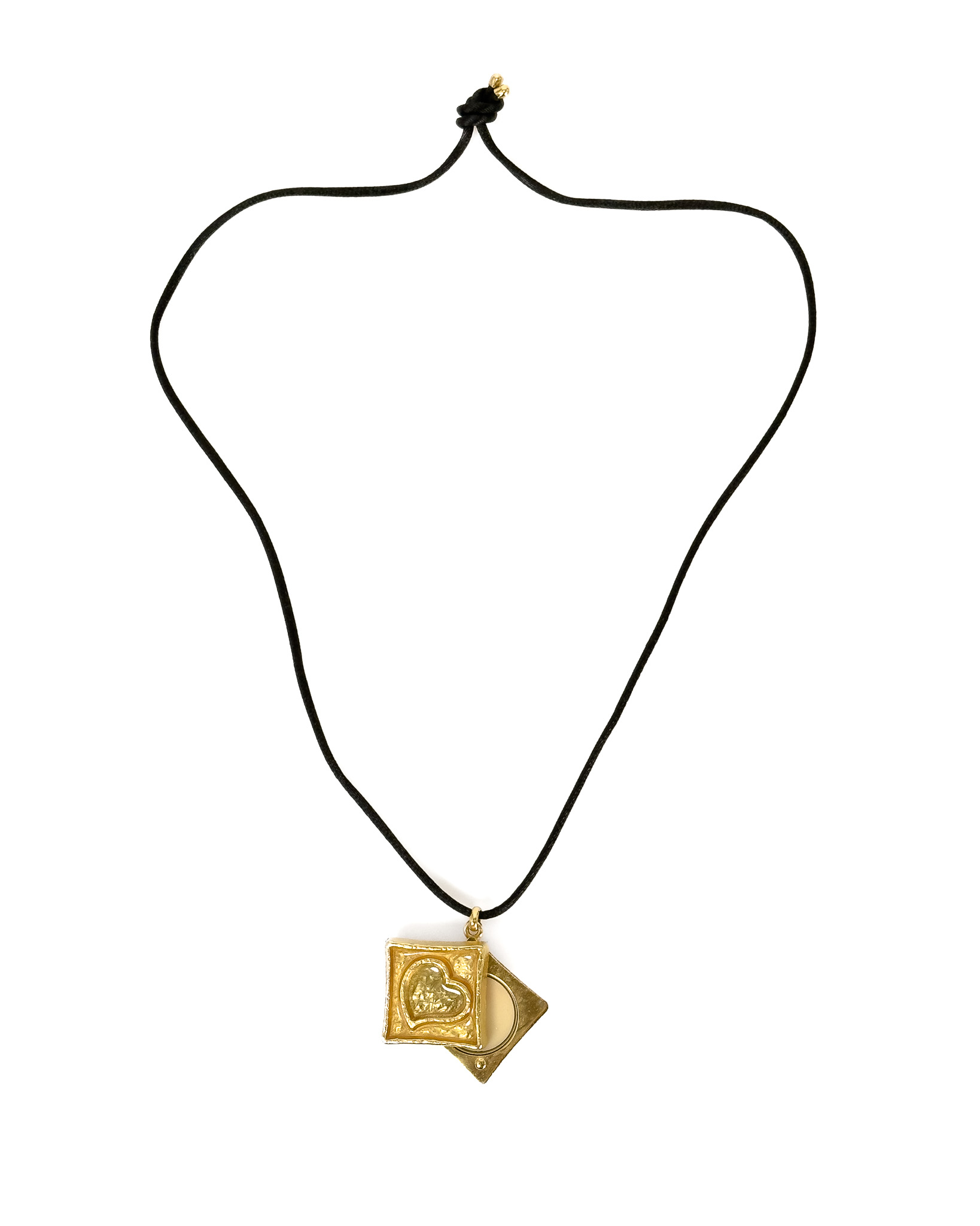 "Czarny naszyjnik ozdobiony złotą kwadratową zawieszką z grafiką serca, na rzemyku, wiązany, w środku zawieszki perfumowany balsam, w zestawie z pokrowcem. Stan bardzo dobry. Wymiary zawieszki: 2,2cm x 2,2 cm."