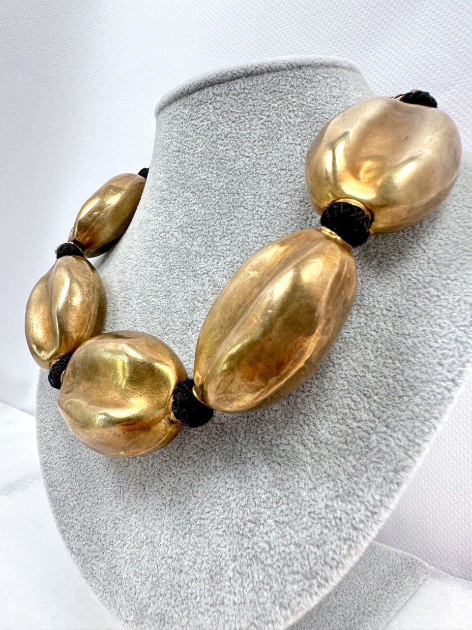 "naszyjnik ze złotymi elementami w kształcie ziaren kawy, z czarnymi rzemykami."